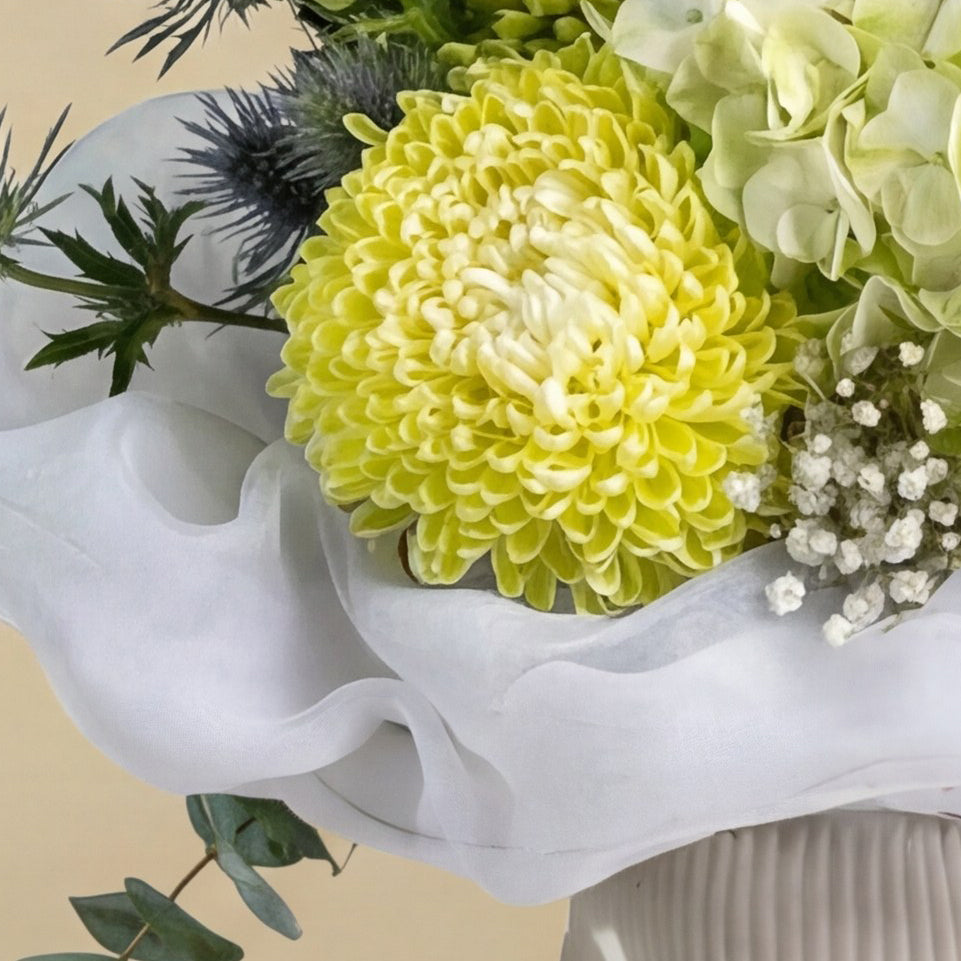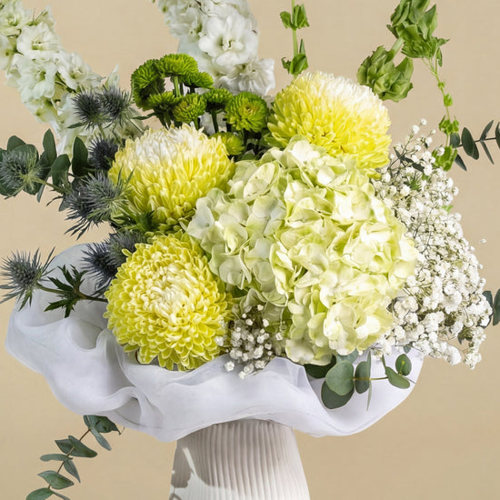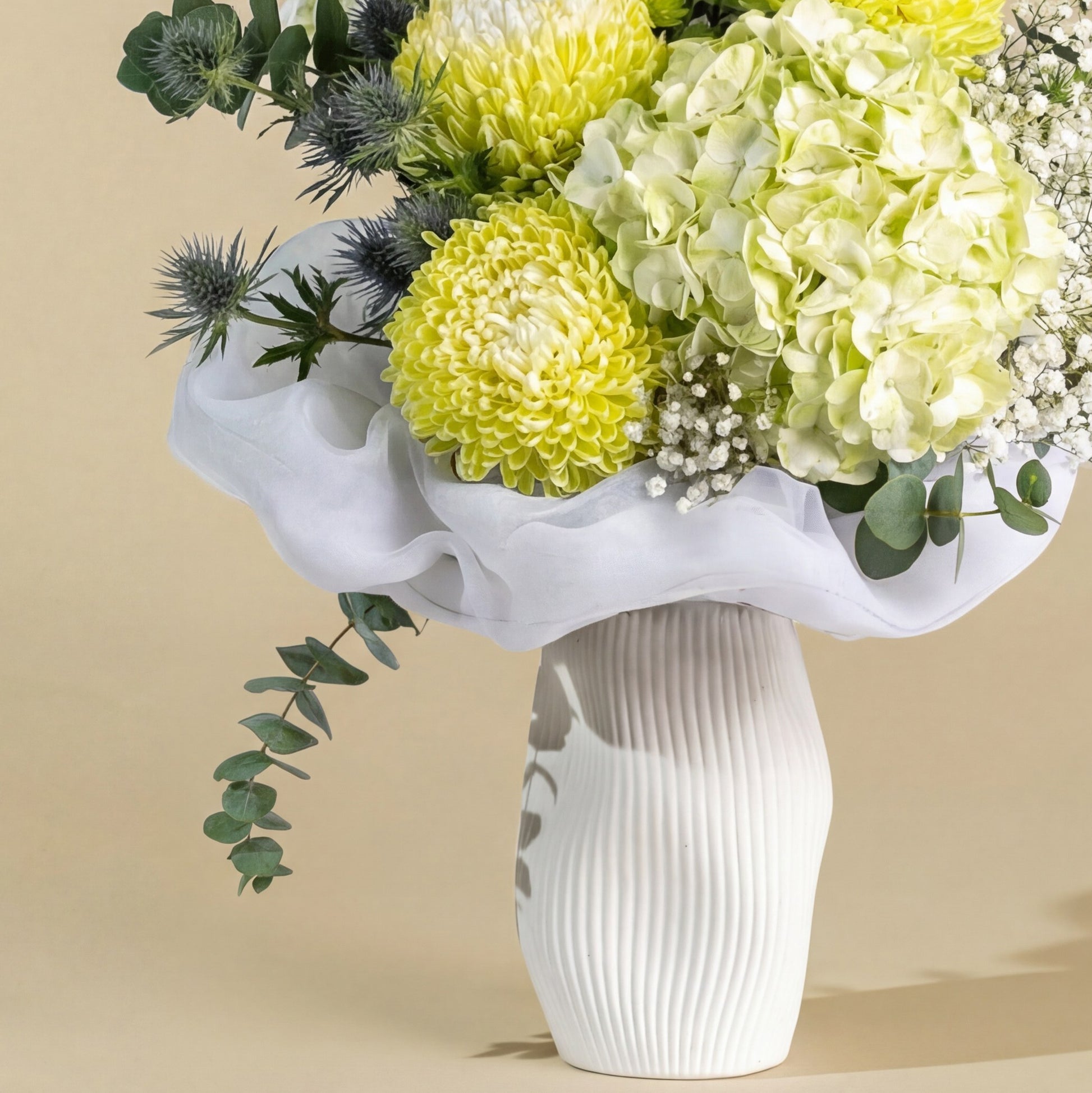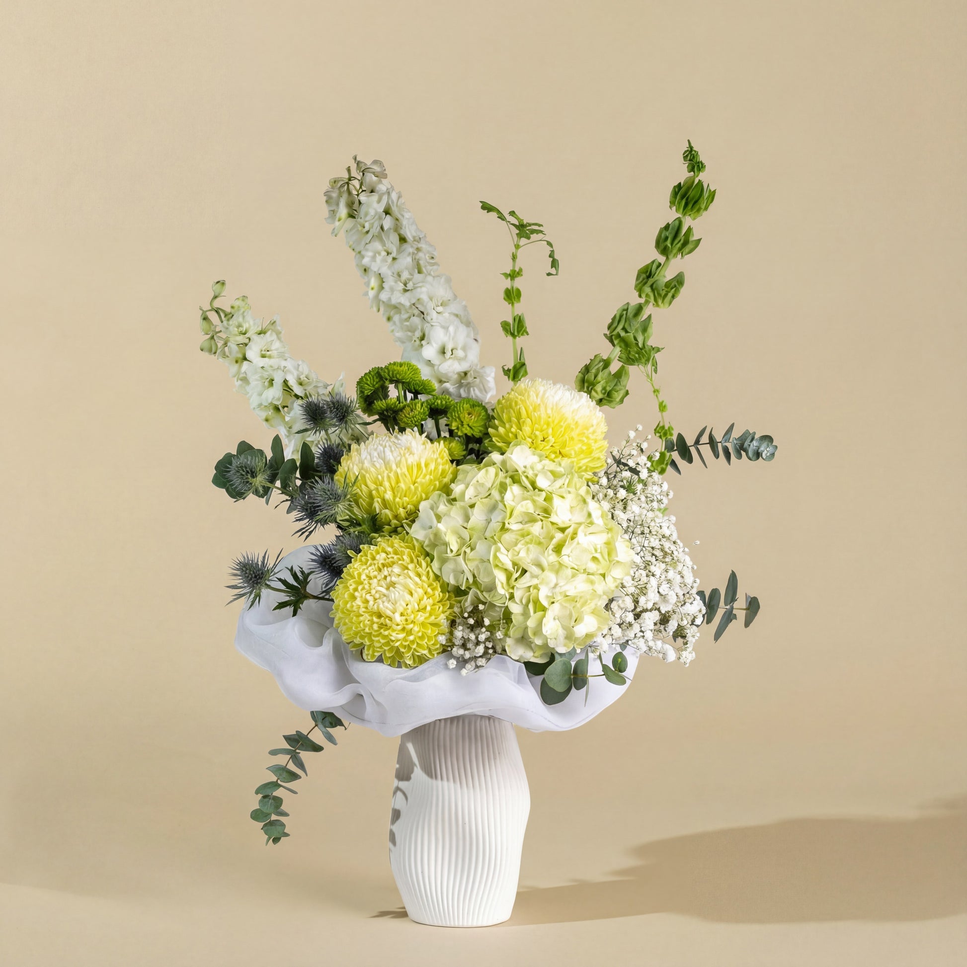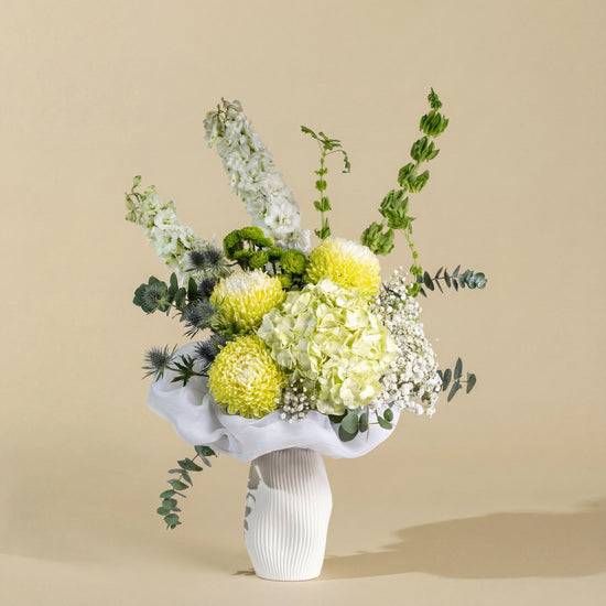 "A refreshing contemporary masterpiece featuring towering white Delphiniums and vibrant lime-green Mums. Accented with blue Eryngium and lush eucalyptus, this arrangement sits in a sleek, wave-textured white ceramic vase. It’s a sophisticated choice for those who appreciate modern floral artistry and cool, crisp tones."