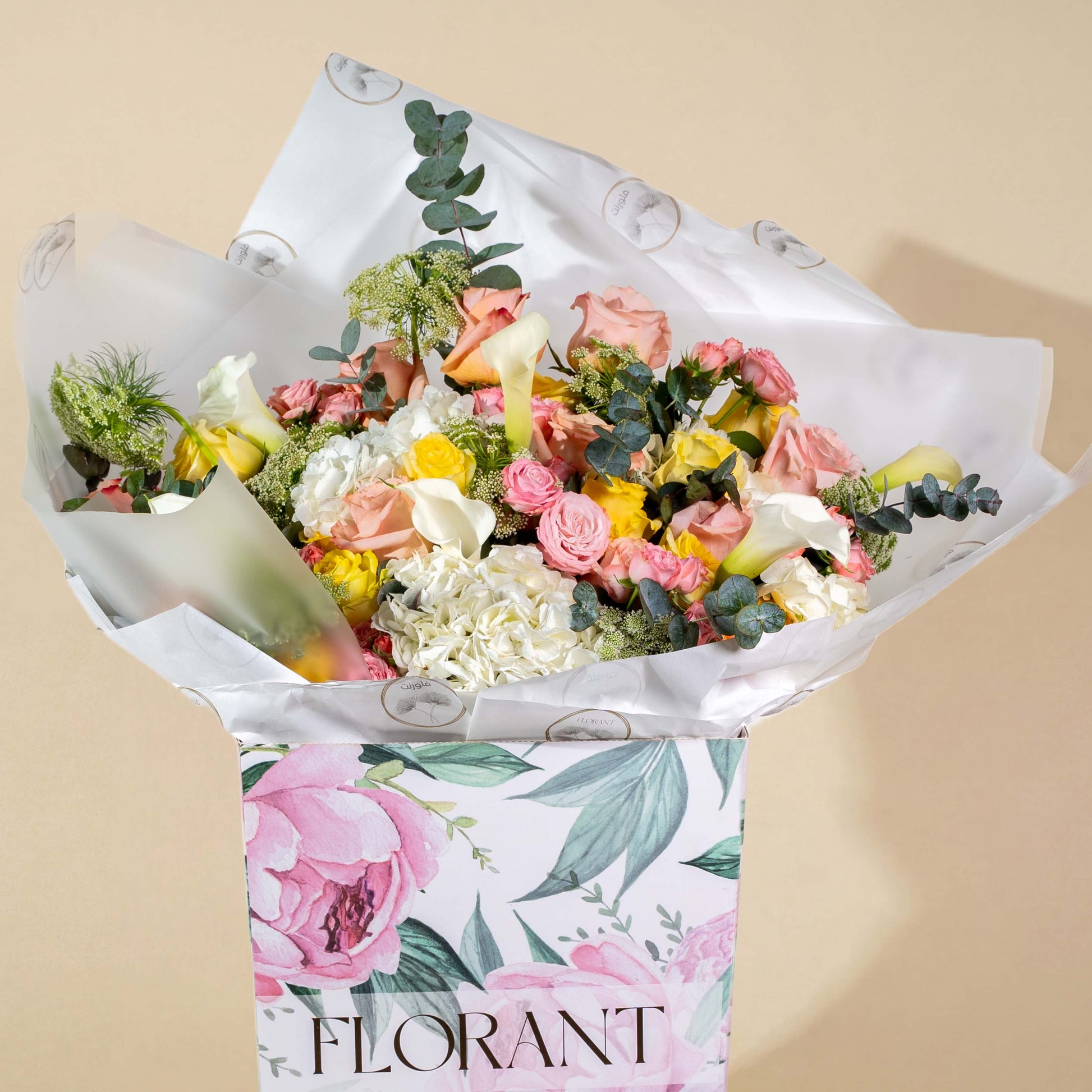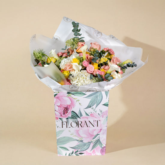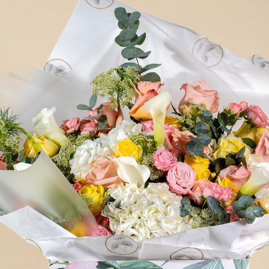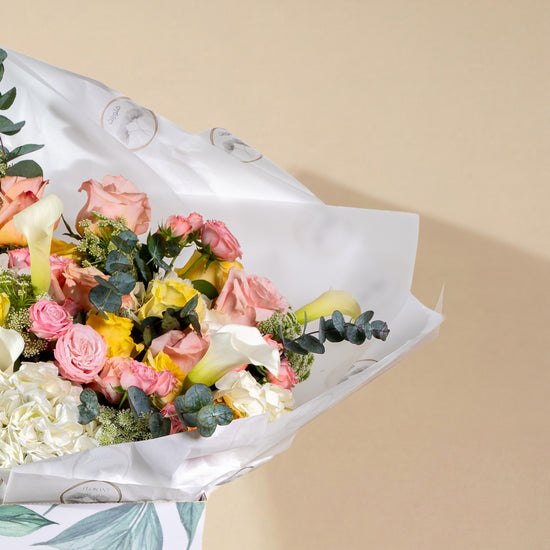 A vibrant celebration of color and life! This cheerful bouquet features a playful mix of pink, peach, and yellow roses, accented with elegant white Calla Lilies and fluffy Hydrangeas. Beautifully wrapped and presented in our signature floral-print box, it’s the perfect gift to brighten anyone’s day.