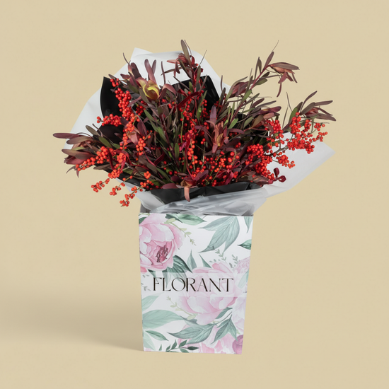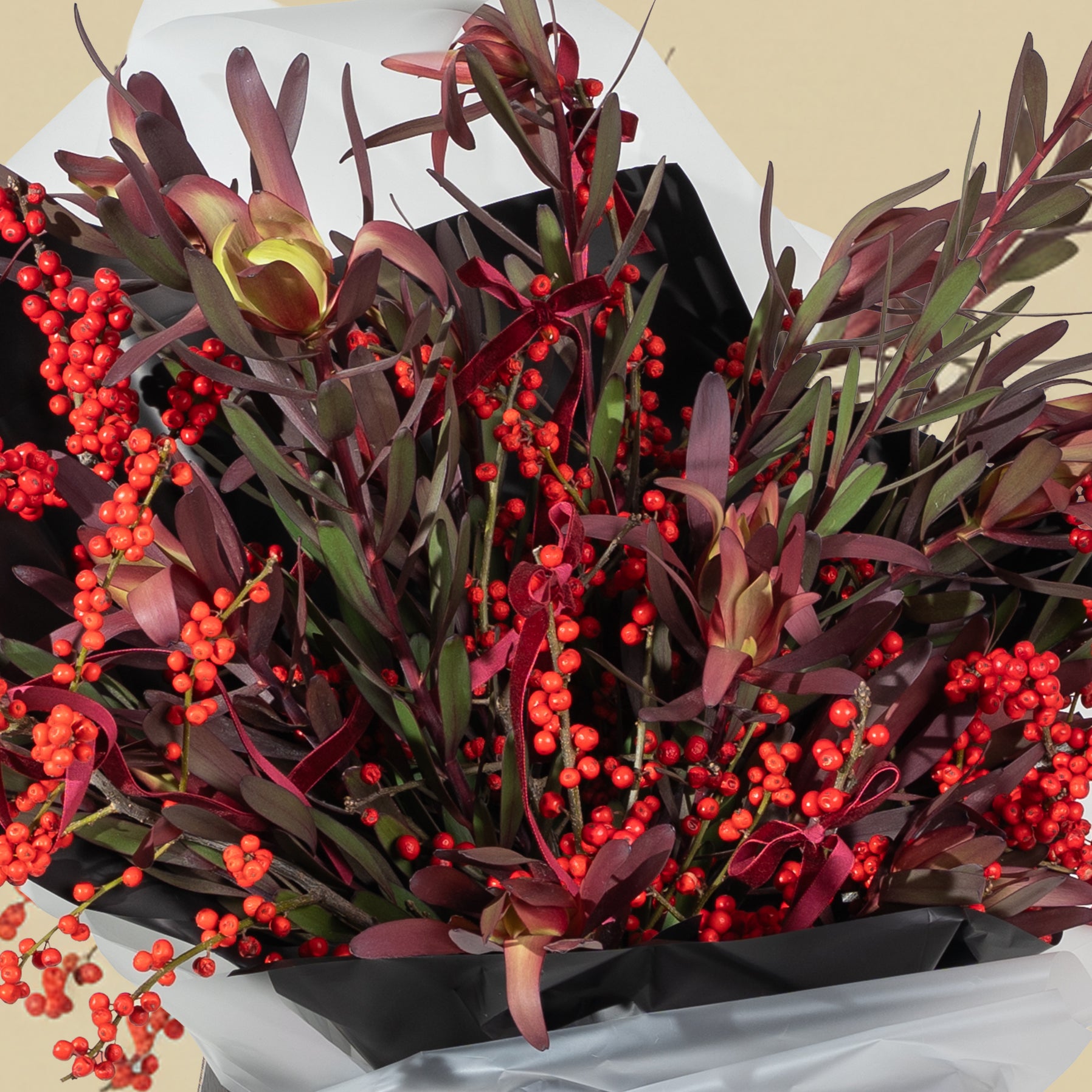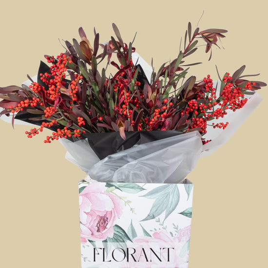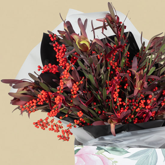 A bold statement of elegance and power. This striking arrangement features vibrant red winter berries contrasted with the deep, moody tones of dark Leucadendron foliage. Nestled in our signature Florant box with a sophisticated black wrap, it’s a unique gift designed for those who admire dramatic textures and timeless luxury.