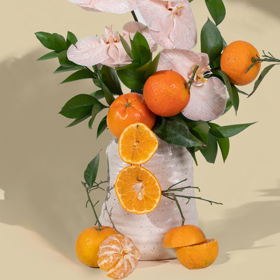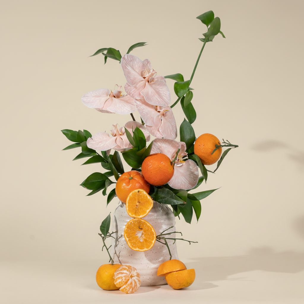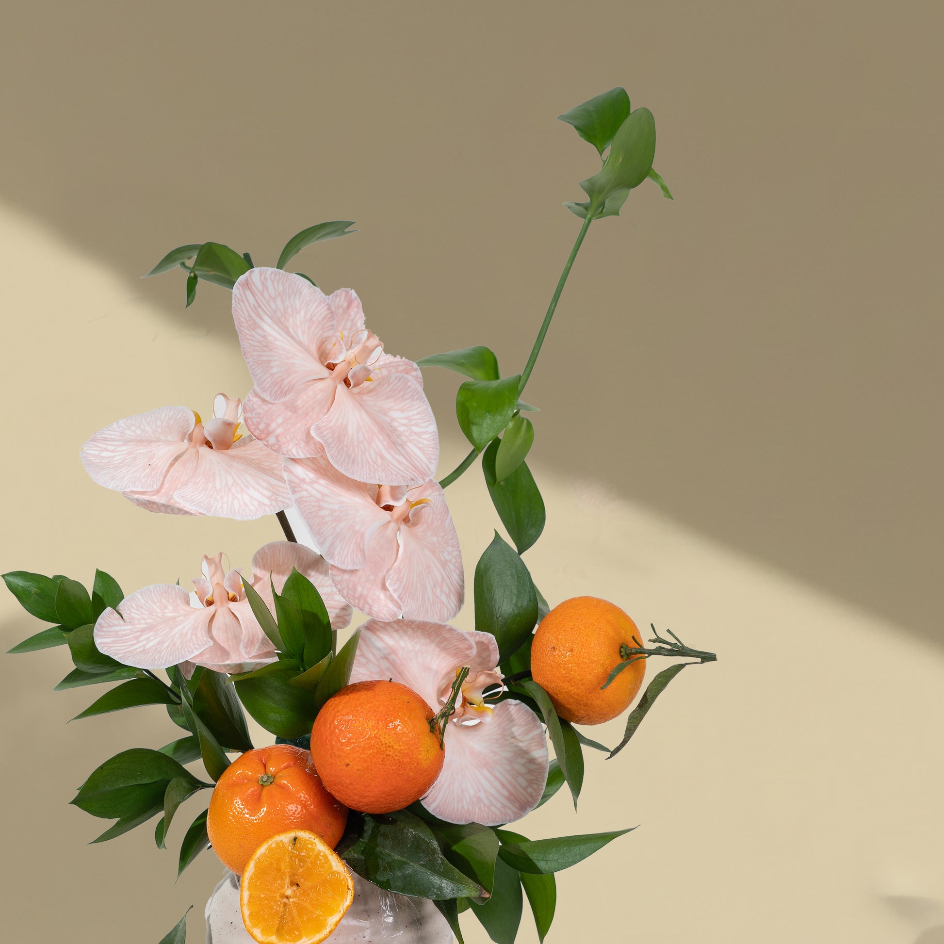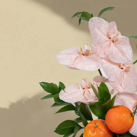 Pink orchid arrangement with fresh oranges. Modern bouquet combining soft pink orchids with natural orange fruits. A unique and refreshing gift perfect for special occasions.