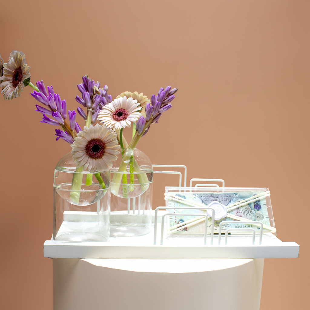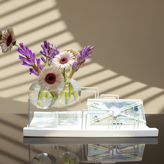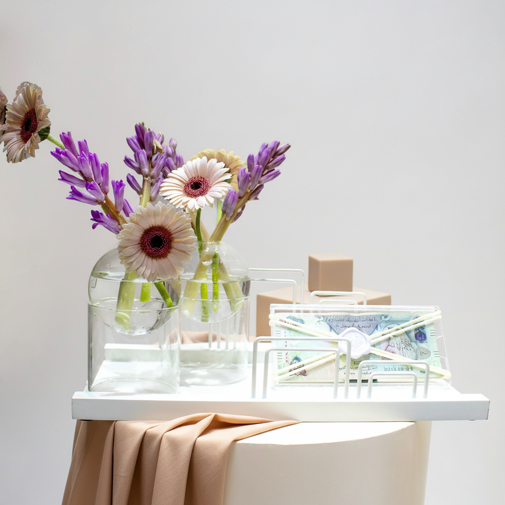 مجموعة هدايا وزهور أنيقة بأربعة زهور زنبق بنفسجية عطرة وأربعة زهور جربيرا وردية مبهجة، مع إكسسوارات أنيقة تشمل مزهرية زجاجية مزدوجة، ومغلف نقود أنيق، وصينية مزخرفة. صُممت هذه المجموعة بعناية فائقة لتُضفي لمسة ساحرة وصادقة.