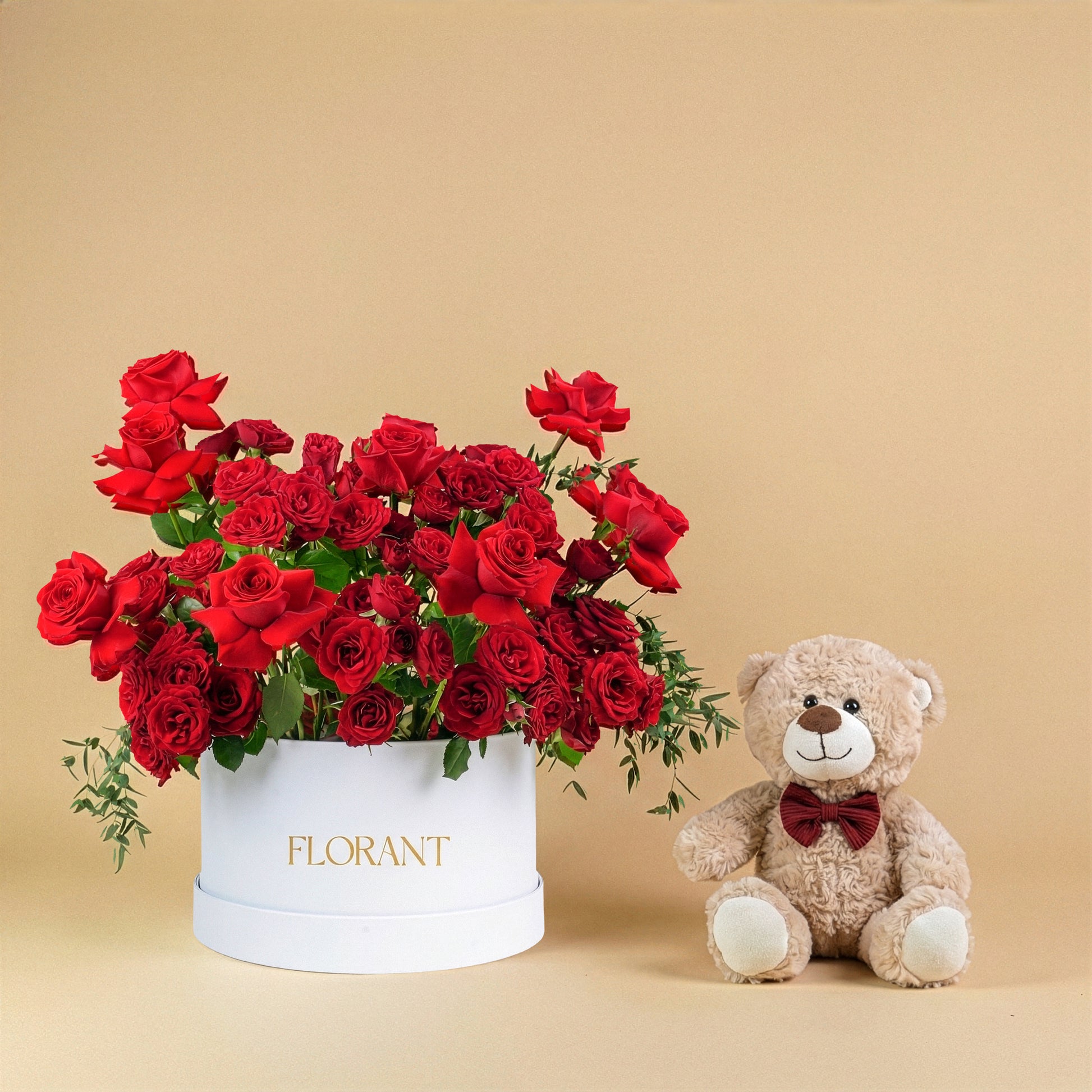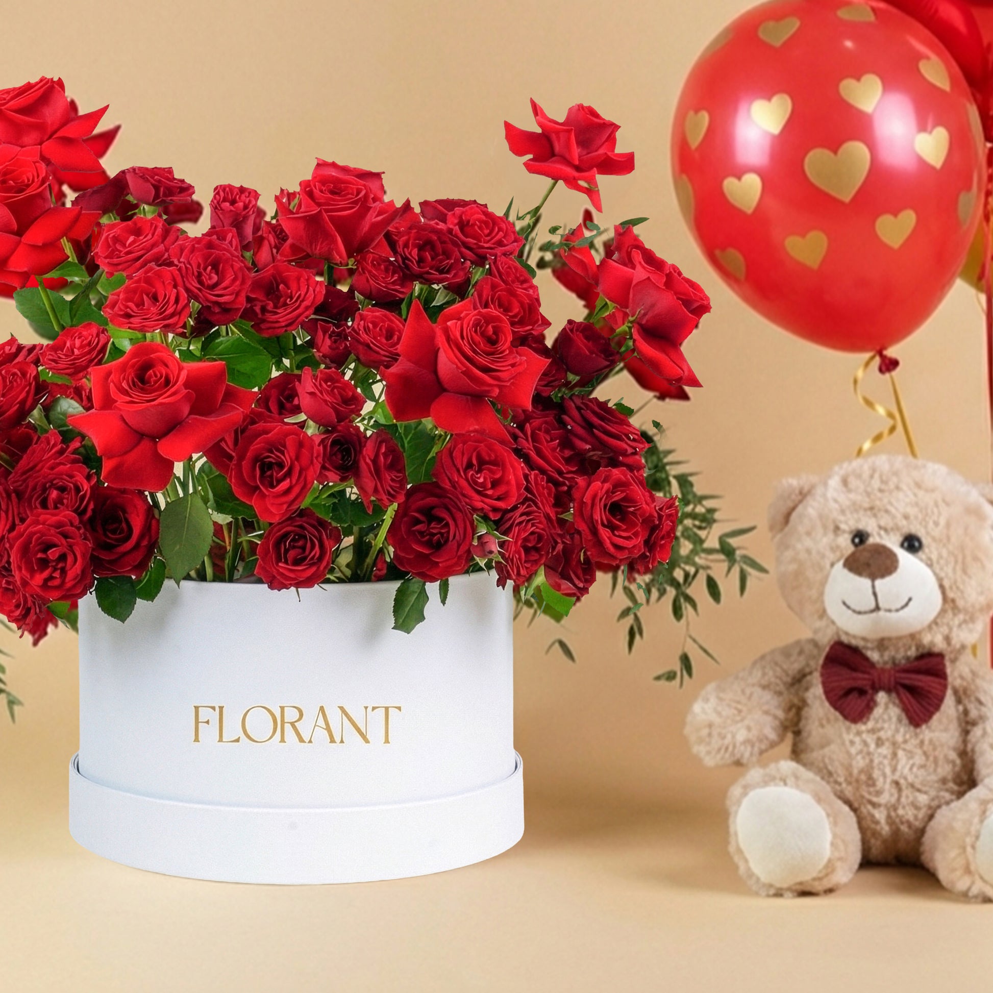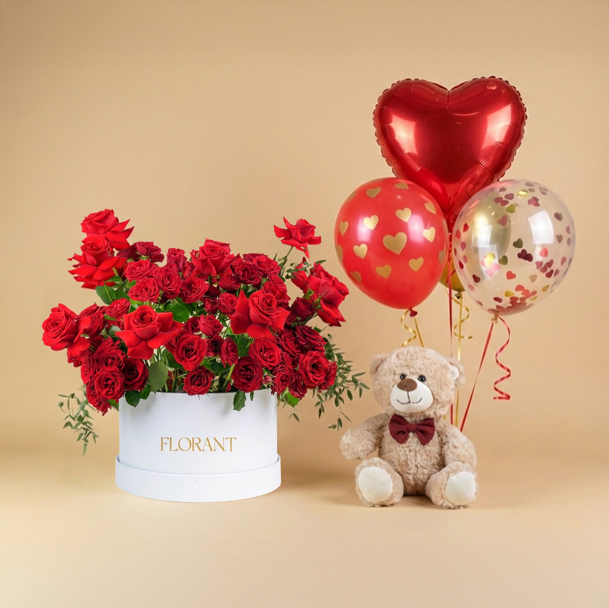 A red rose arrangement paired with a teddy bear and balloons, crafted to turn any occasion into a memorable moment.