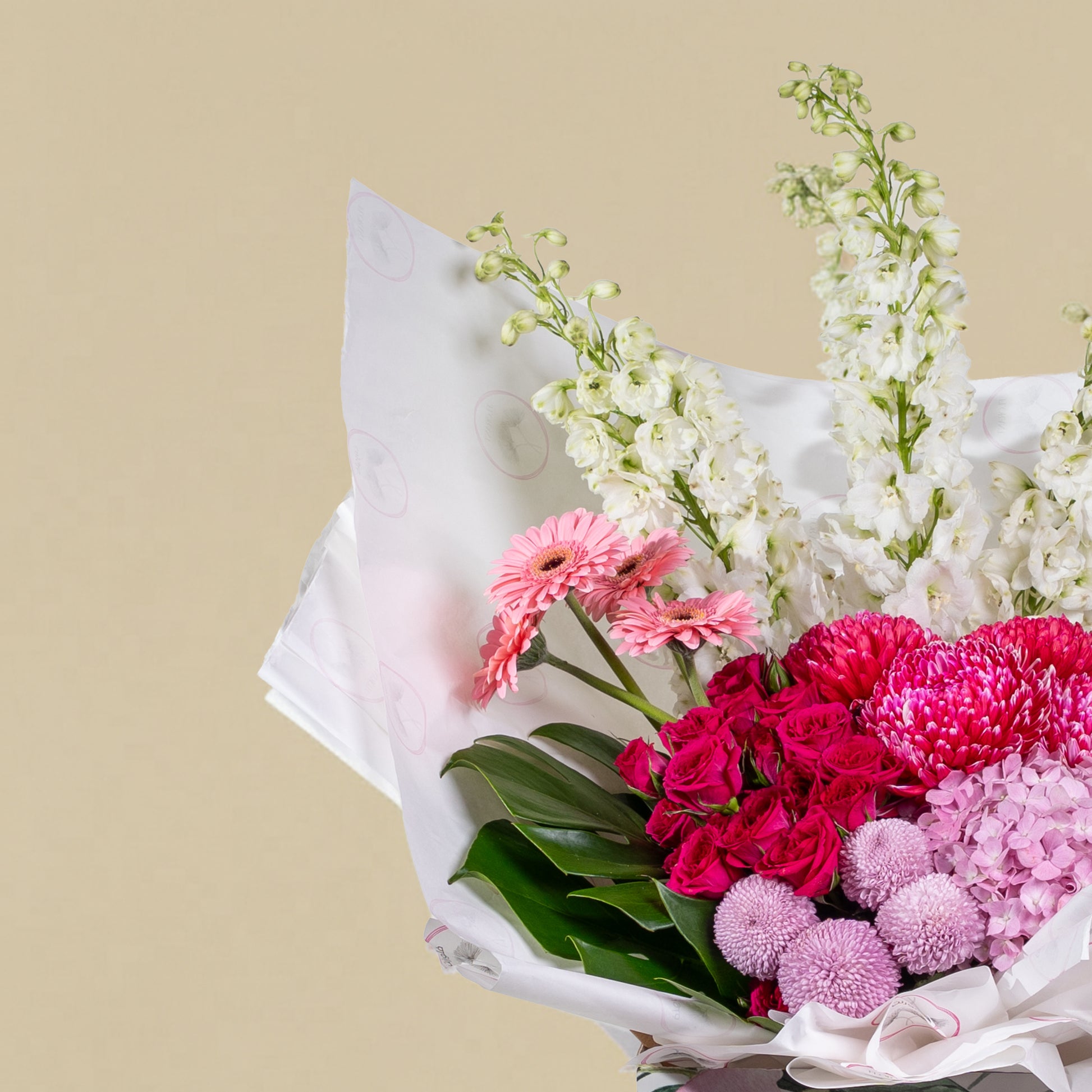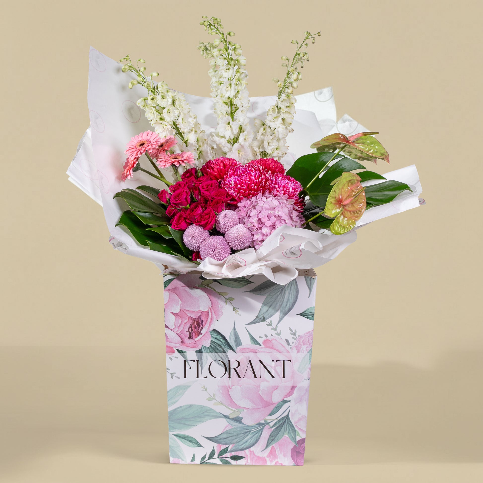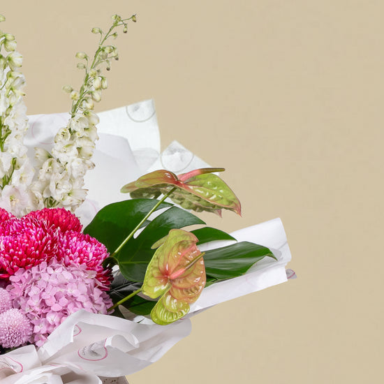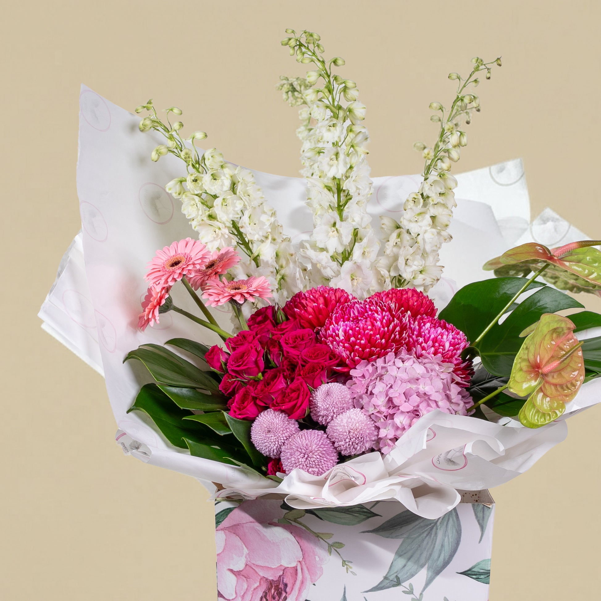 A luxurious spring-inspired floral arrangement with soft pastel tones, blending pink, white, and fresh green flowers in an elegant box. Perfect for joyful moments and refined gifting.