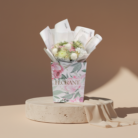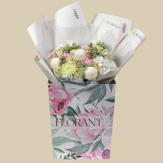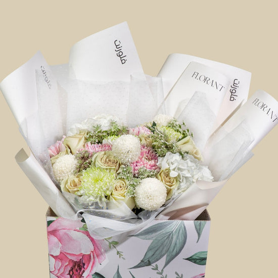 يجمع هذا التنسيق الأنيق بين الأناقة الخالدة واللمسة العصرية. يتميز بزهور بينغ بونغ الرقيقة وزهور الكوبية الناعمة باللون الأبيض، مع لمسات جمالية من أقحوان ديليستر بدرجات الأخضر والأرجواني. تضفي ورود الإكوادور العاجية الوفيرة لمسة كلاسيكية راقية، بينما تضفي زهرة أمي ماجوس الخفيفة لمسةً من الرقة والخفّة، مثالية للمناسبات الراقية أو كهدية مميزة.