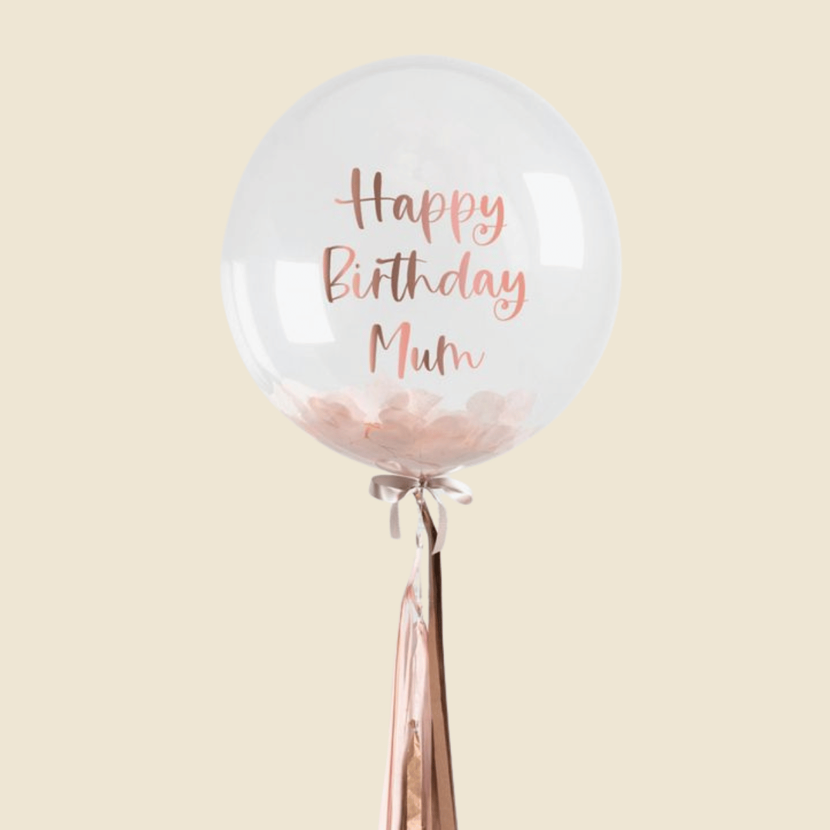 Celebrate your mum with elegance using our Happy Birthday Mum Boba Balloon. This transparent boba-style balloon features rose-gold lettering, soft petal fillings, and a satin ribbon — perfect for birthdays, gifting, and stylish event décor.