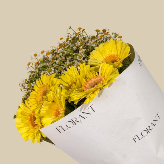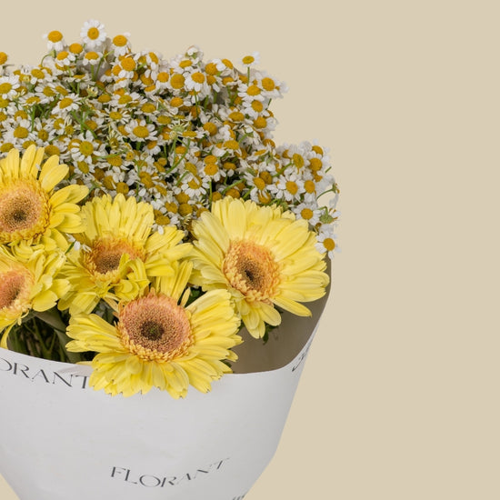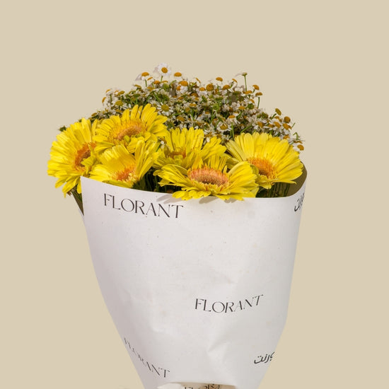 مزيج مبهج من زهور الجربيرا الصفراء النابضة بالحياة مقترنة بسيقان التاناسيتوم البيضاء الرقيقة.