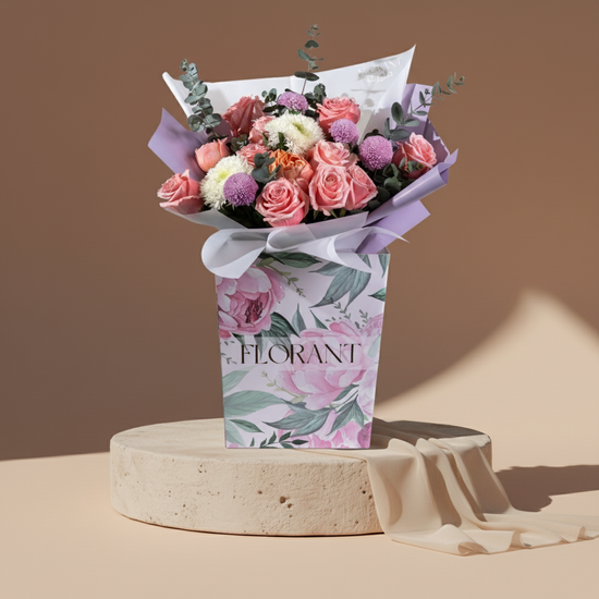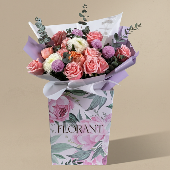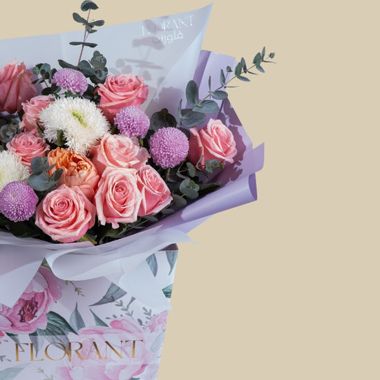 مجموعة زهور ناعمة وأنيقة تُجسّد جمالاً راقياً. مع ورود إكوادورية وردية زاهية، وورود فاوانيا بلون الخوخ، وأزهار بينج بونج أرجوانية خلابة، تُزيّن هذه الباقة زهور الأقحوان البيضاء الناصعة وأوراق الأوكالبتوس النضرة لإضفاء لمسة من السحر الترابي.