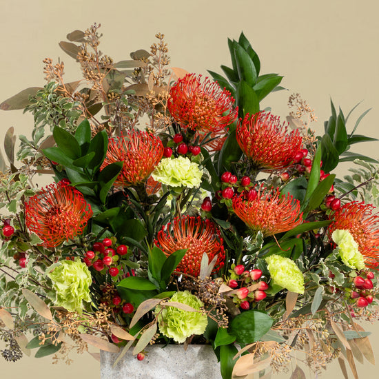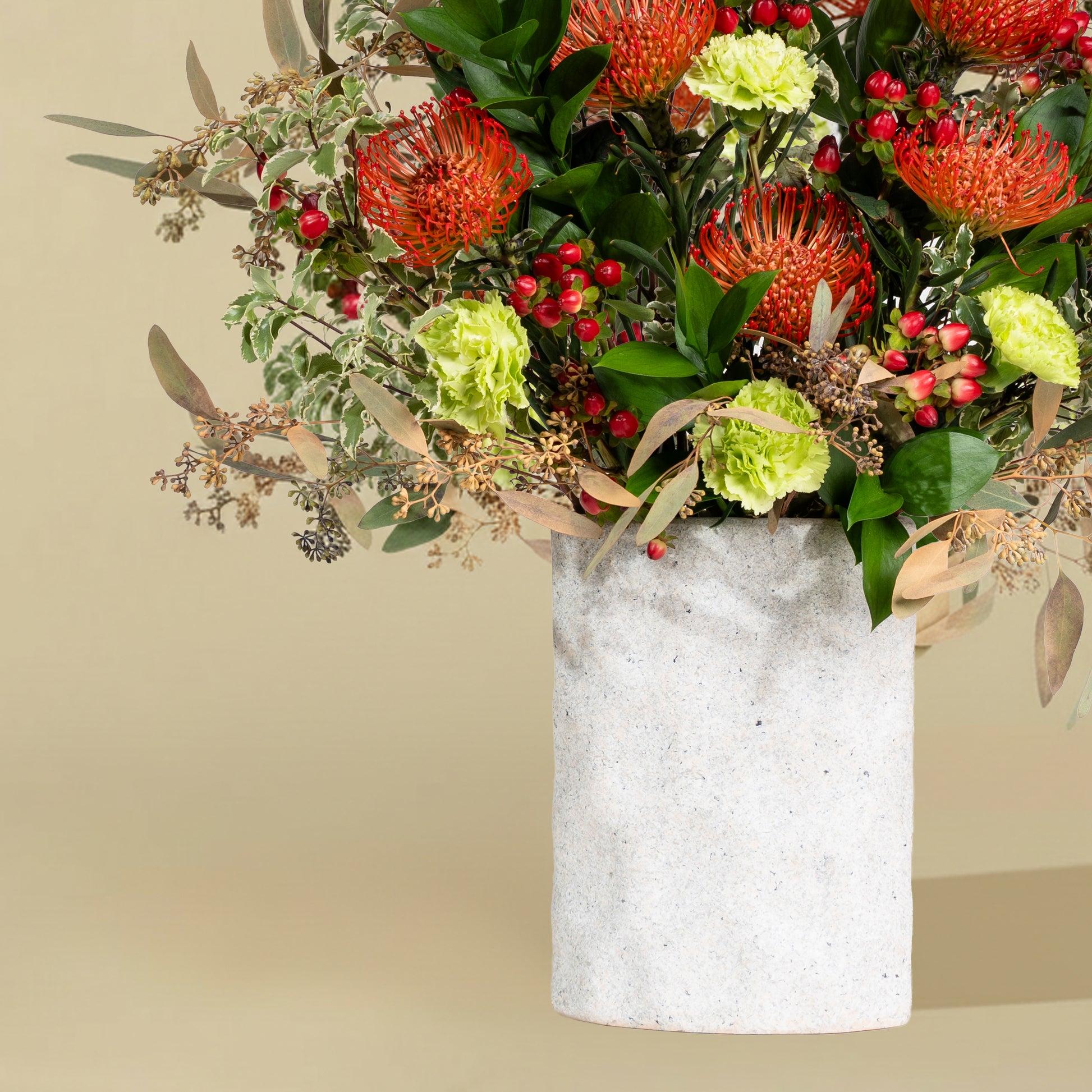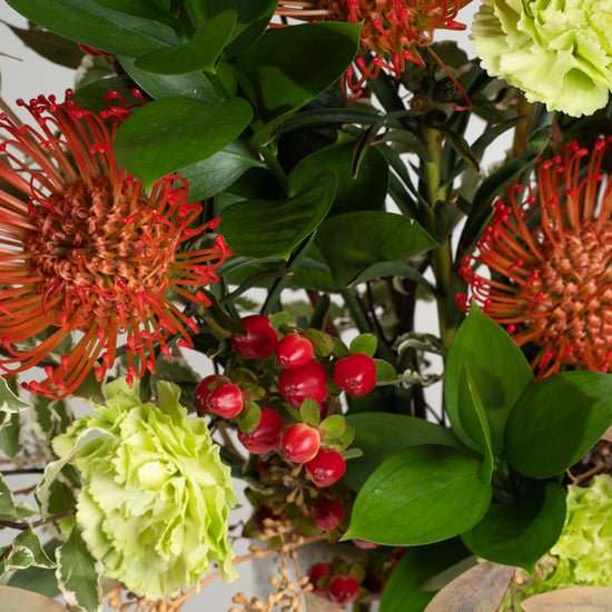 A warm, rustic arrangement featuring exotic orange pincushion proteas paired with fresh green carnations and festive red berries. Accented with wild eucalyptus and presented in a textured stone vase, this bouquet brings earthy elegance and vibrant energy to any room."