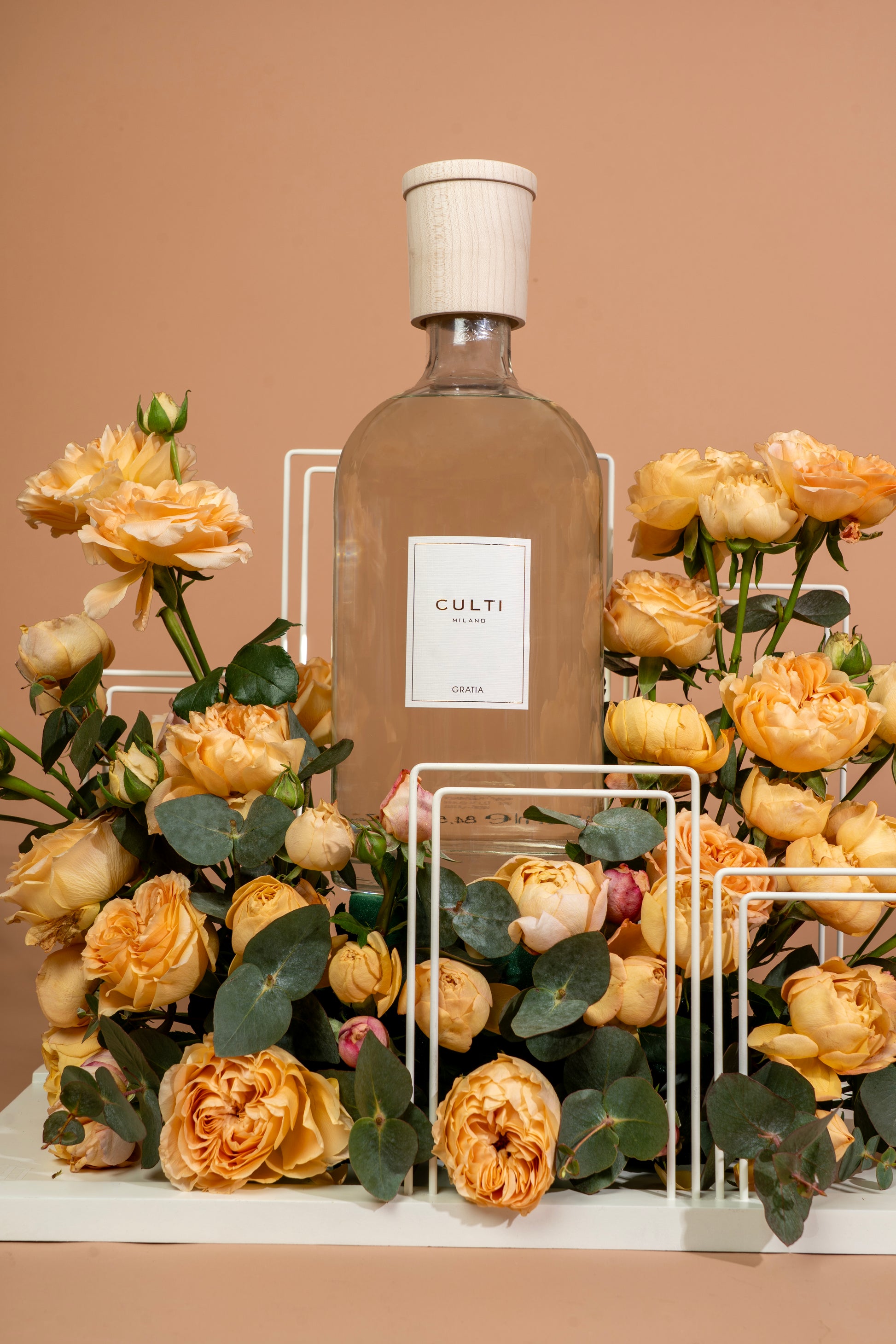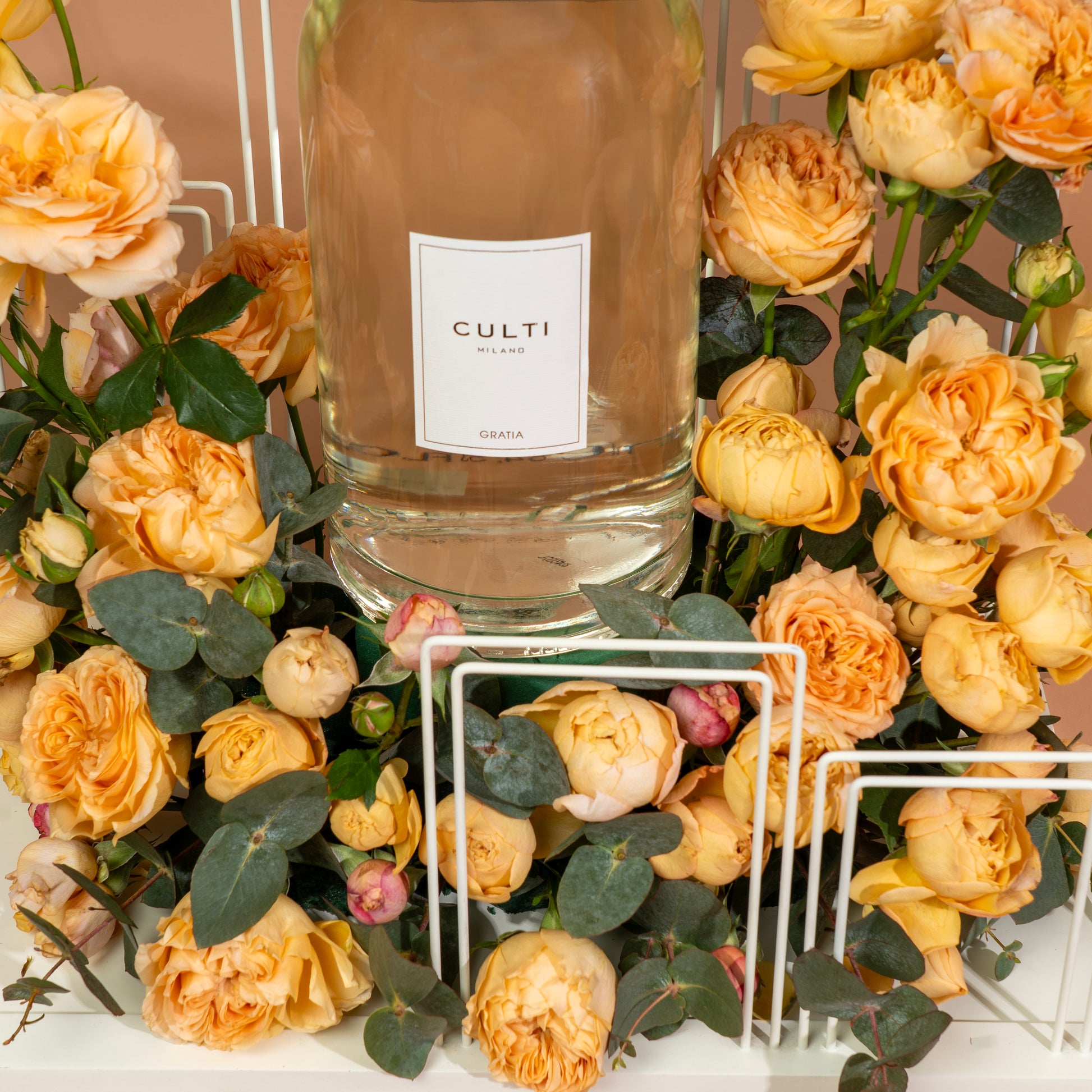 مزيج رقيق وعطر من زهور الورد الصغير والخوخ وسيقان الأوكالبتوس، مُرتبة بعناية على صينية. يُكمل هذه المجموعة معطر جو فاخر "كولتي غراتيا" سعة 2500 مل، ليُضفي جوًا من الدفء والجاذبية برائحته الآسرة. مثالي لـ... خلق جو هادئ في أي مكان.