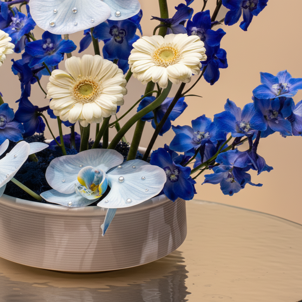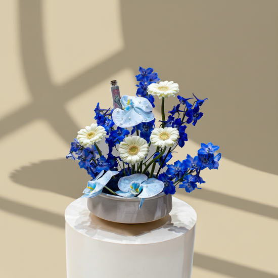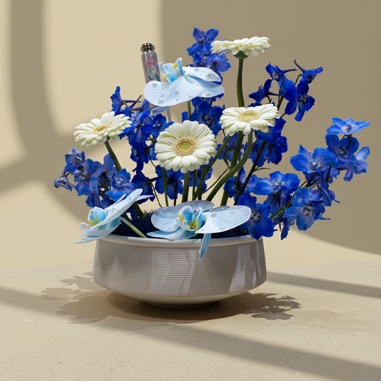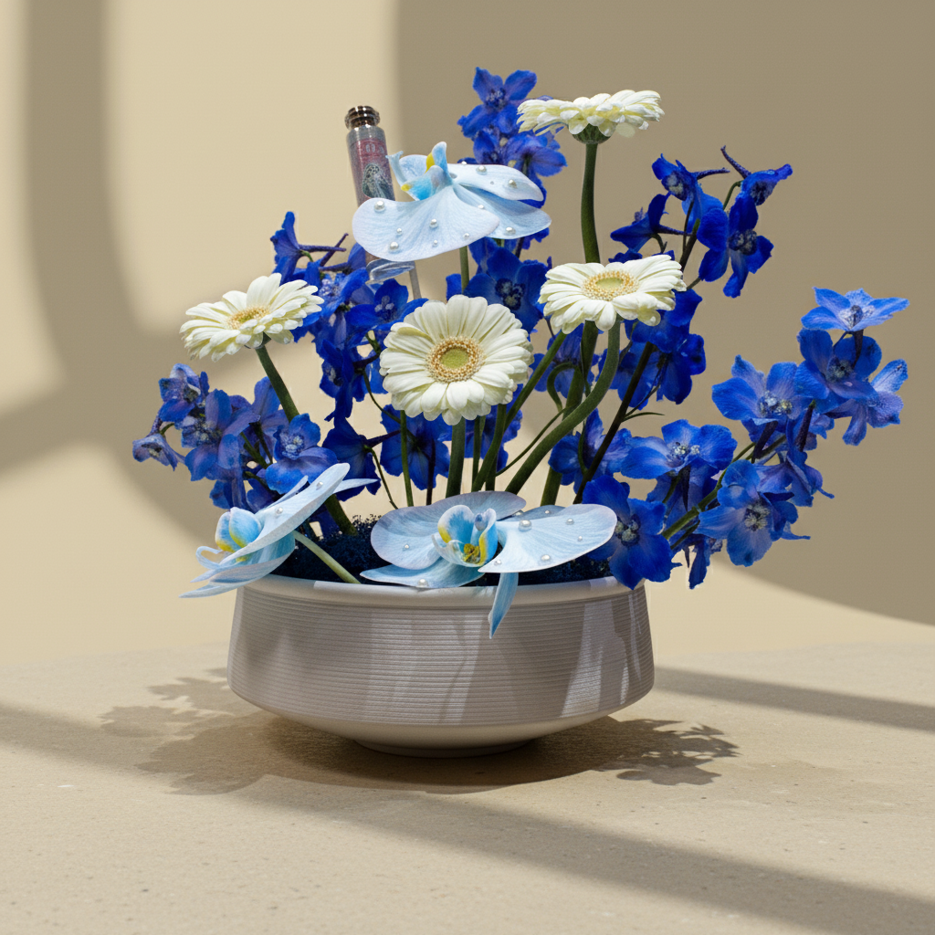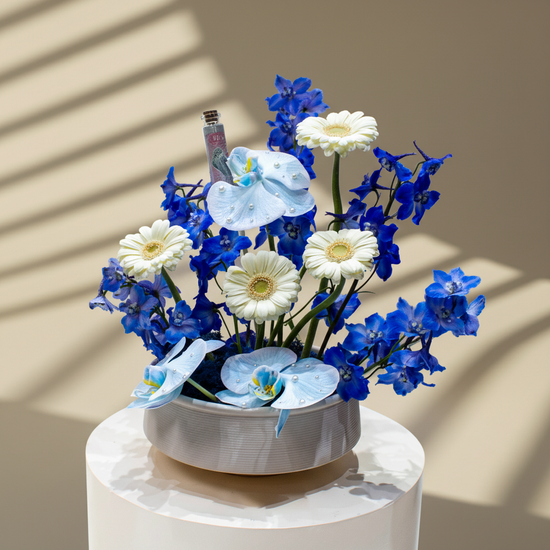 تنسيق زهور أنيق ومنعش يضم 3 زهور دلفينيوم زرقاء، و4 زهور أنثوريوم بيضاء نقية، و3 زهور أوركيد زرقاء فاتحة رقيقة. يُرفق هذا التصميم بمزهرية خزفية أنيقة وقارورة نقود، ليمزج بين سحر العصر وجماله الخالد، مثالي كهدية مميزة أو لمسة شخصية فاخرة.