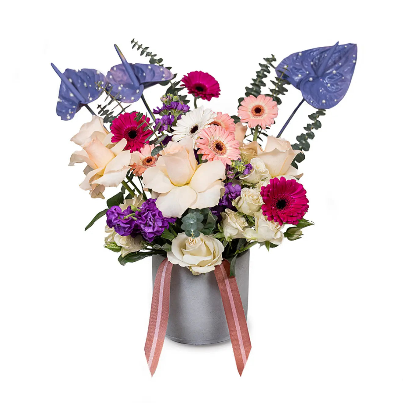 Infuse the vibrant colours of summer into your home with this beautiful bunch of floral bouquet. In the box: Gerbera, Anthurium, Rose, Mattihiola, and Eucalyptus.
