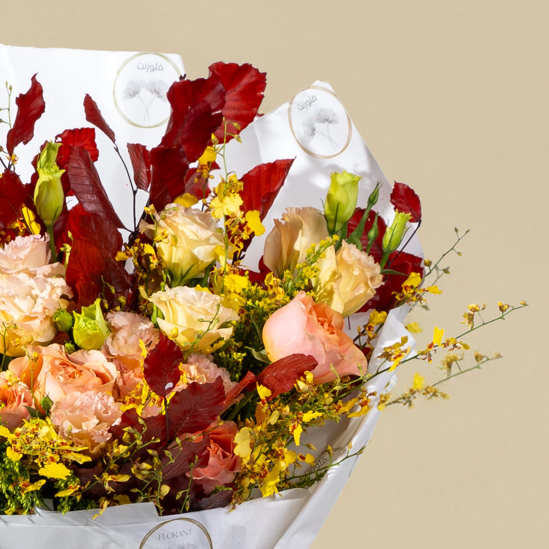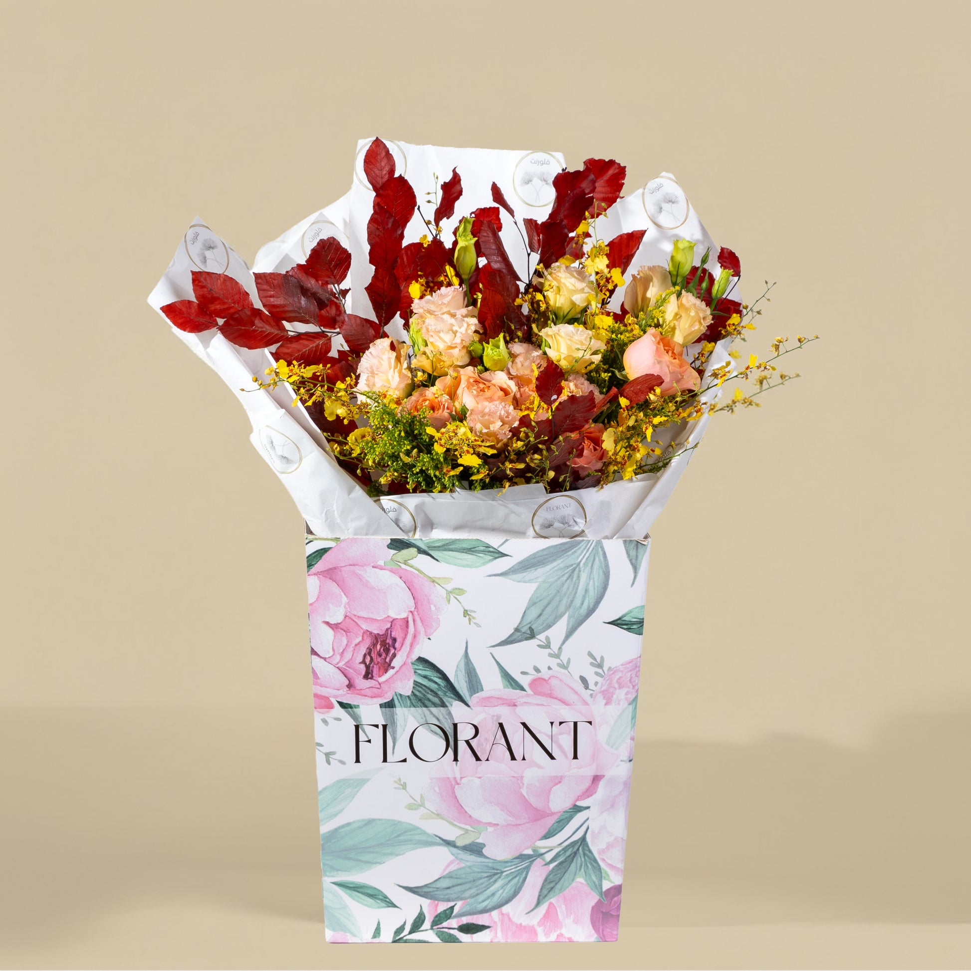 The essence of autumnal elegance! This Florant arrangement features a rich contrast of deep crimson foliage and soft peach and golden blooms. Artfully curated in our signature floral-print box, it combines earthy warmth with sophisticated charm, making it a perfect gift for those who love unique and bold floral statements.