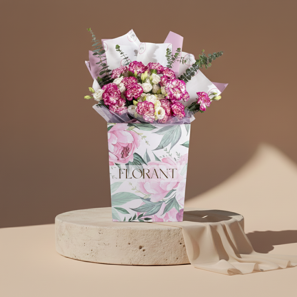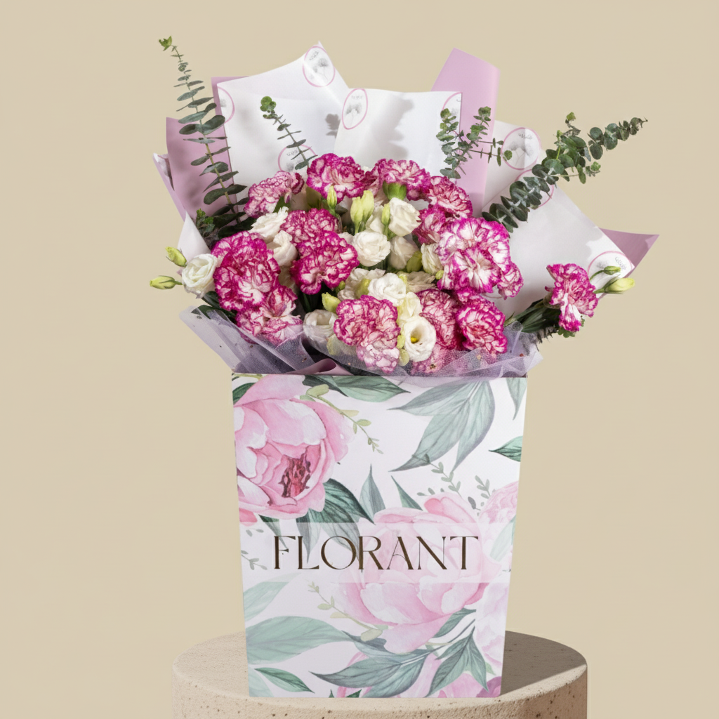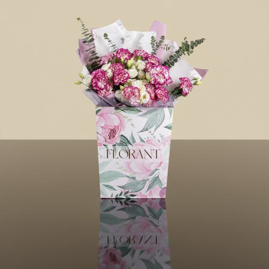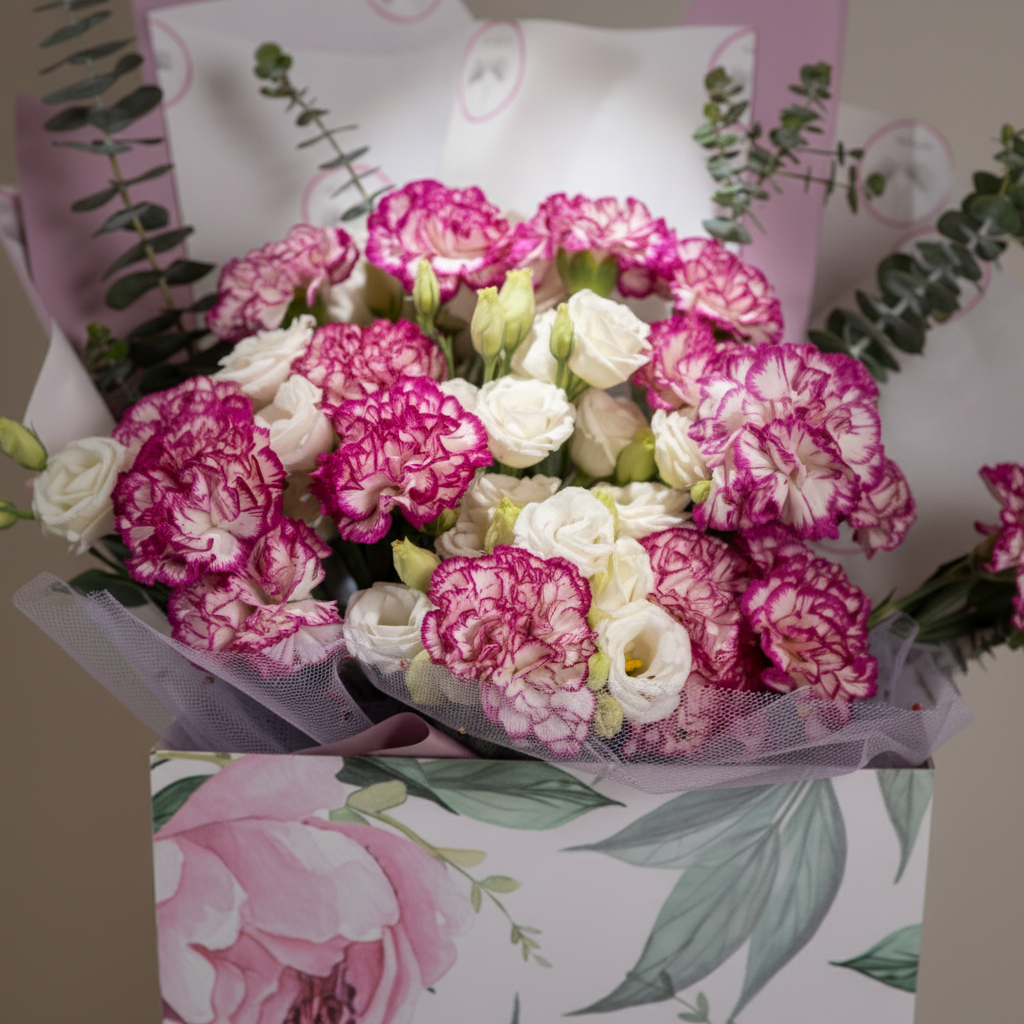 Romance isn't always red. Sometimes it comes in dreamy pink with white spots on carnations, whispering with fresh eucalyptus scent. White lisianthus adds purity, and spray roses fill the heart before filling the arrangement. For tender feelings that need no shouting, just a beautiful whisper.