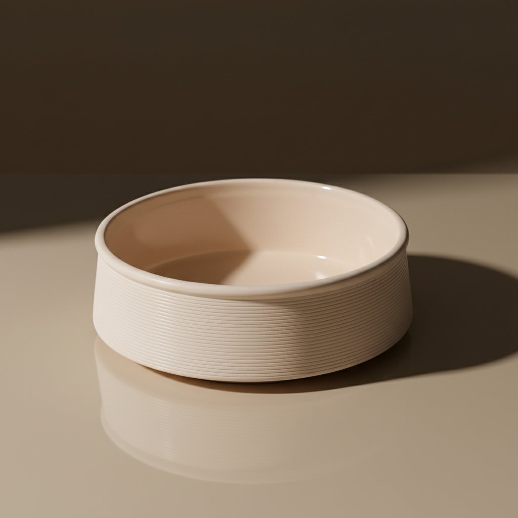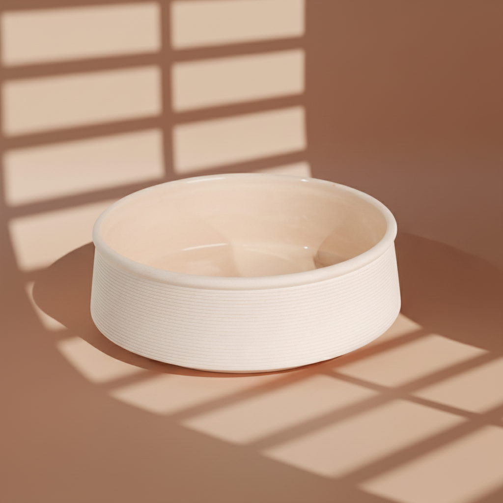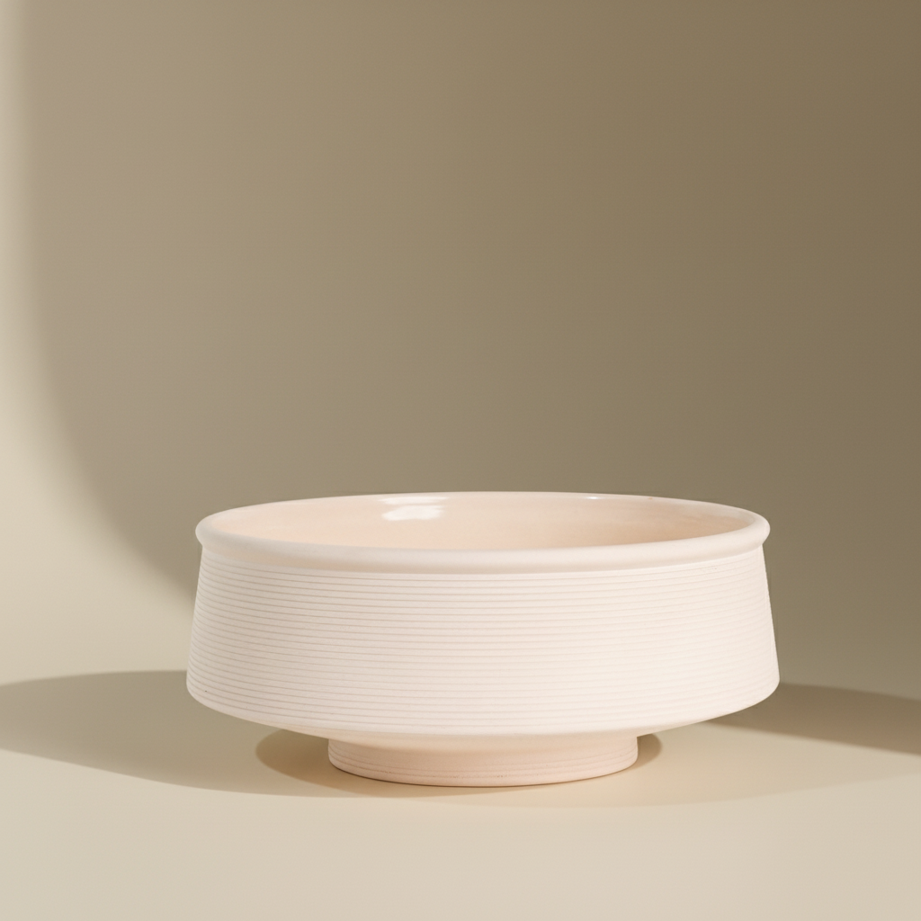 Contemporary white pedestal bowl featuring horizontal ribbed detailing. Ideal for floral arrangements and home styling.