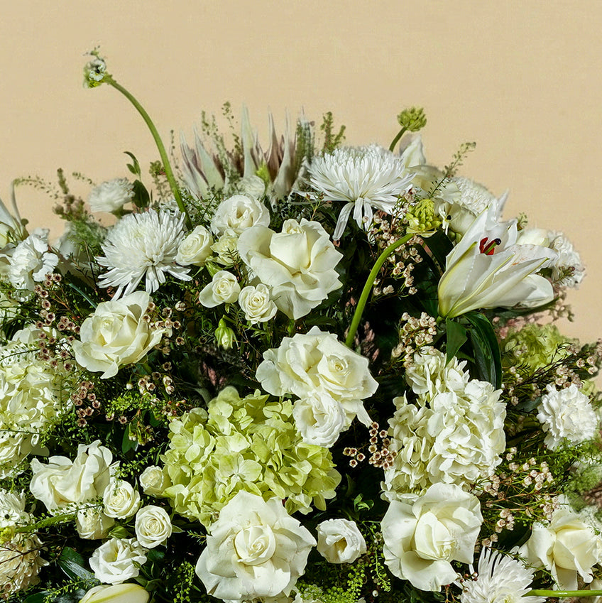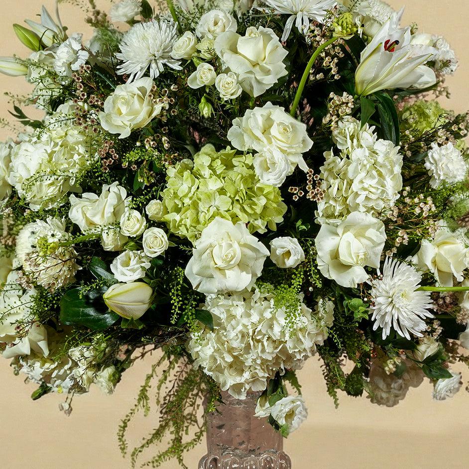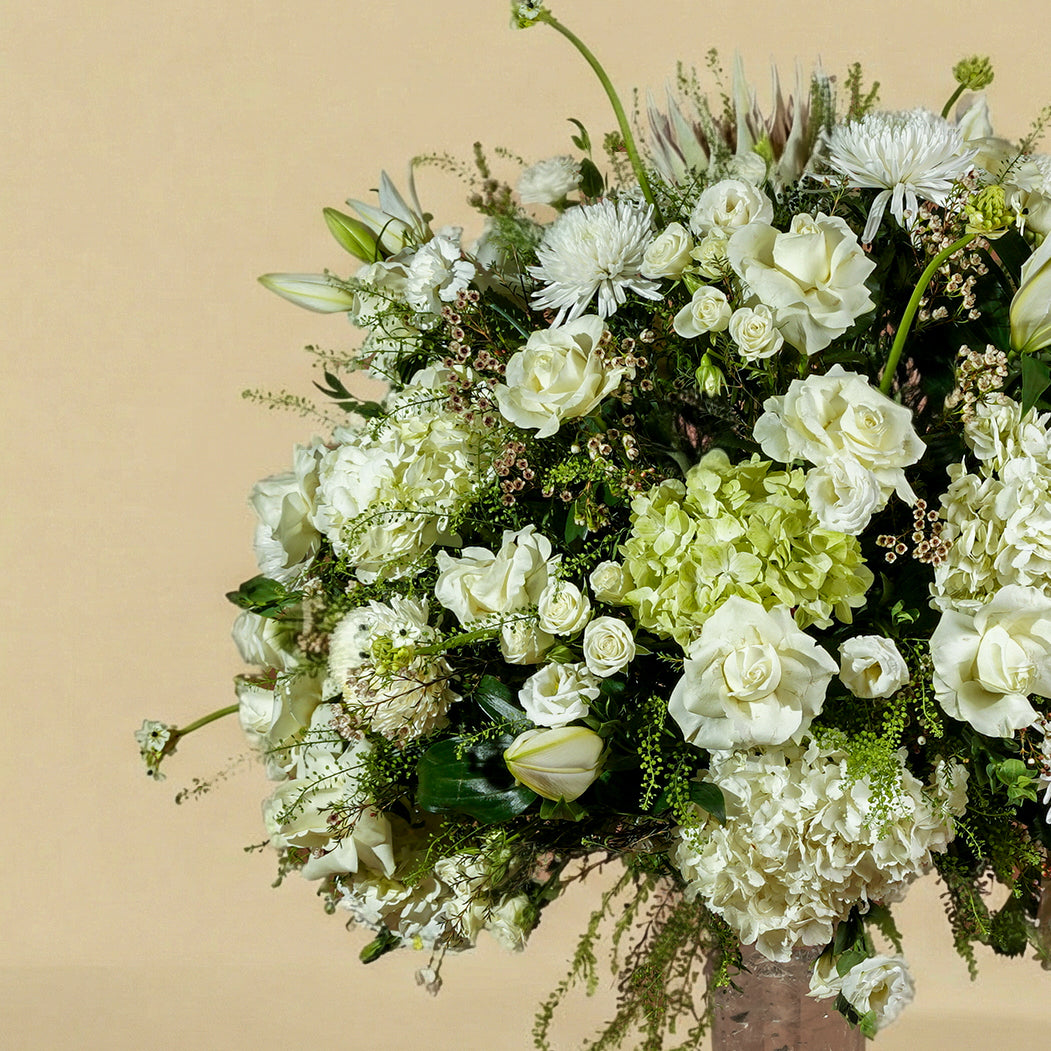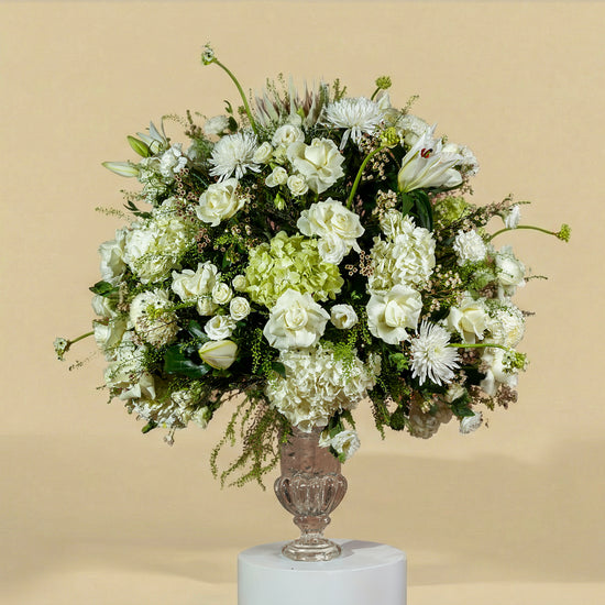 A masterpiece of serene minimalism. This low-profile centerpiece features a delicate cluster of pristine white roses and carnations, cushioned by lush green hydrangeas. A timeless choice for adding quiet elegance to intimate gatherings.