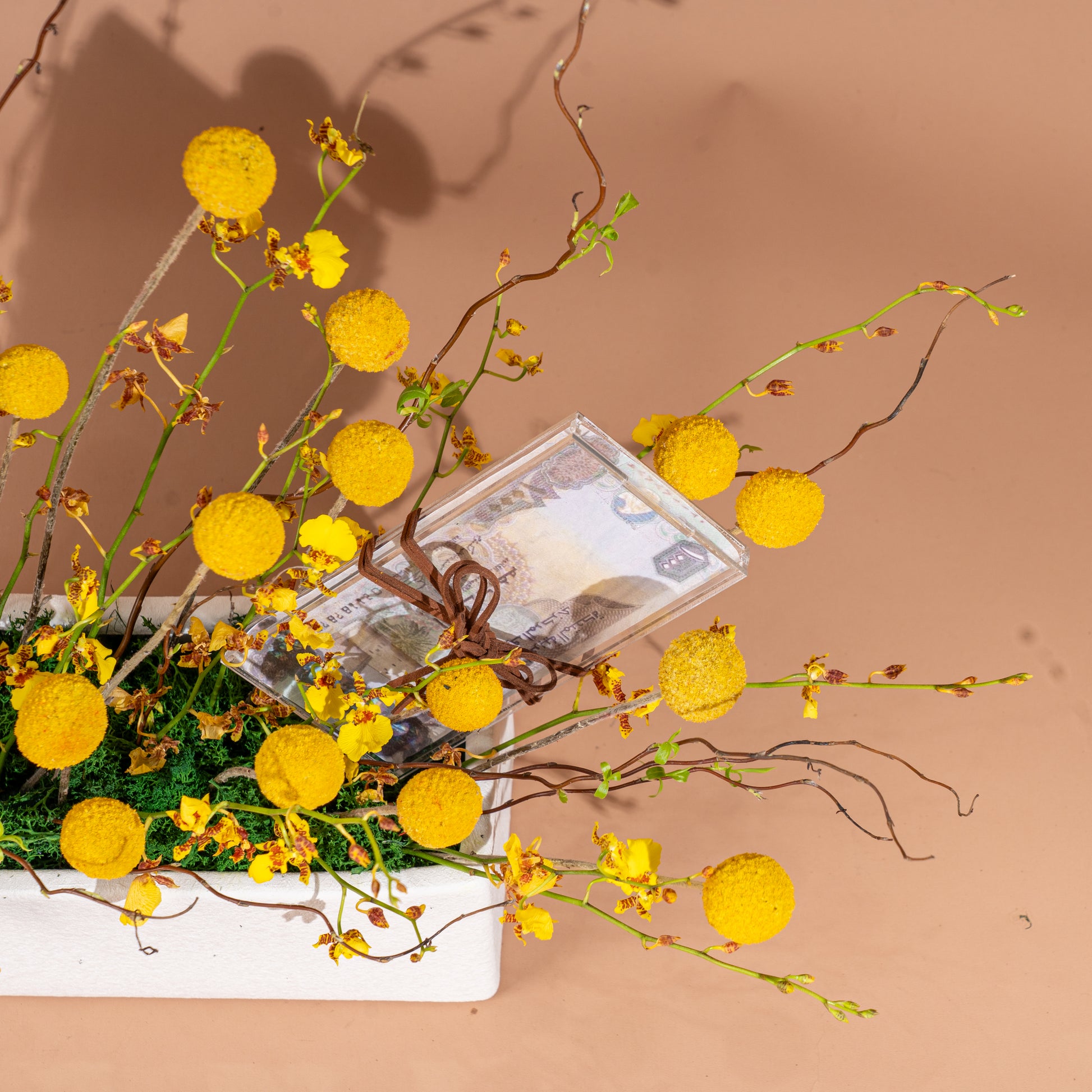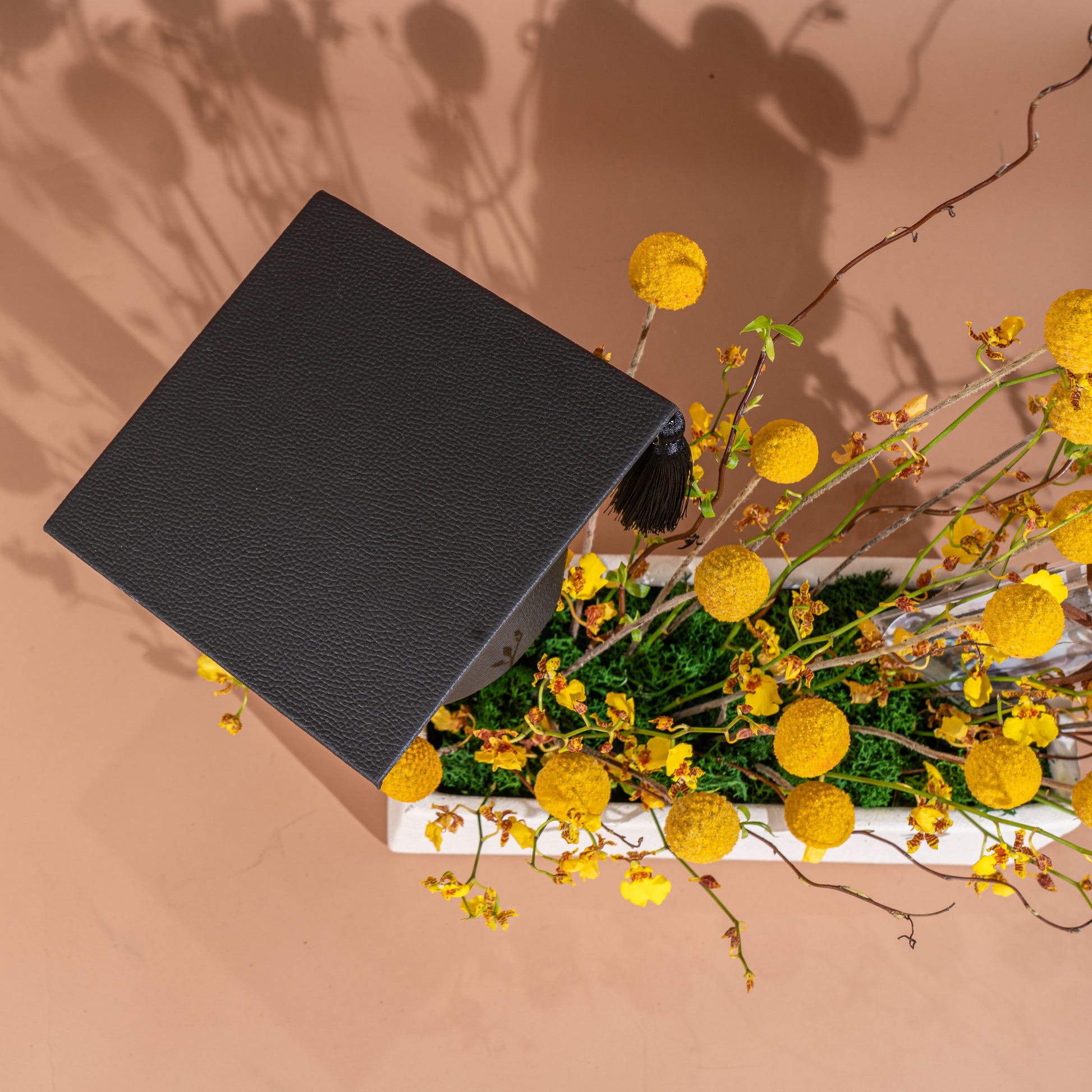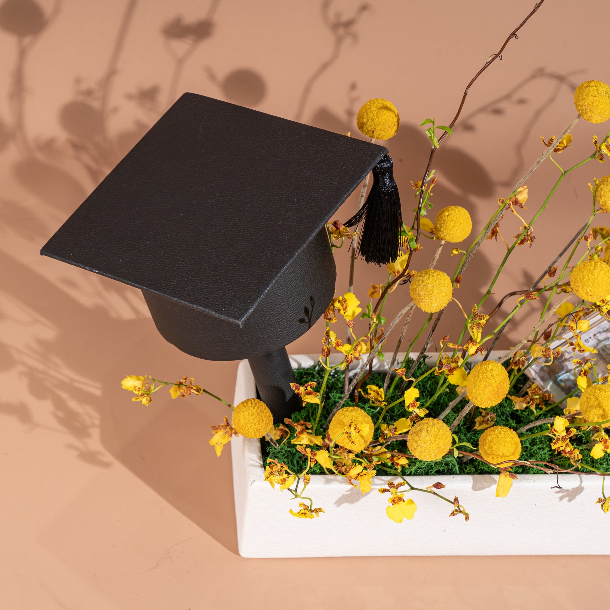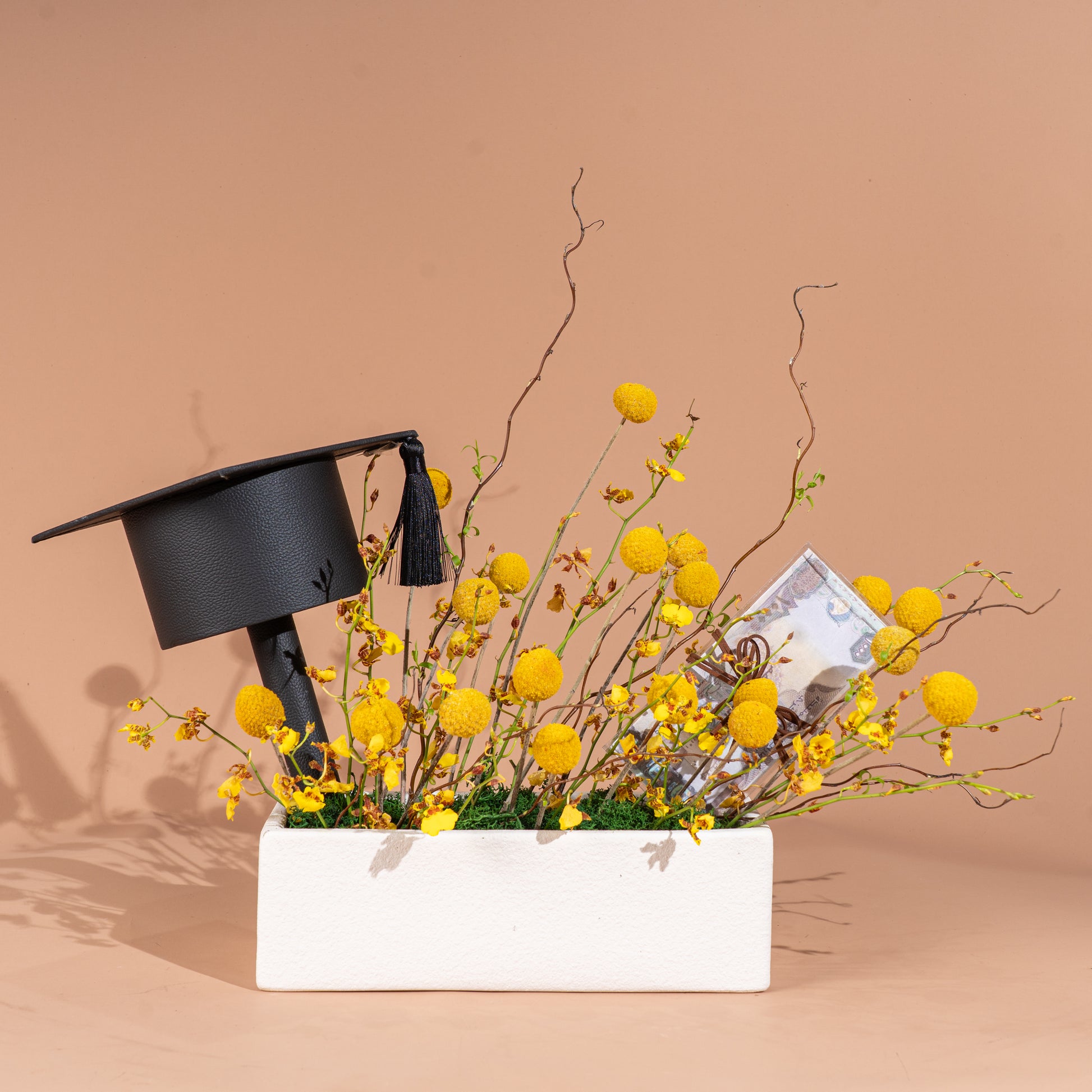 A modern and elegant graduation vase, featuring bright yellow flowers, a classic graduation cap, and a luxury touch with a money note – a perfect symbol of pride, success, and celebration.