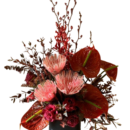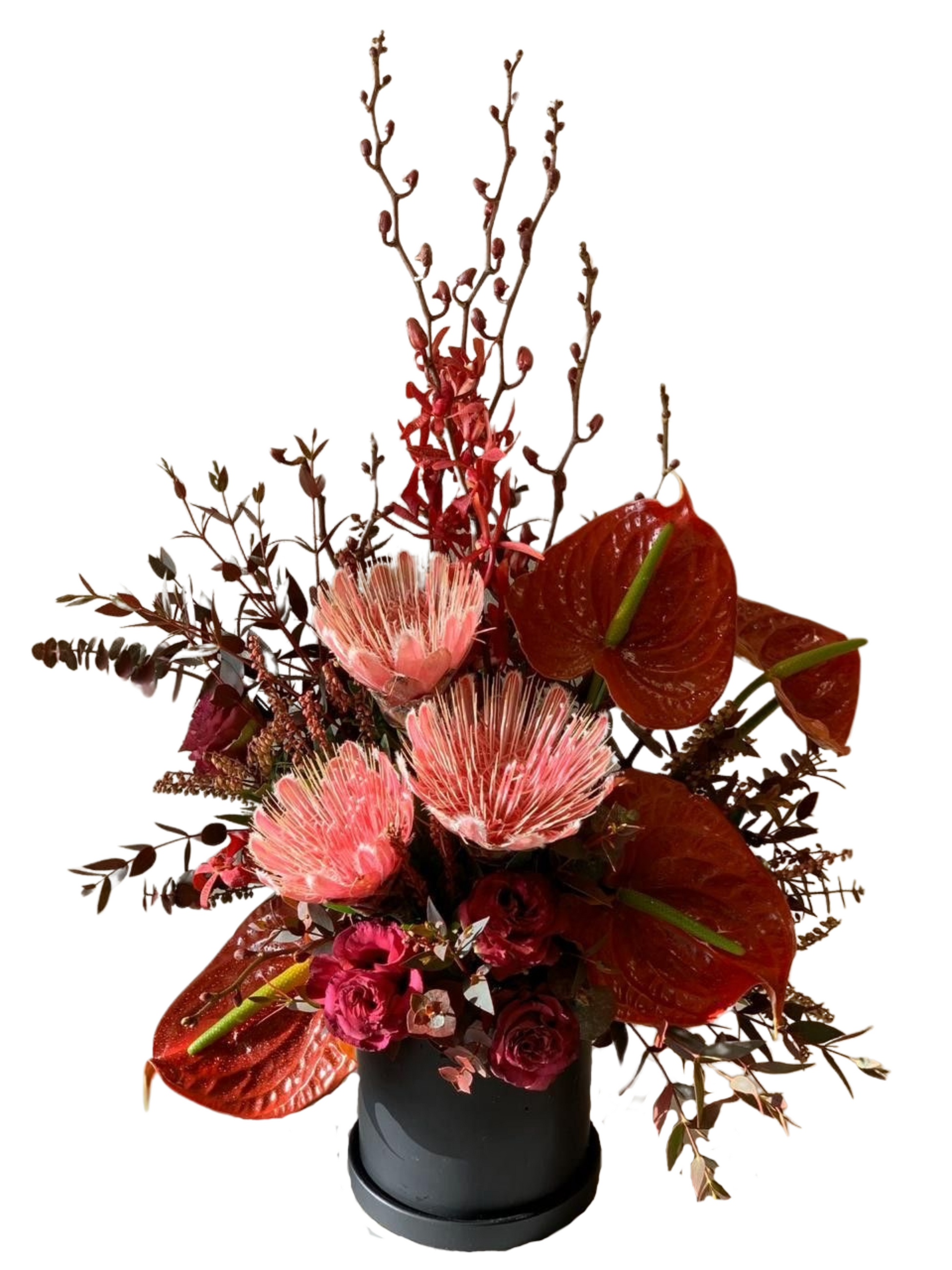 This bouquet is proof that the simplest things can make the biggest difference. Send it to someone who deserves every bloom of it. The box contains elegant Anthurium, vibrant Protea, lush Eucalyptus, delicate Orchids, and a special touch of Est No.