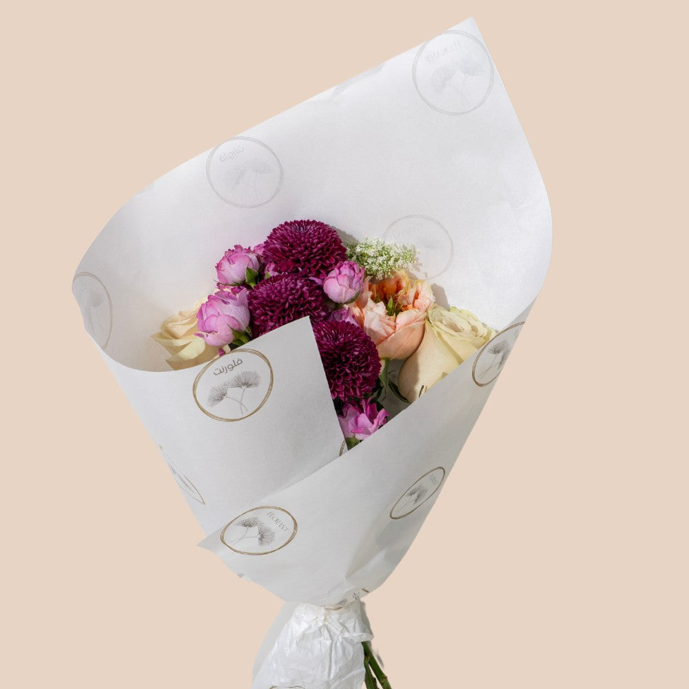 Deep magenta chrysanthemums paired with soft pink ranunculus, peachy lisianthus, and ivory roses. Artfully arranged with delicate waxflower accents and fresh foliage, wrapped in our signature Florant branded paper. Embrace the rich color contrast and textural beauty of this vibrant arrangement.