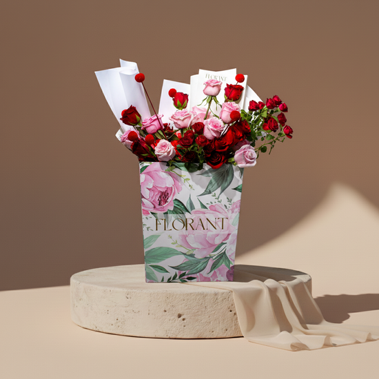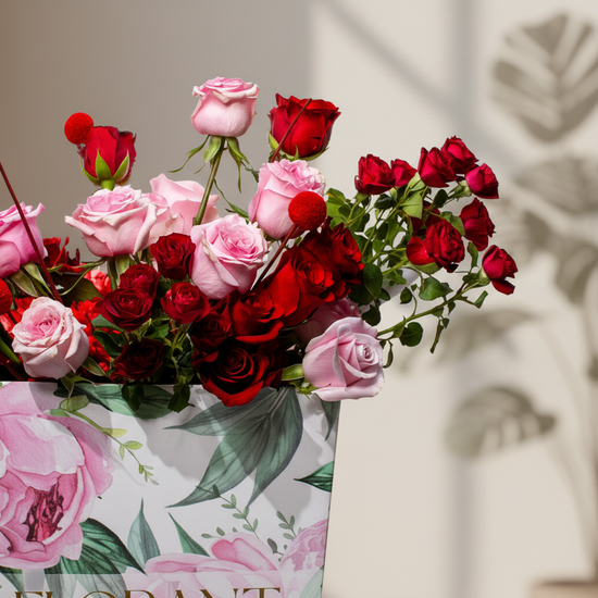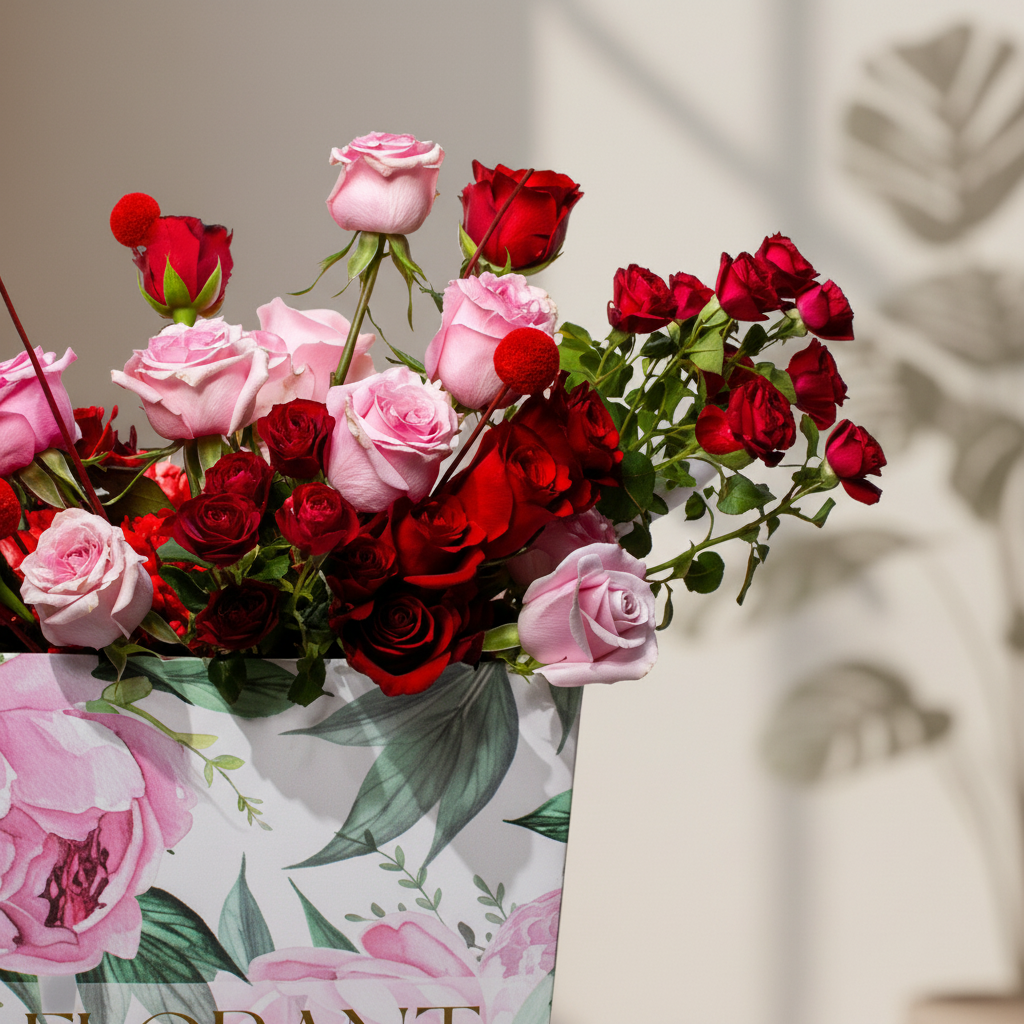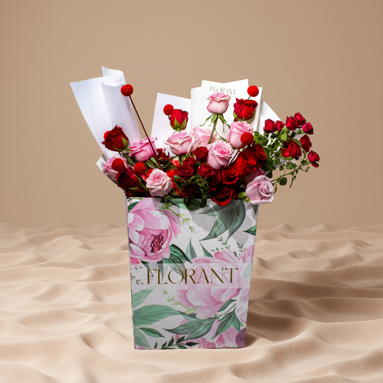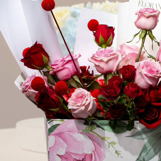 Red is a universal language of love, but when it meets soft pink and playful pompom balls, it becomes a modern love story. This arrangement says "I love you" in a classic way but with fresh spirit. Small spray roses whisper feeling's details, and design balance reflects true relationship balance.