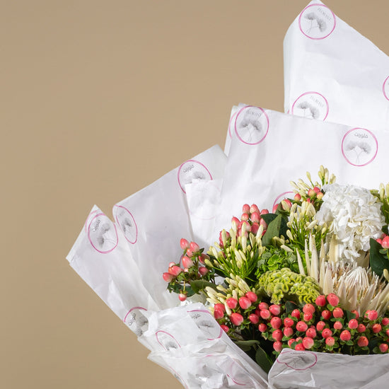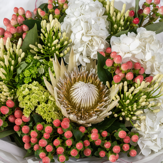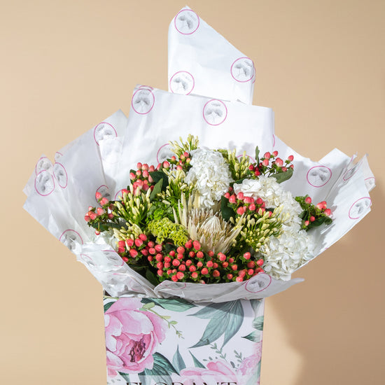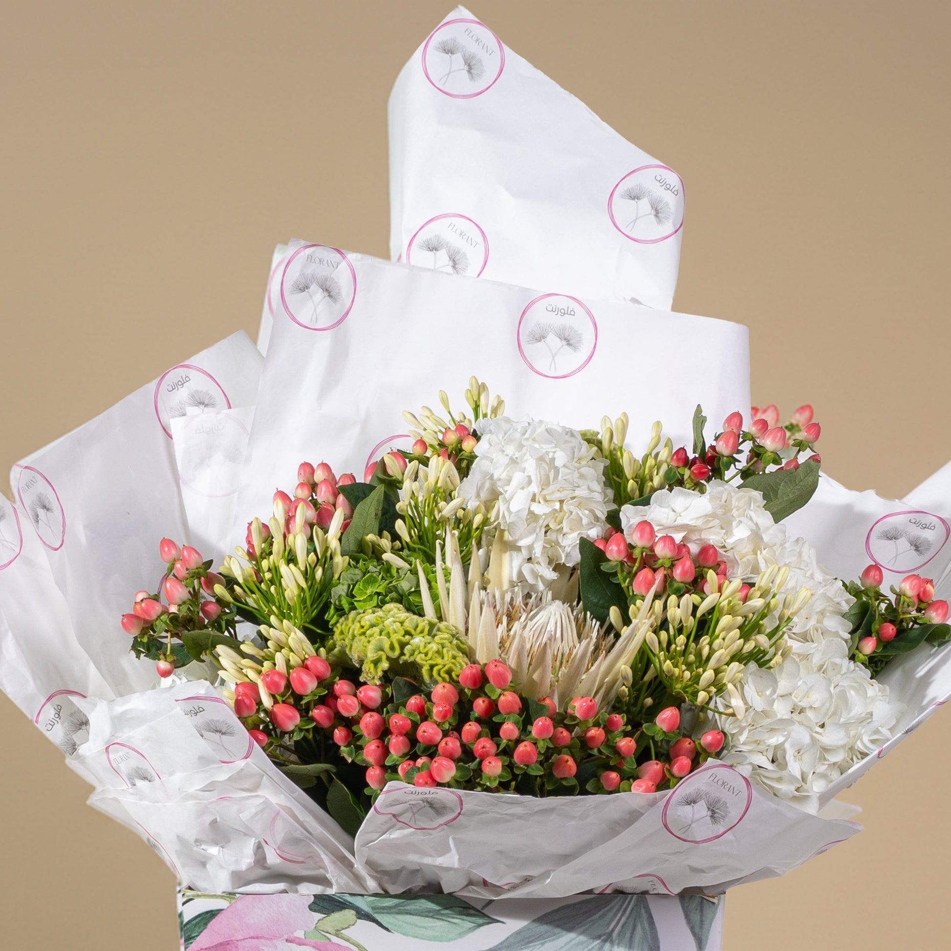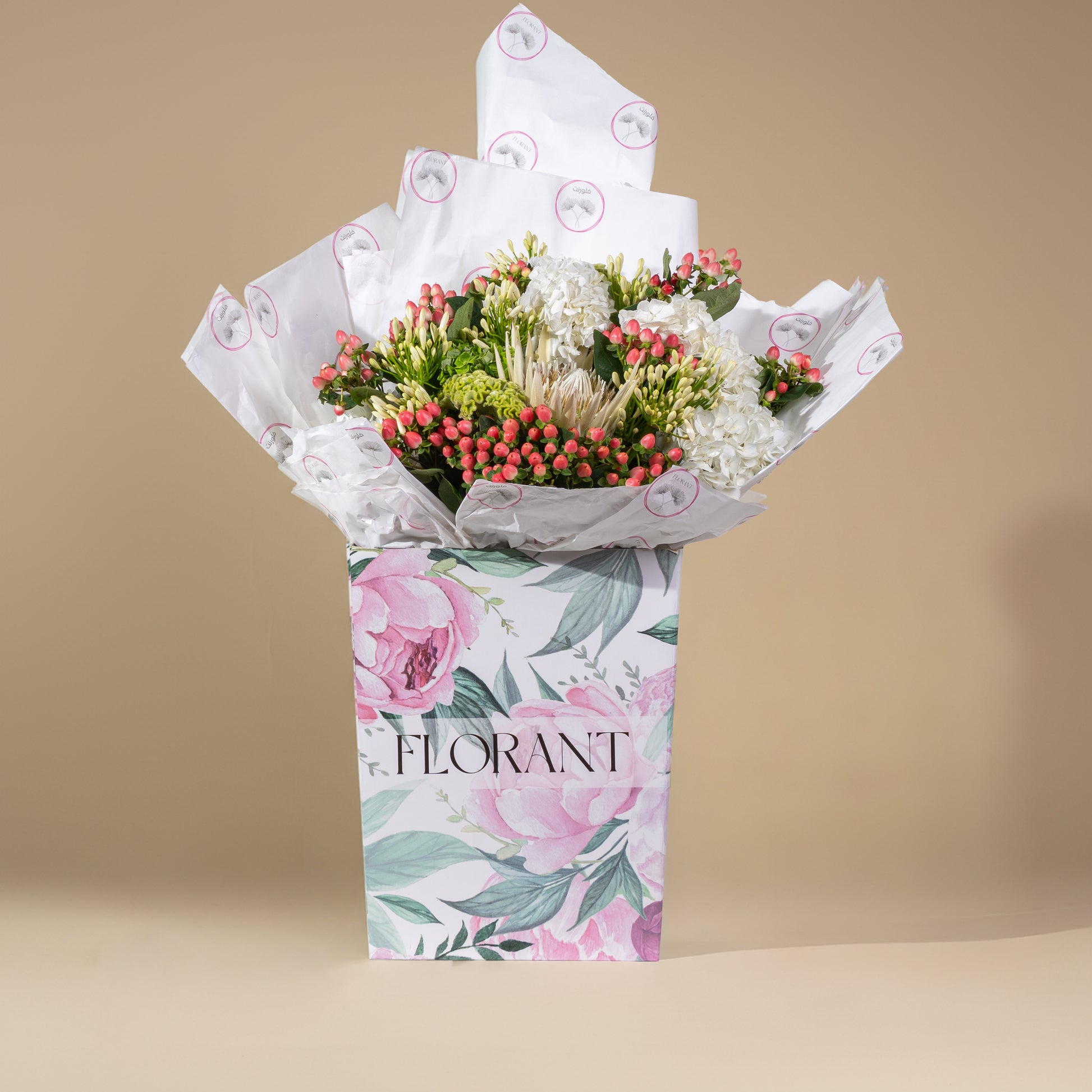 A lovely Florant bouquet in a floral box, featuring white hydrangeas and pink berries, suitable for any occasion.