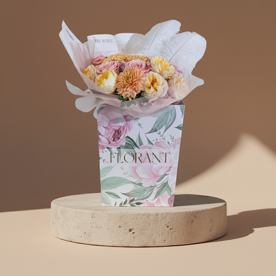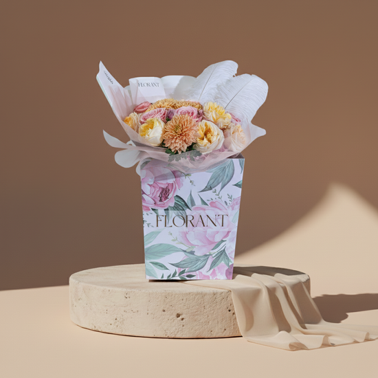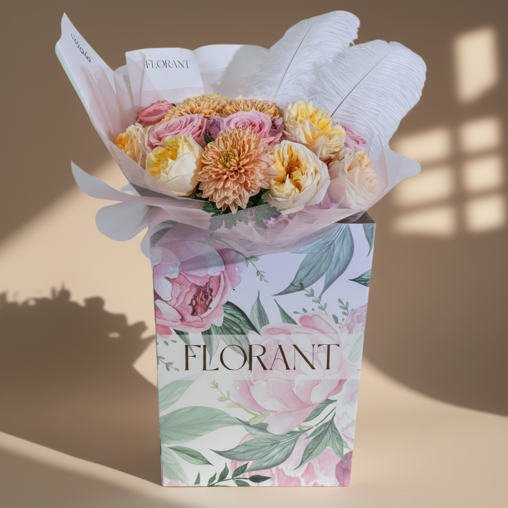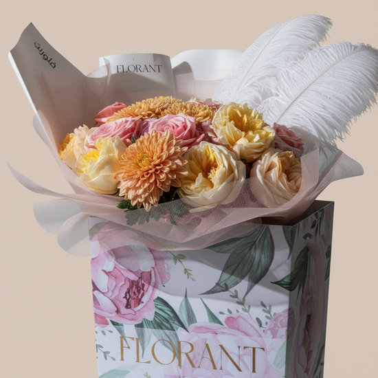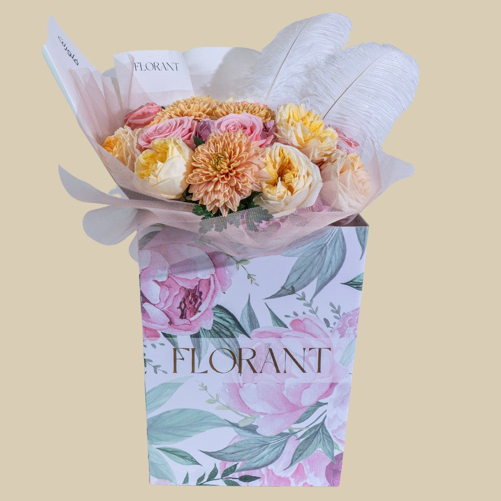 Peachy chrysanthemums paired with soft pink roses, buttery yellow garden roses, and delicate lavender spray roses. Artfully arranged with dramatic white feather accents, wrapped in our signature tulle layers. Presented in our exclusive Florant botanical designer box. Embrace the whimsical elegance and romantic charm of this extraordinary arrangement.Arrangement illustrated is our "Large"