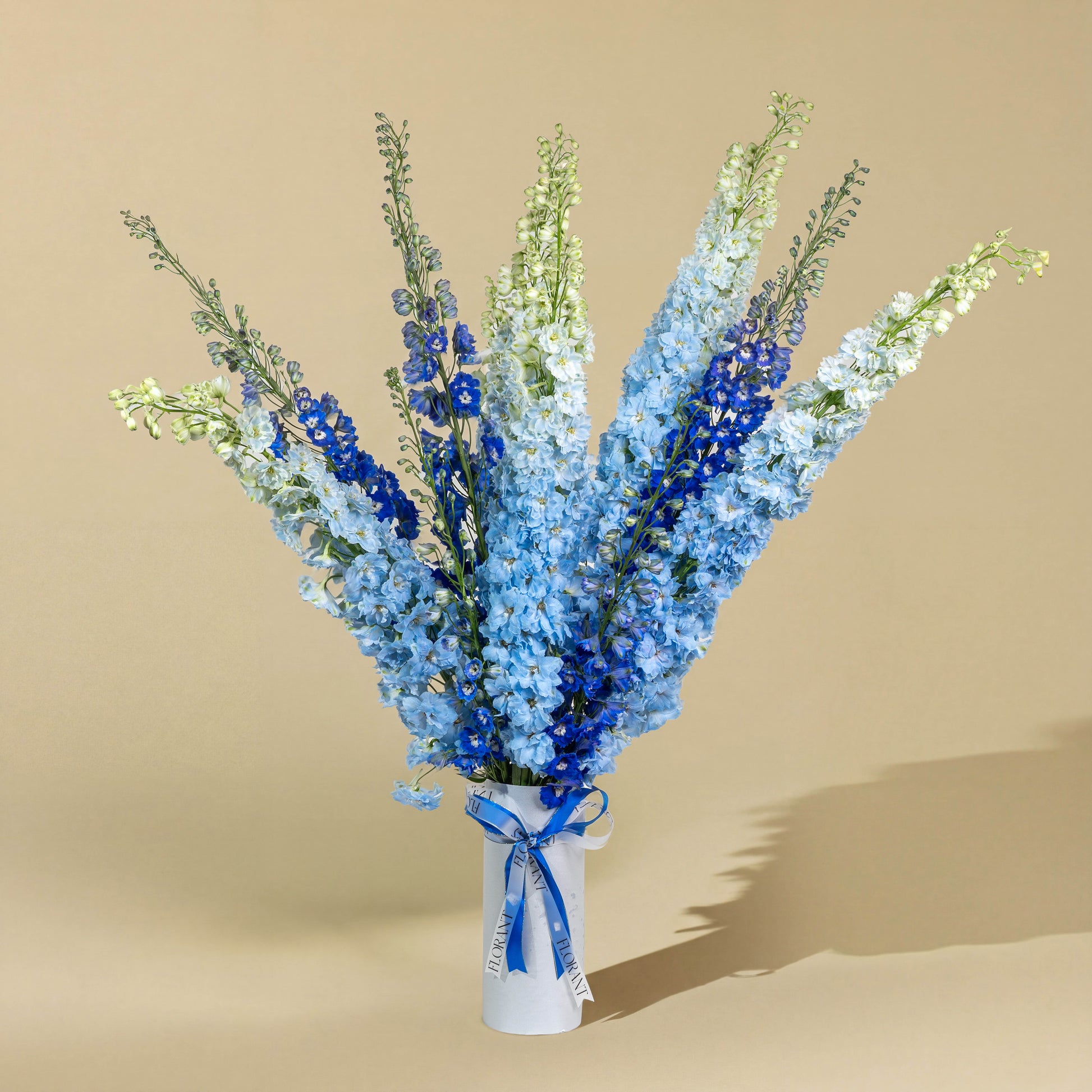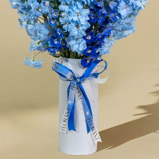 A tall floral arrangement in harmonious blue tones, designed to stand out with elegance and calm. A perfect choice for refined gifts and special occasions.