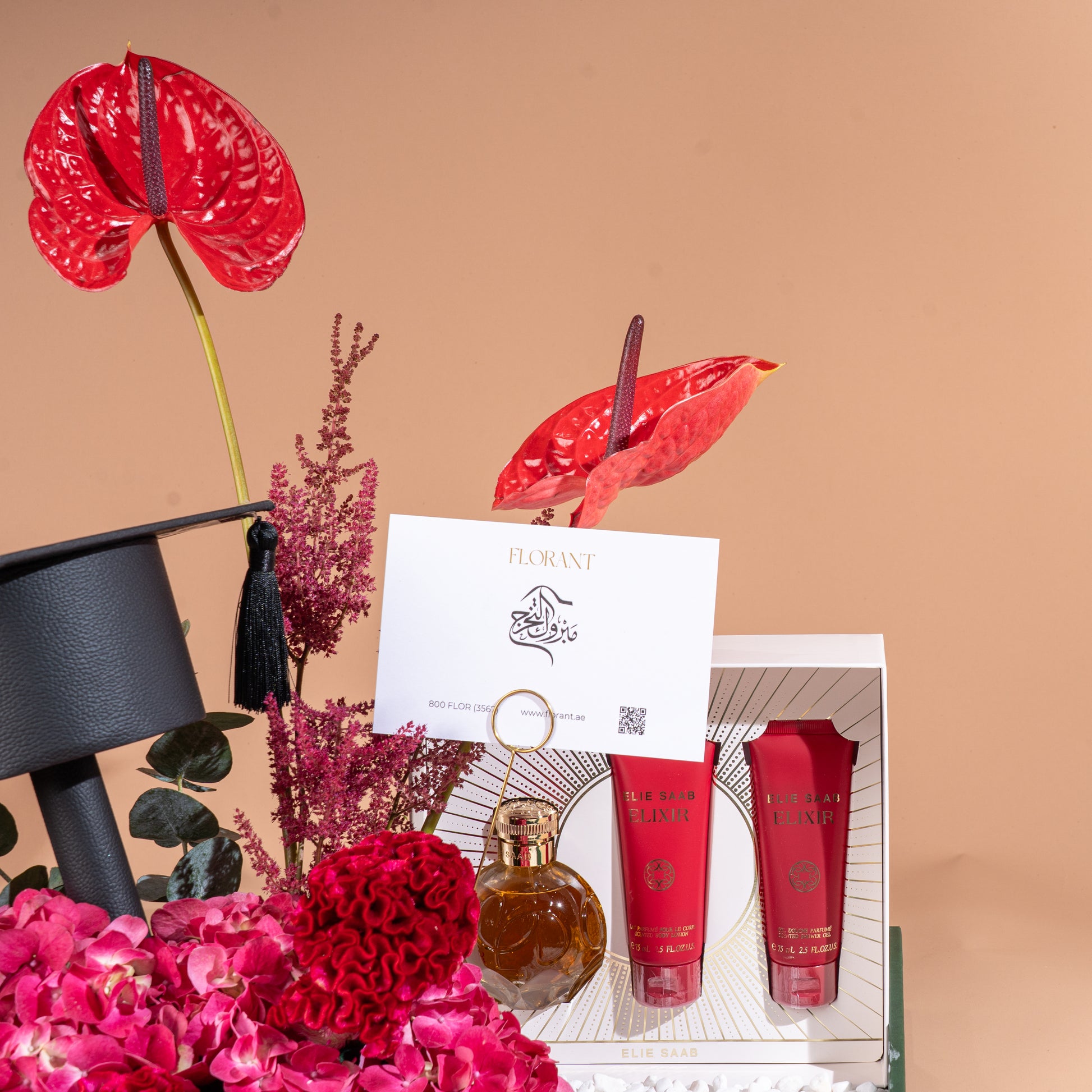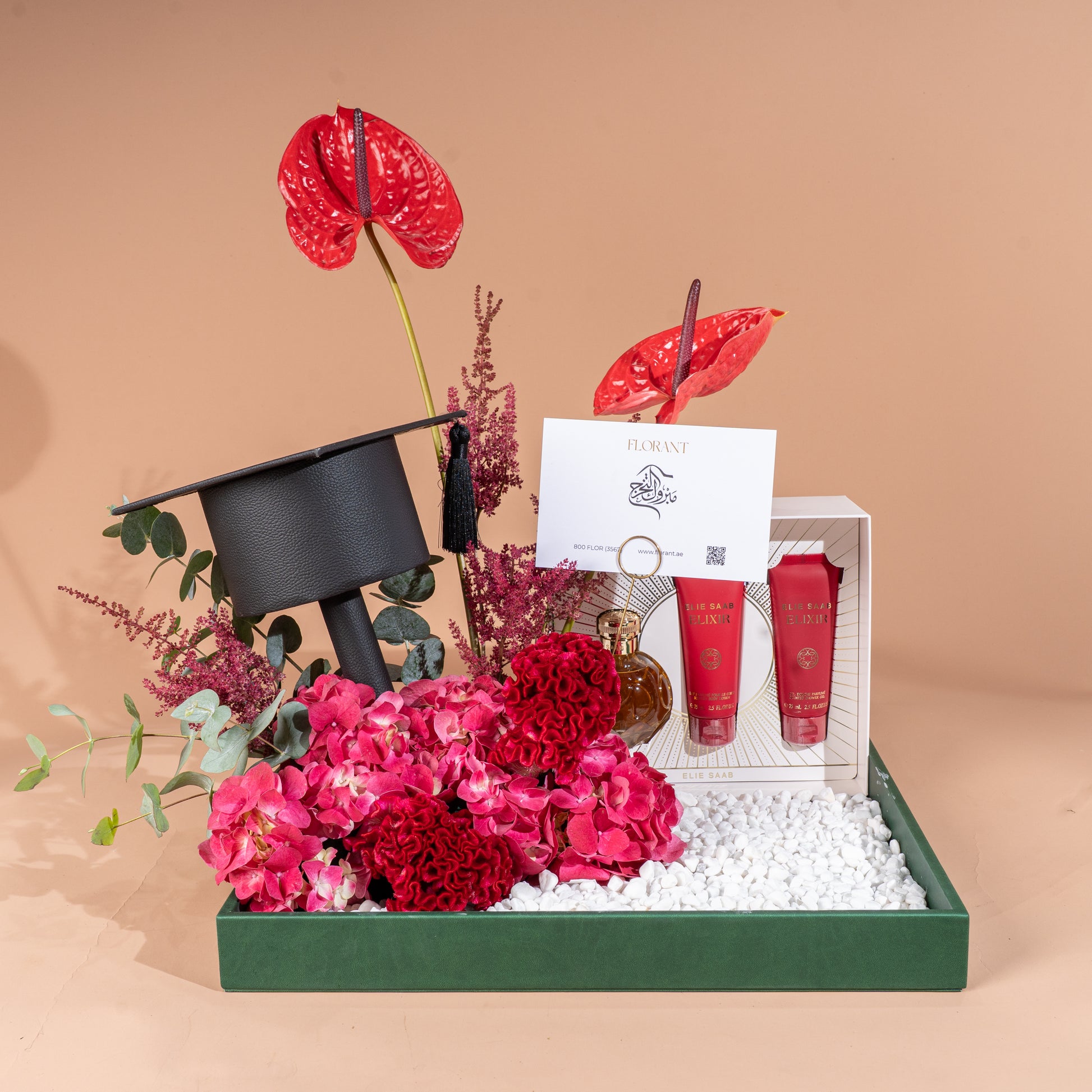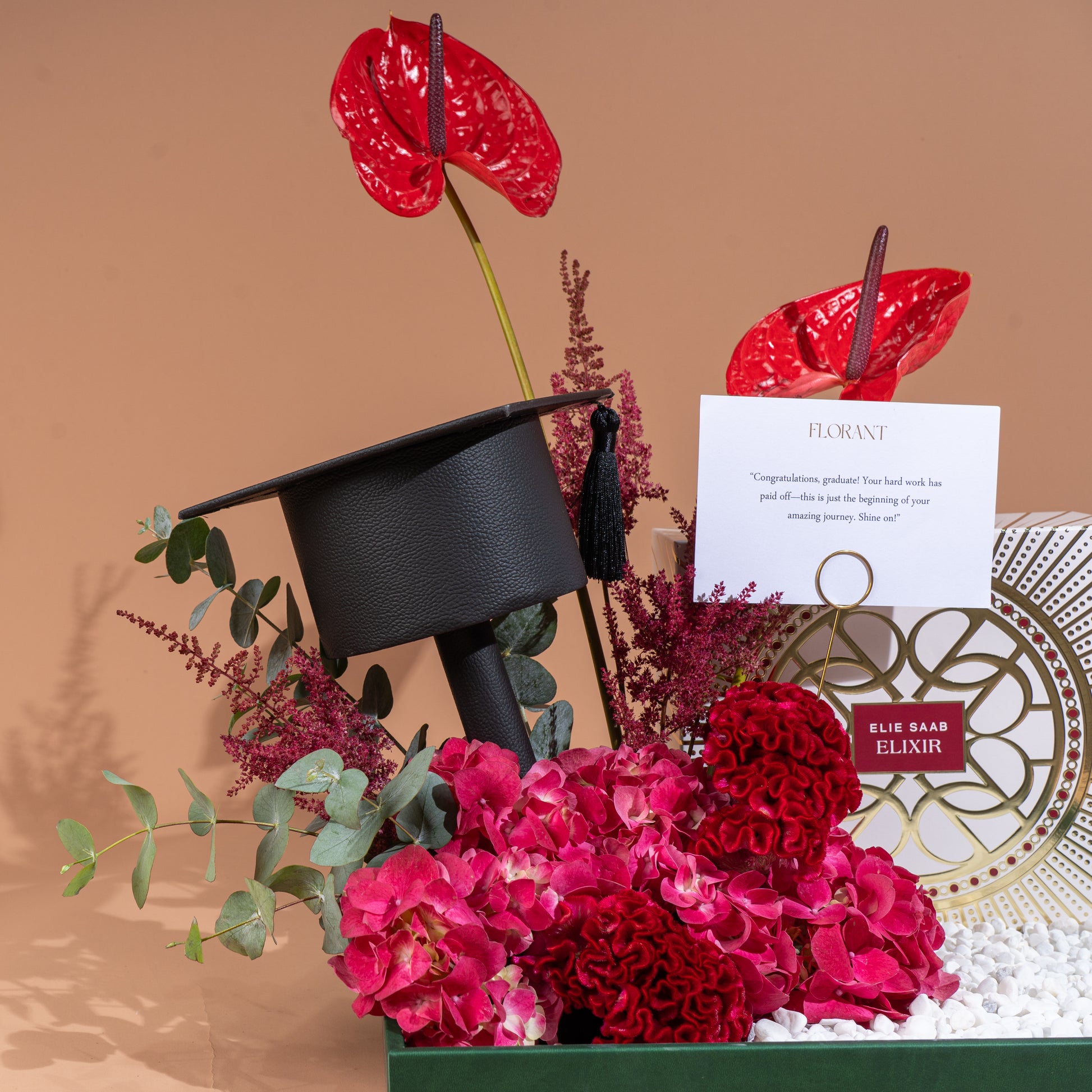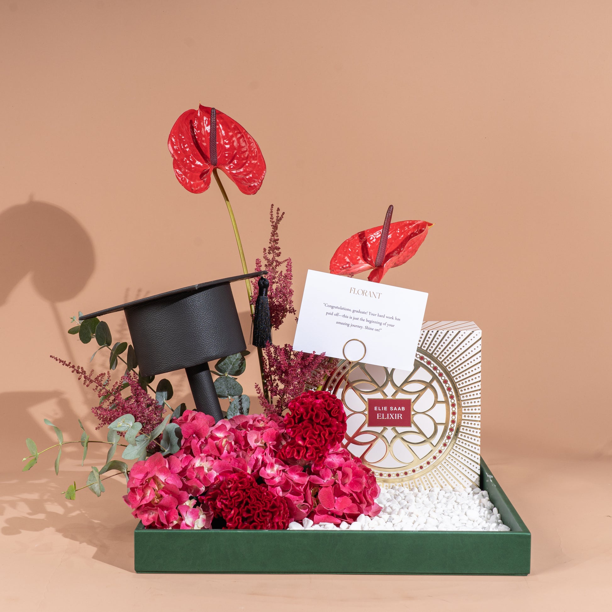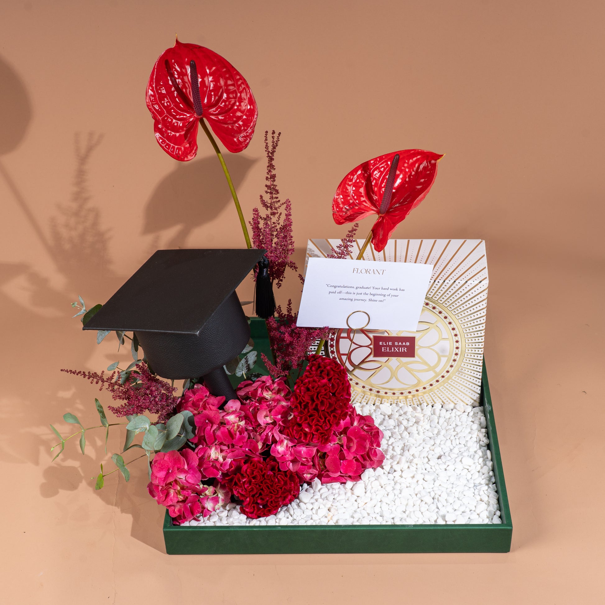 A luxurious graduation tray that blends elegance and celebration, featuring vibrant red flowers, a graduation cap, and a signature Elie Saab fragrance set—an all-in-one gift that reflects pride and achievement.