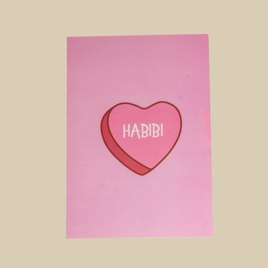 A charming pink card featuring a candy-heart design with the word “Habibi” — meaning my love in Arabic. Sweet, fun, and effortlessly romantic, this card adds a personal Middle Eastern touch to any floral or gift arrangement.