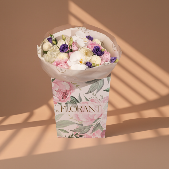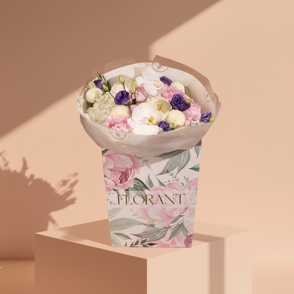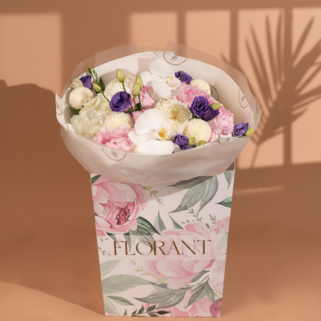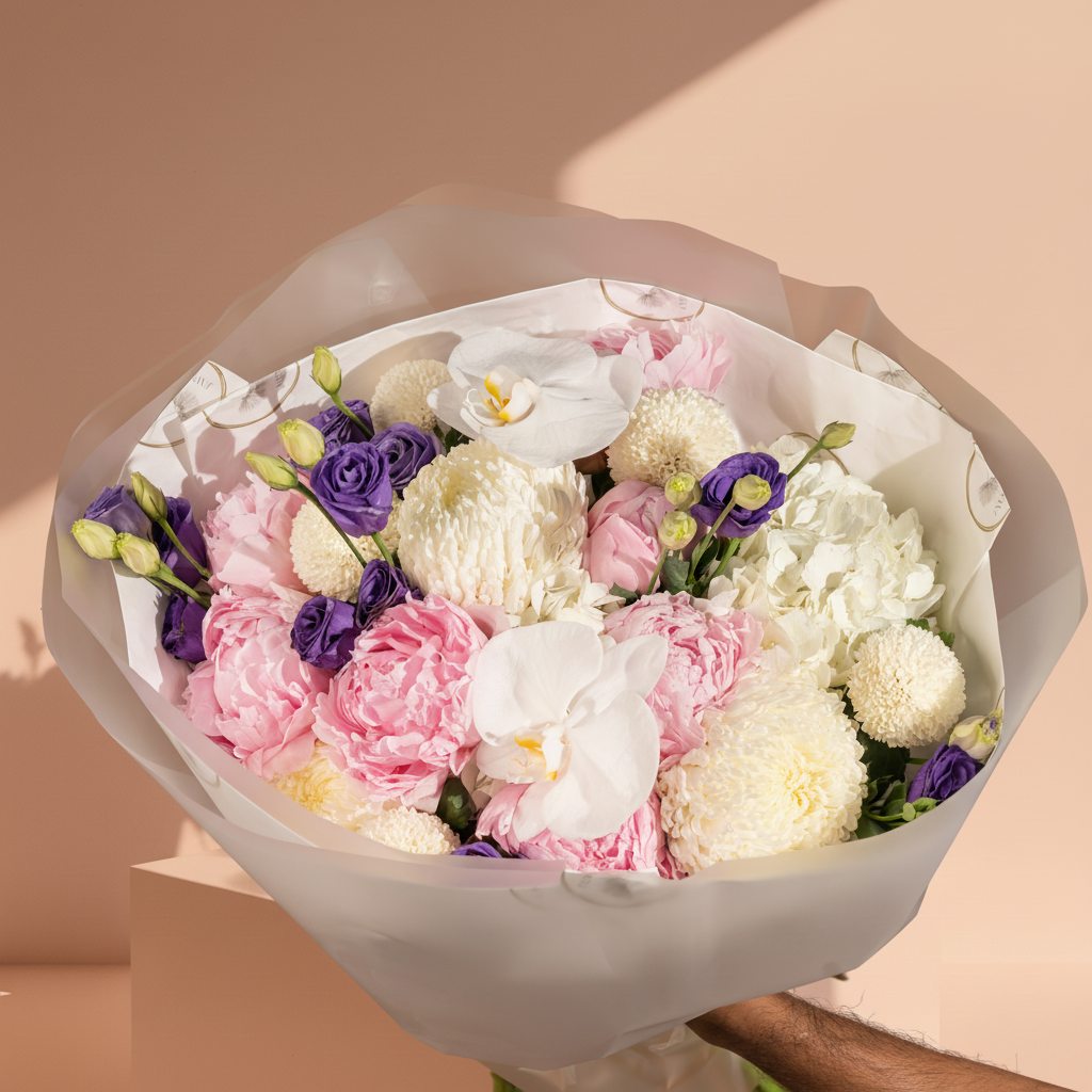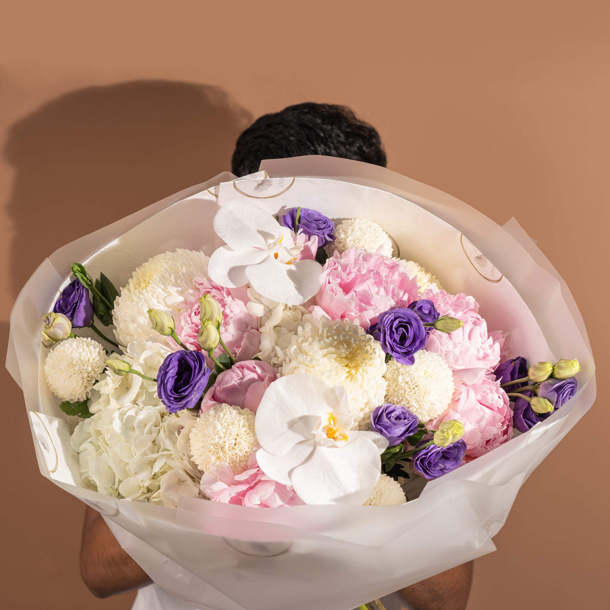 Purity has a special taste when it comes in multiple colors. White orchids embrace deep purple, pink hydrangea adds dreamy softness, and white chrysanthemums fill spaces with gentle light. Purple lisianthus adds depth to the calm design. This bouquet says "beauty needs no noise," perfect for those who understand that true strength lies in tranquility.