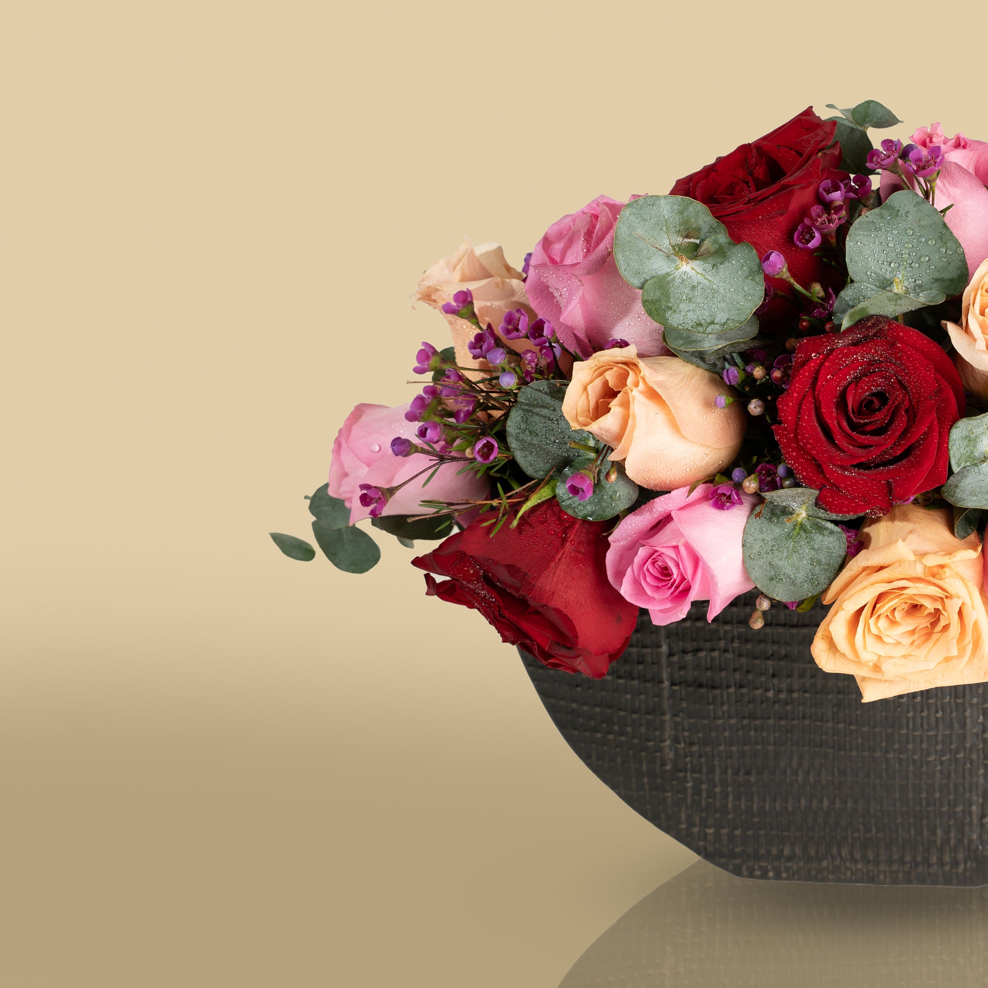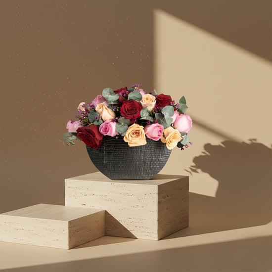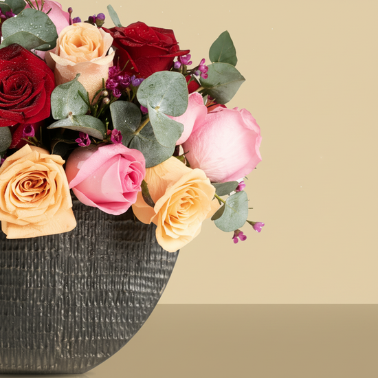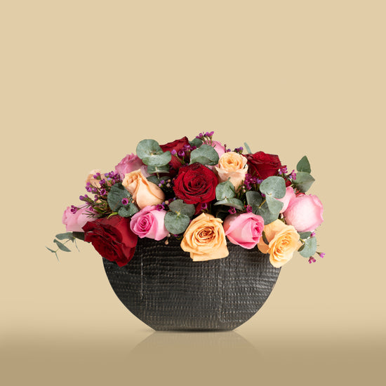 A luxurious arrangement of red, pink, and apricot roses, accented with green foliage and delicate purple blossoms, presented in an elegant black textured vase that reflects romance and warmth.