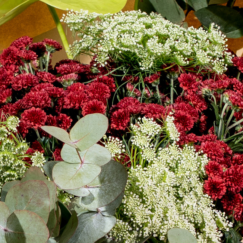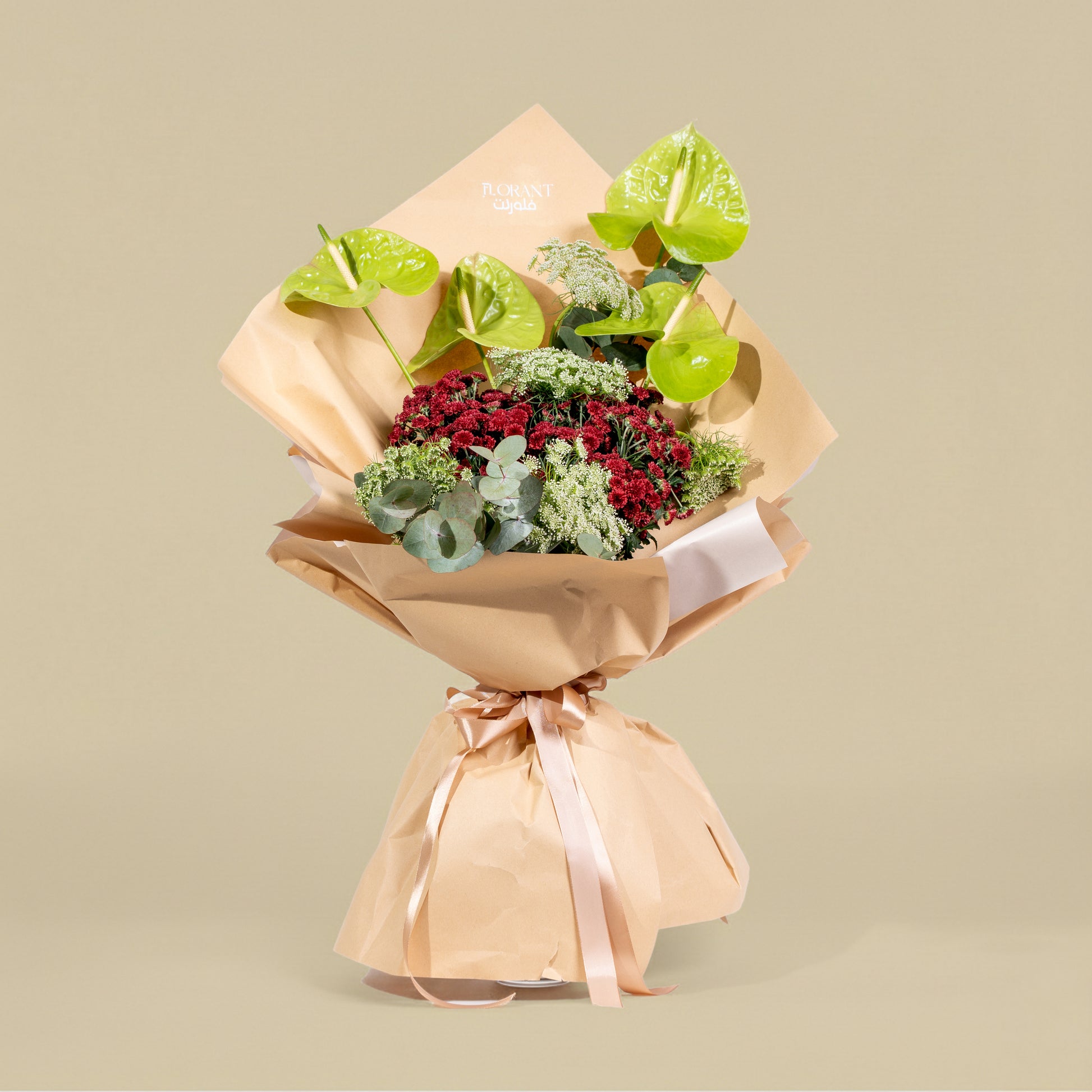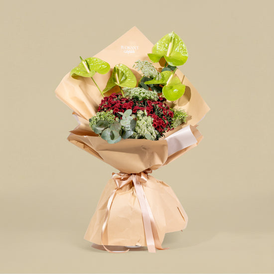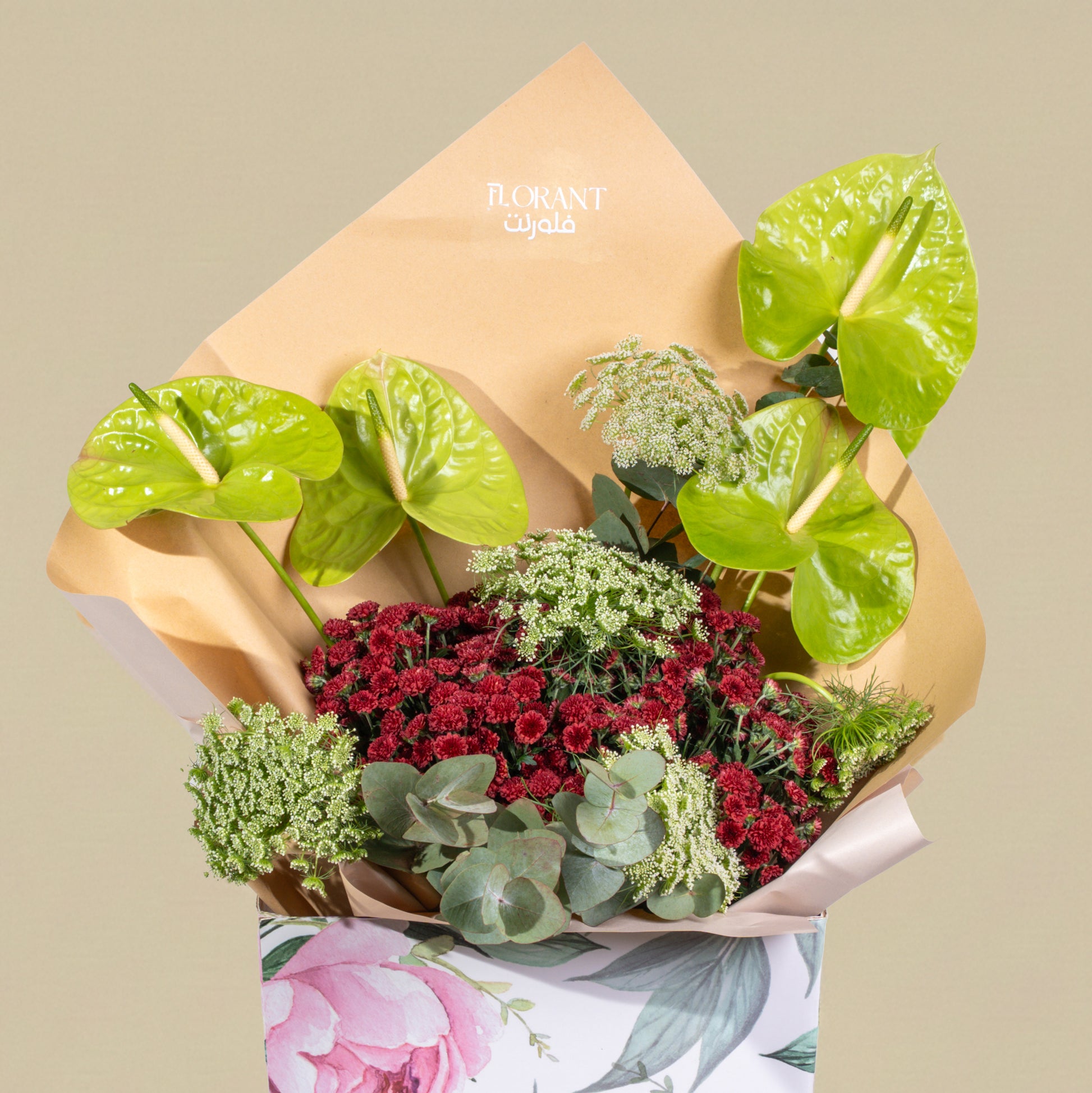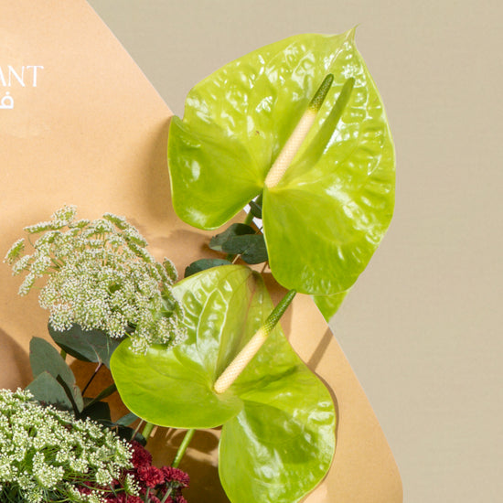 A sophisticated blend of exotic green Anthuriums and rich crimson blooms, accented with fresh Eucalyptus. Elegantly presented in a signature floral bag, making it a bold and stylish gift for any special occasion.