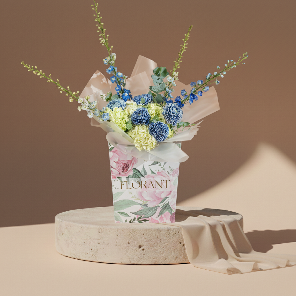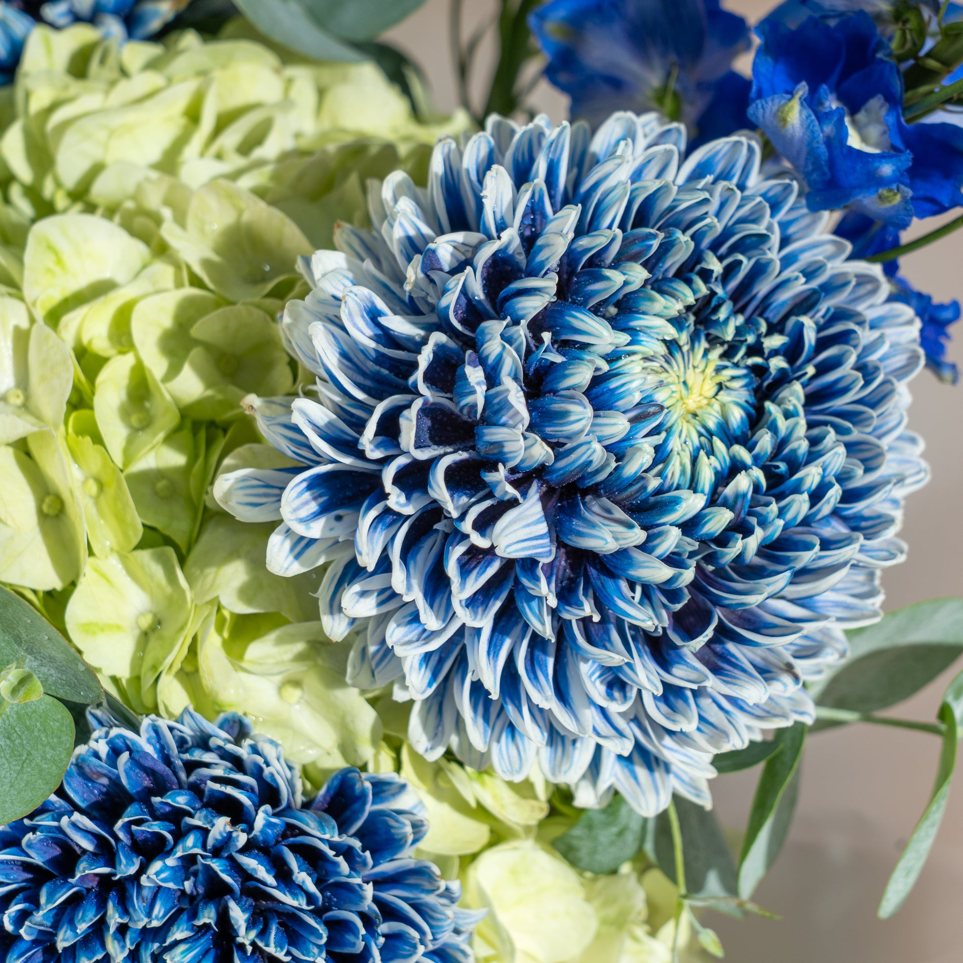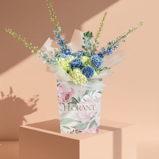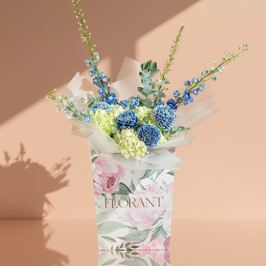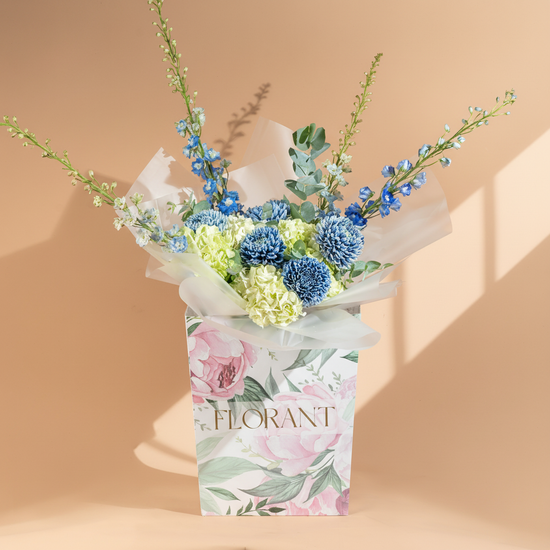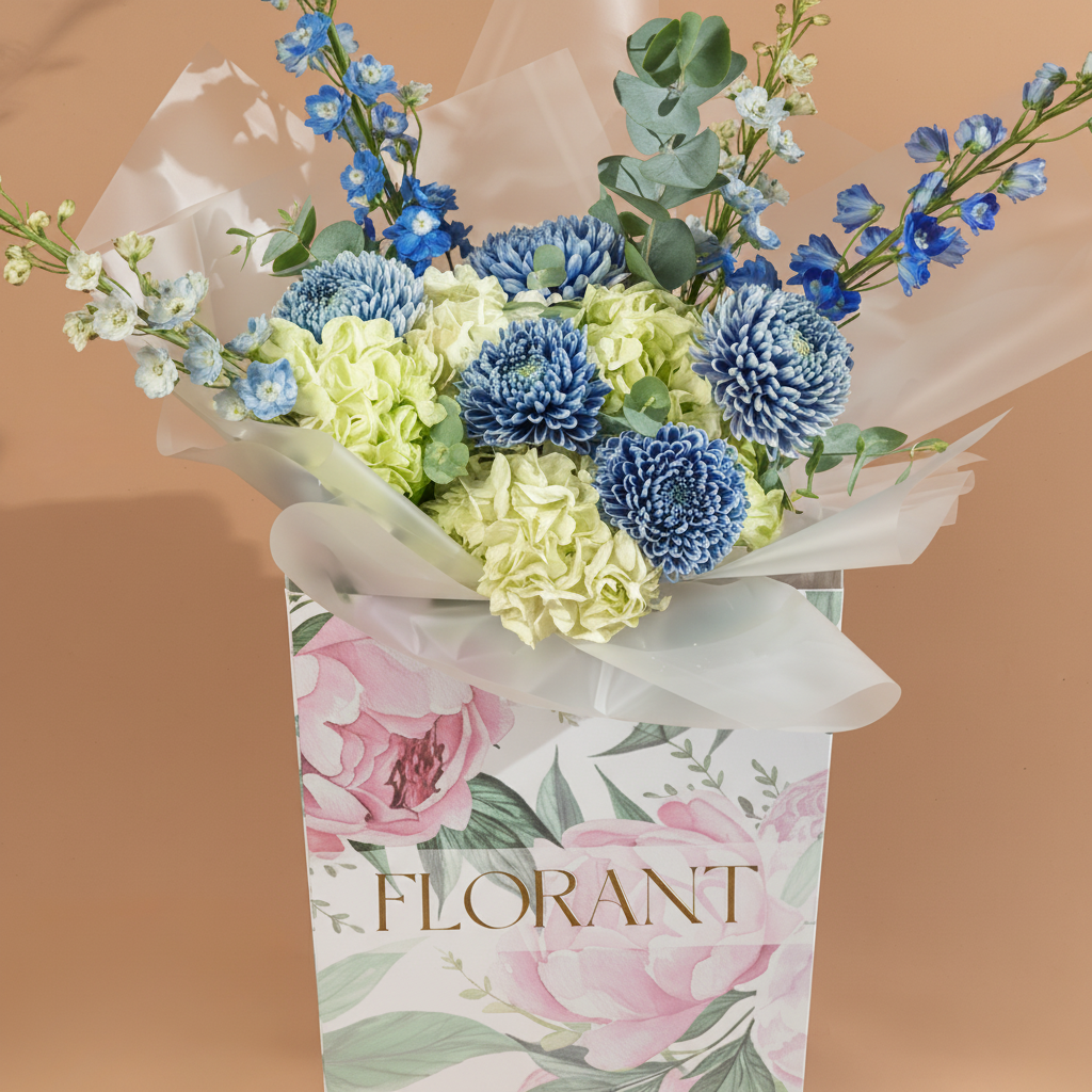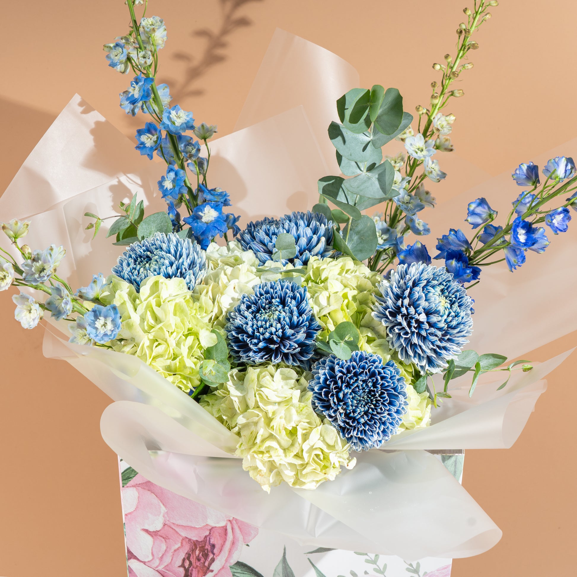 Sky met earth in one arrangement. Light green hydrangea represents calm nature, while blue chrysanthemums paint a canvas of clear skies. Delphinium rises confidently with white stock, and eucalyptus adds a breath of wild nature. Transparent white wrapping embraces this beauty like a soft cloud. For the person who loves calm colors but adores strong, impactful designs.