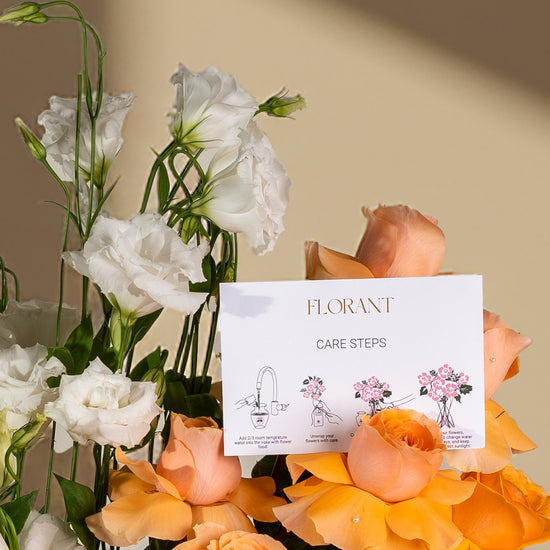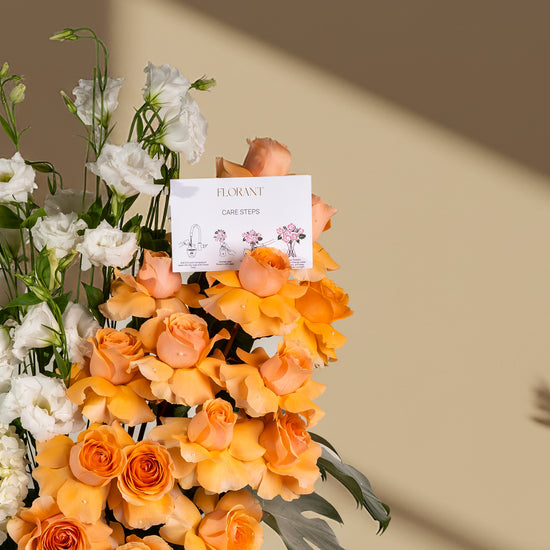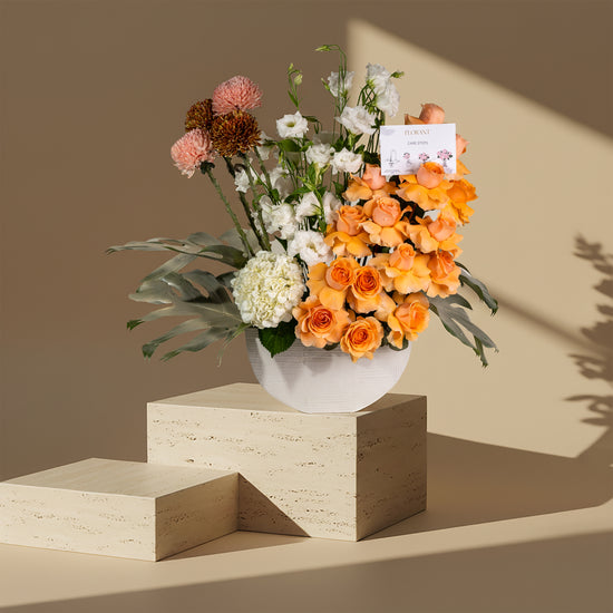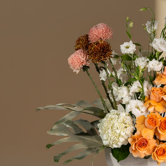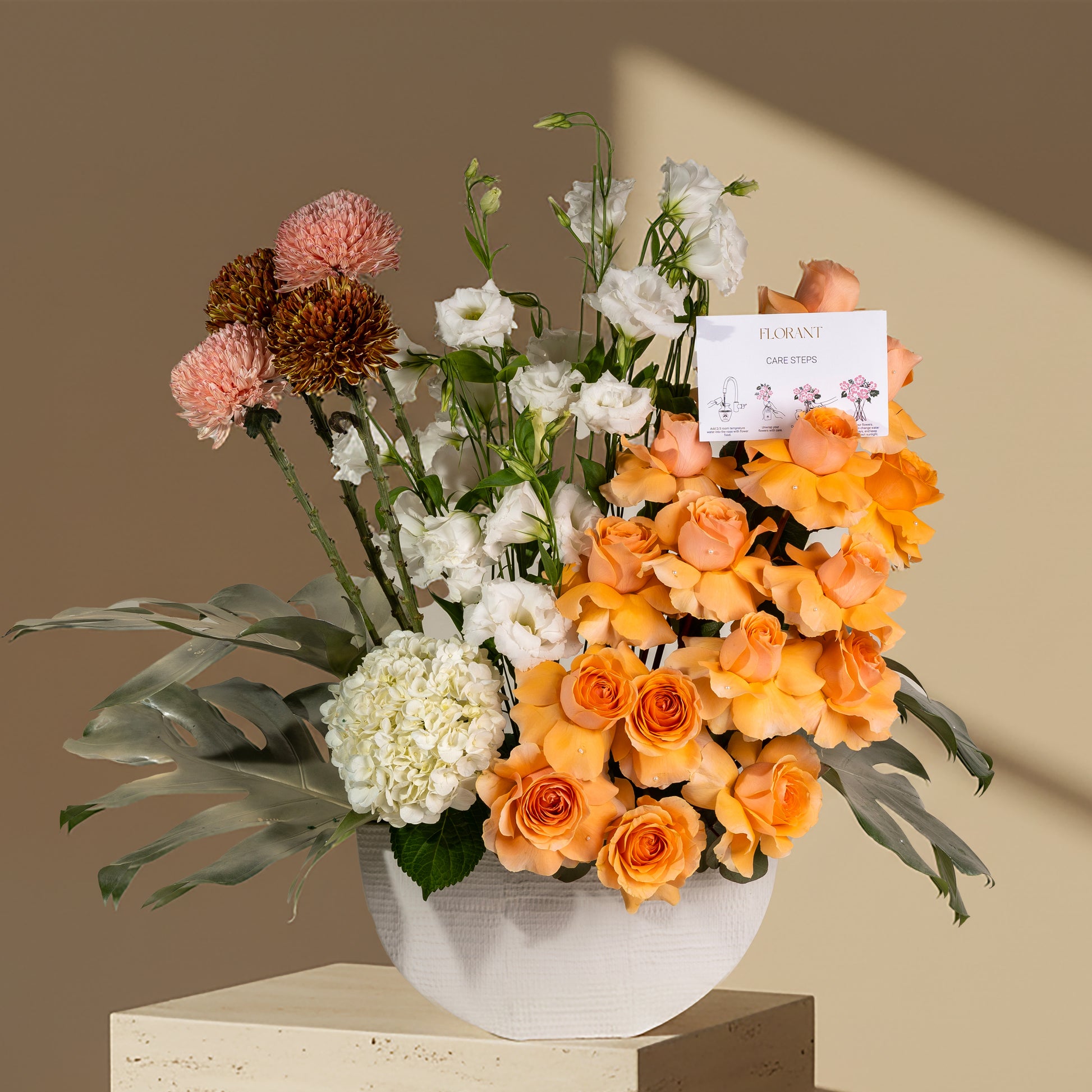 A breathtaking blend of peach roses, pristine white lisianthus, exotic pink protea, and delicate hydrangea, complemented by elegant tropical foliage. Artfully arranged in a modern ceramic vase and complete with care instructions. Perfect for making a lasting impression.