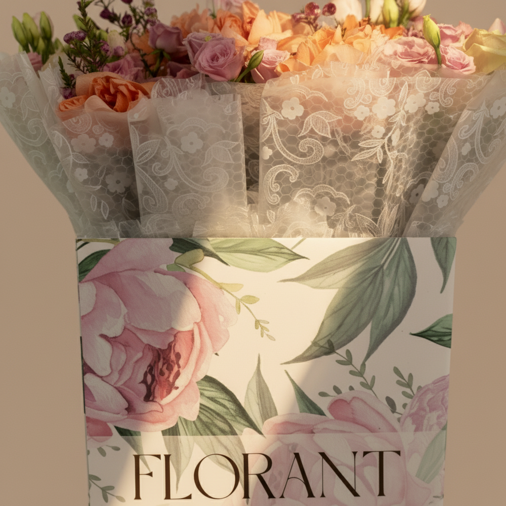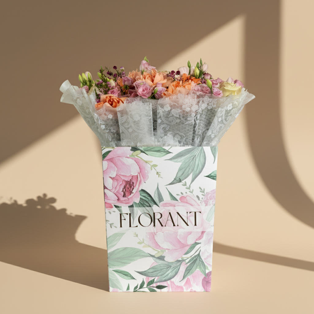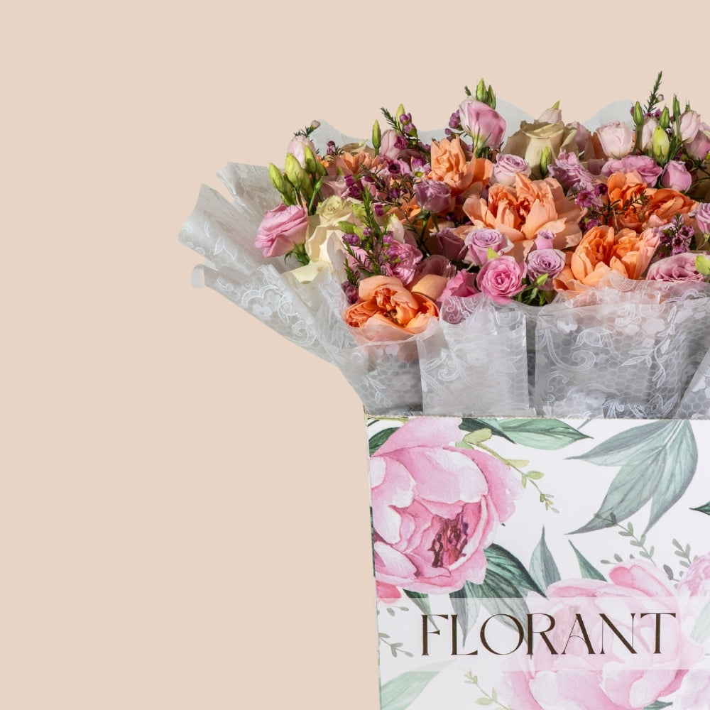 Garden roses in warm apricot tones, elegantly paired with delicate lavender spray roses and creamy blooms. Artfully arranged with seasonal waxflower and foliage, creating a harmonious blend of peachy coral and dusty mauve hues. Presented in our exclusive Florant designer box with signature botanical wrapping. For those who truly appreciate the art of floristry.