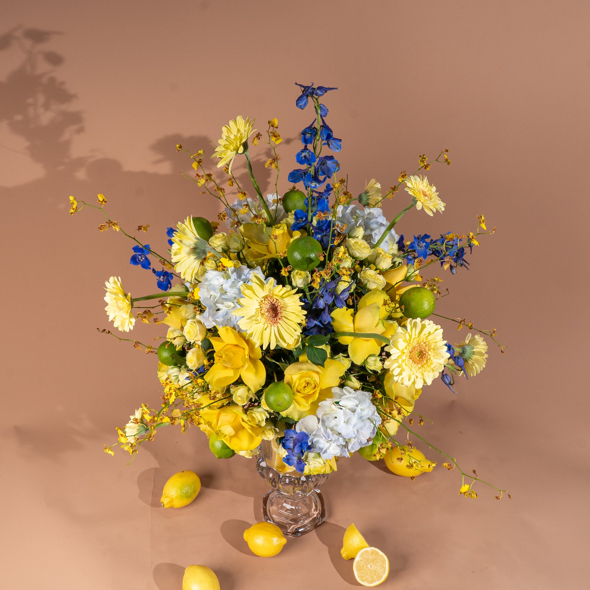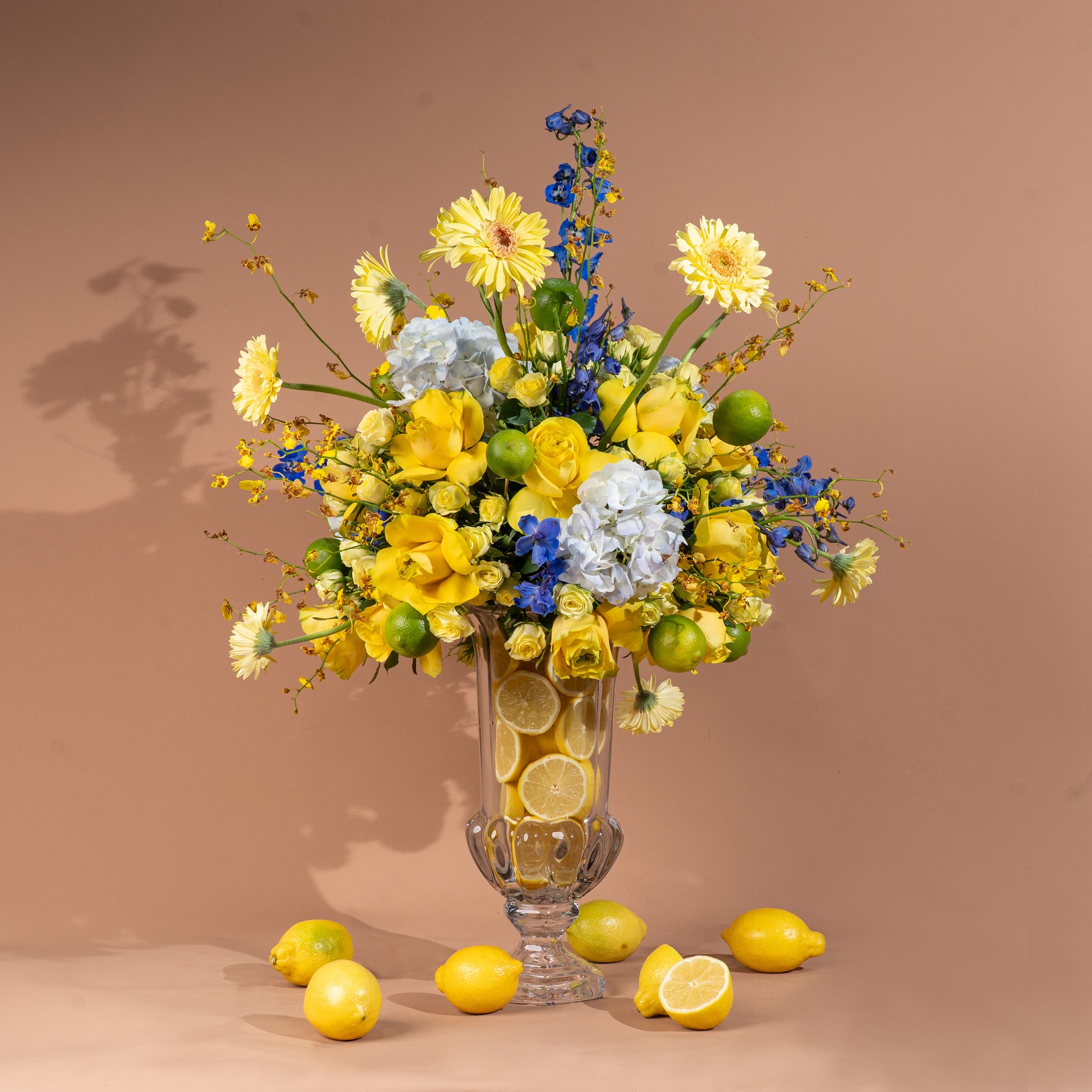 A vibrant summer floral arrangement blending fresh yellow and calm blue tones, accented with natural lemons for a refreshing, elegant touch.