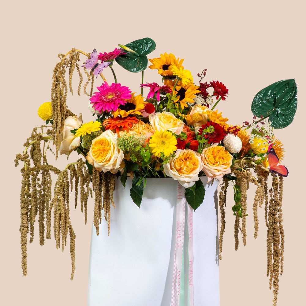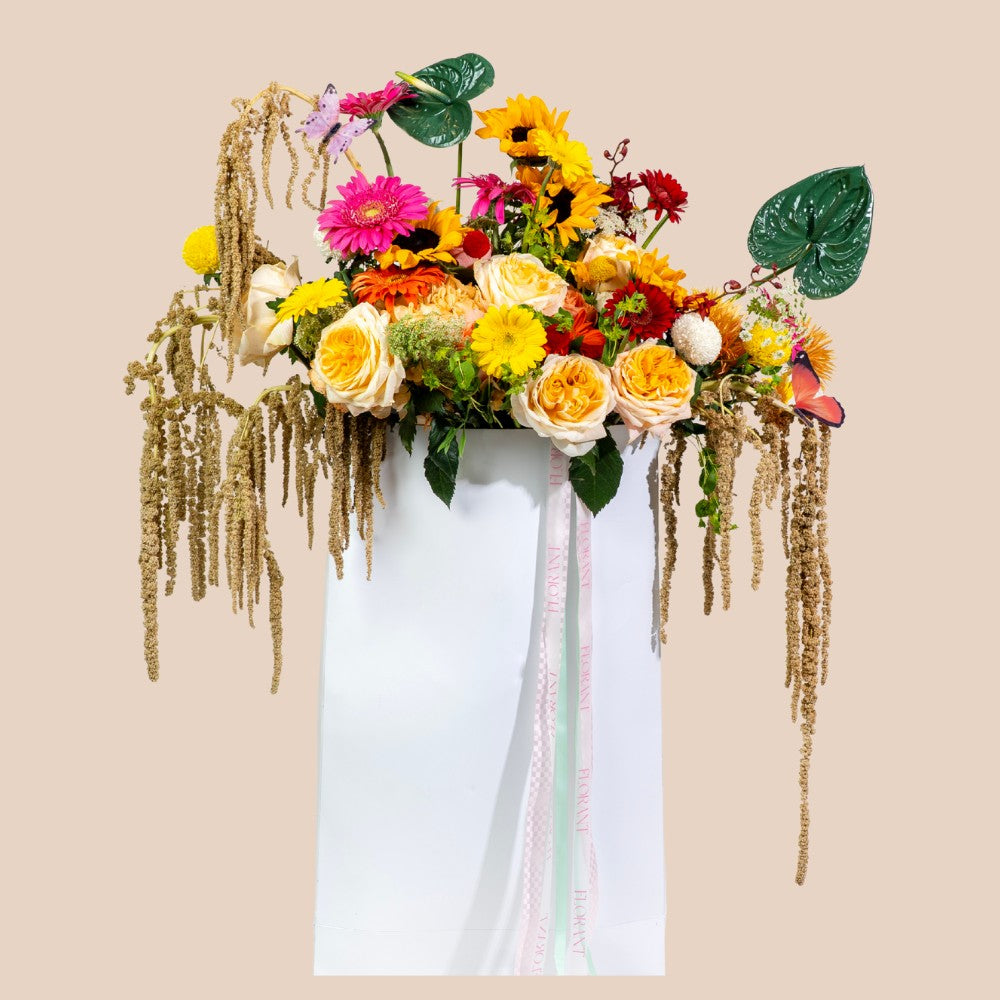 A vibrant and cheerful mix of Gerberas in fuchsia pink, yellow, orange, and red creates a joyful burst of color, beautifully complemented by the delicate elegance of spider Gerbera in peach. Paired with soft peach Ecuador roses, this arrangement brings a perfect balance of boldness and sophistication —ideal for uplifting spaces or celebrating heartfelt moments.