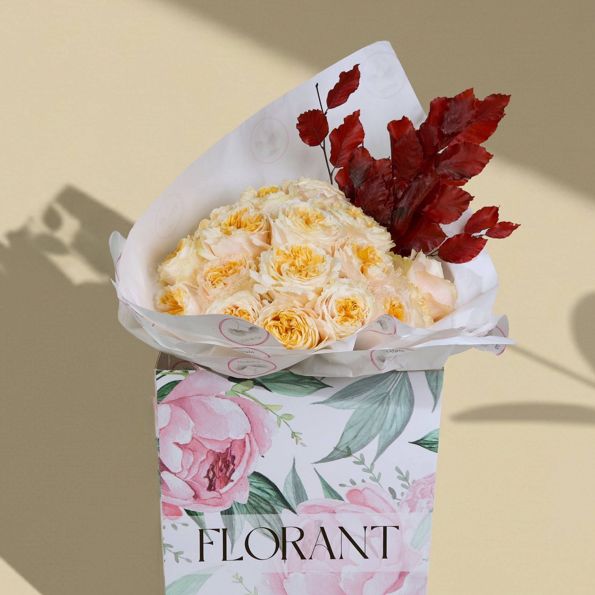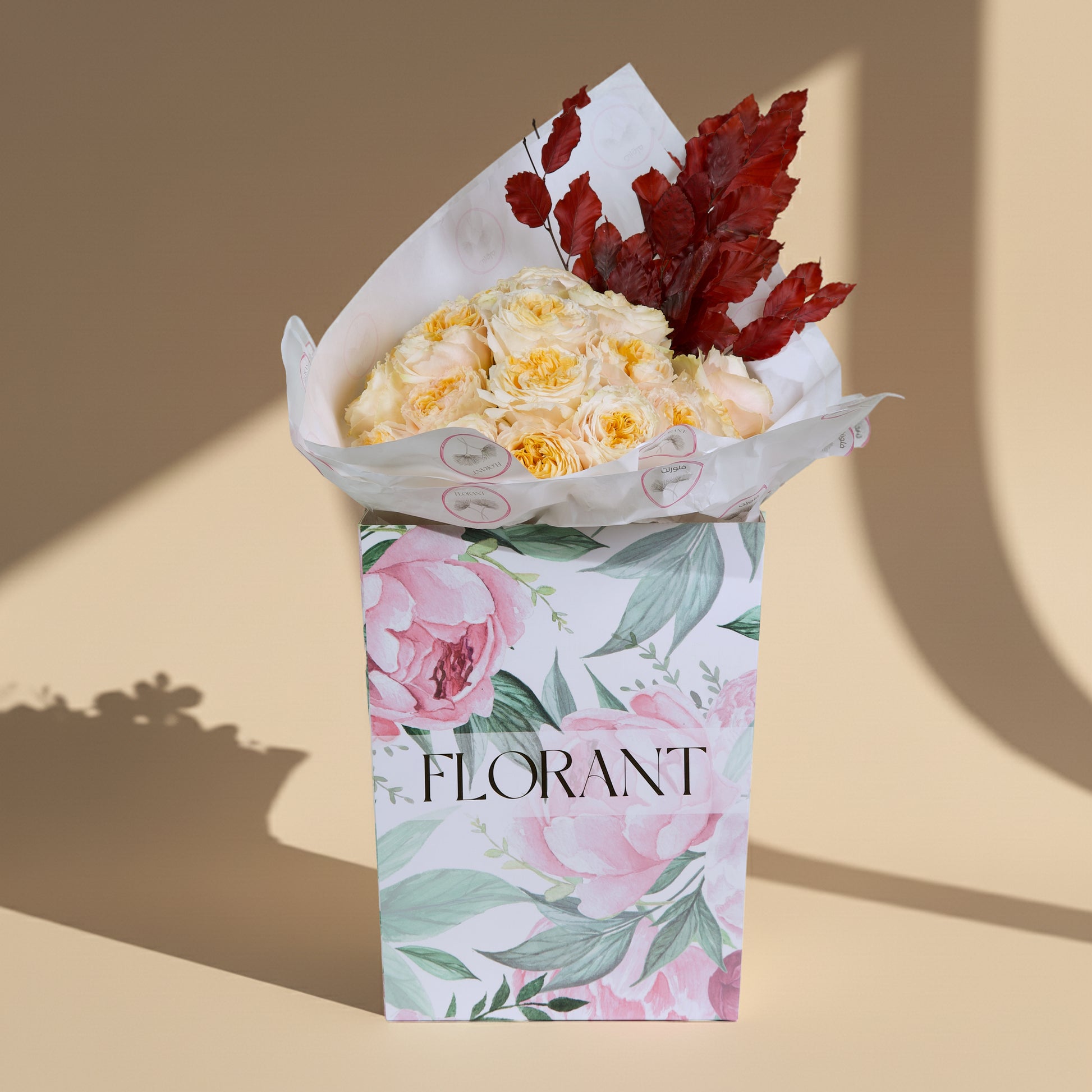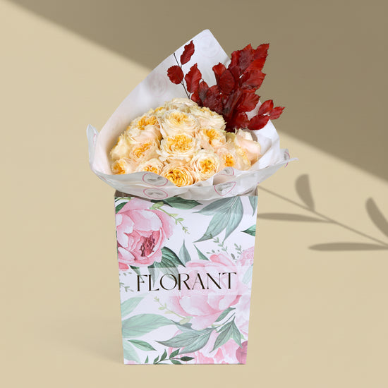 Creamy peach Ecuador roses paired with rich oak leaves, elegantly arranged in our signature floral box. A perfect way to celebrate special moments or bring a warm, natural touch to any space.