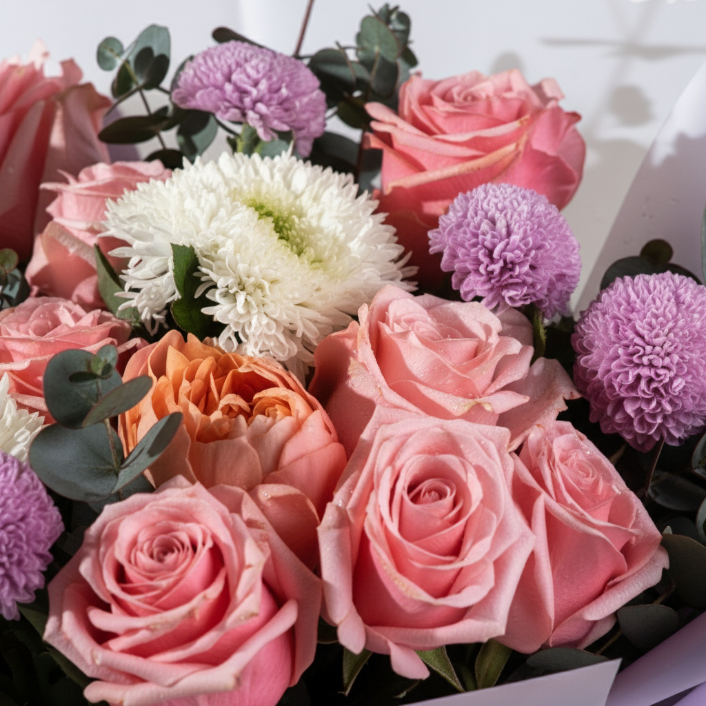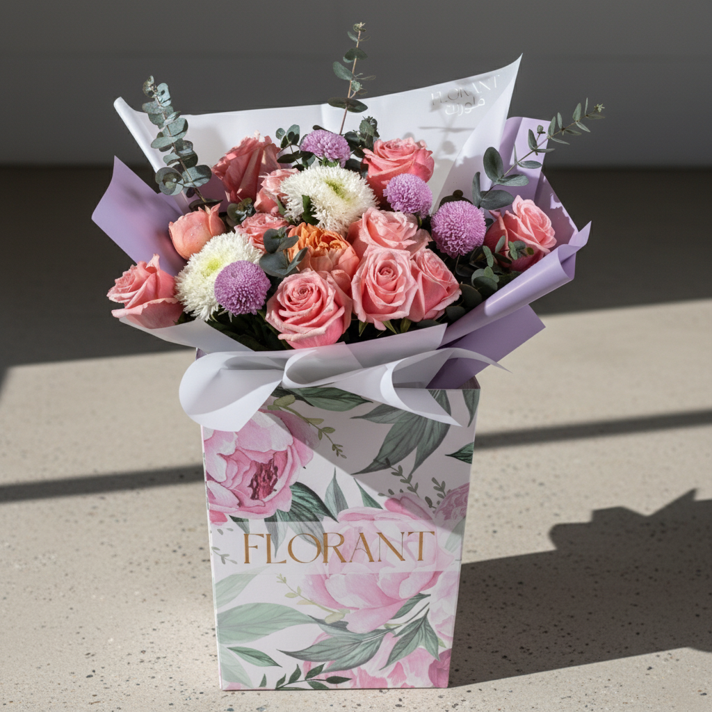 Soft pink roses beautifully complemented by crisp white disbud chrysanthemums and vibrant purple pom poms. Artfully arranged with fresh eucalyptus and seasonal foliage, wrapped in elegant lavender and white layers. Presented in our exclusive Florant designer box with signature botanical wrapping. A sophisticated blend of texture and color for those who appreciate refined floristry.