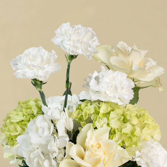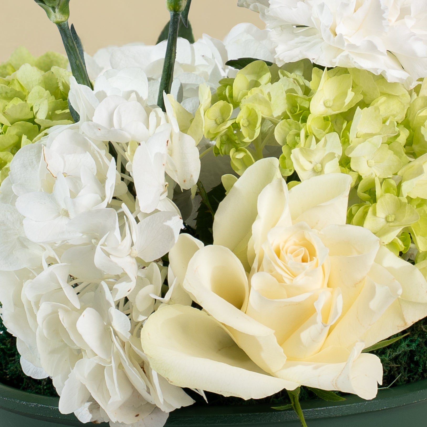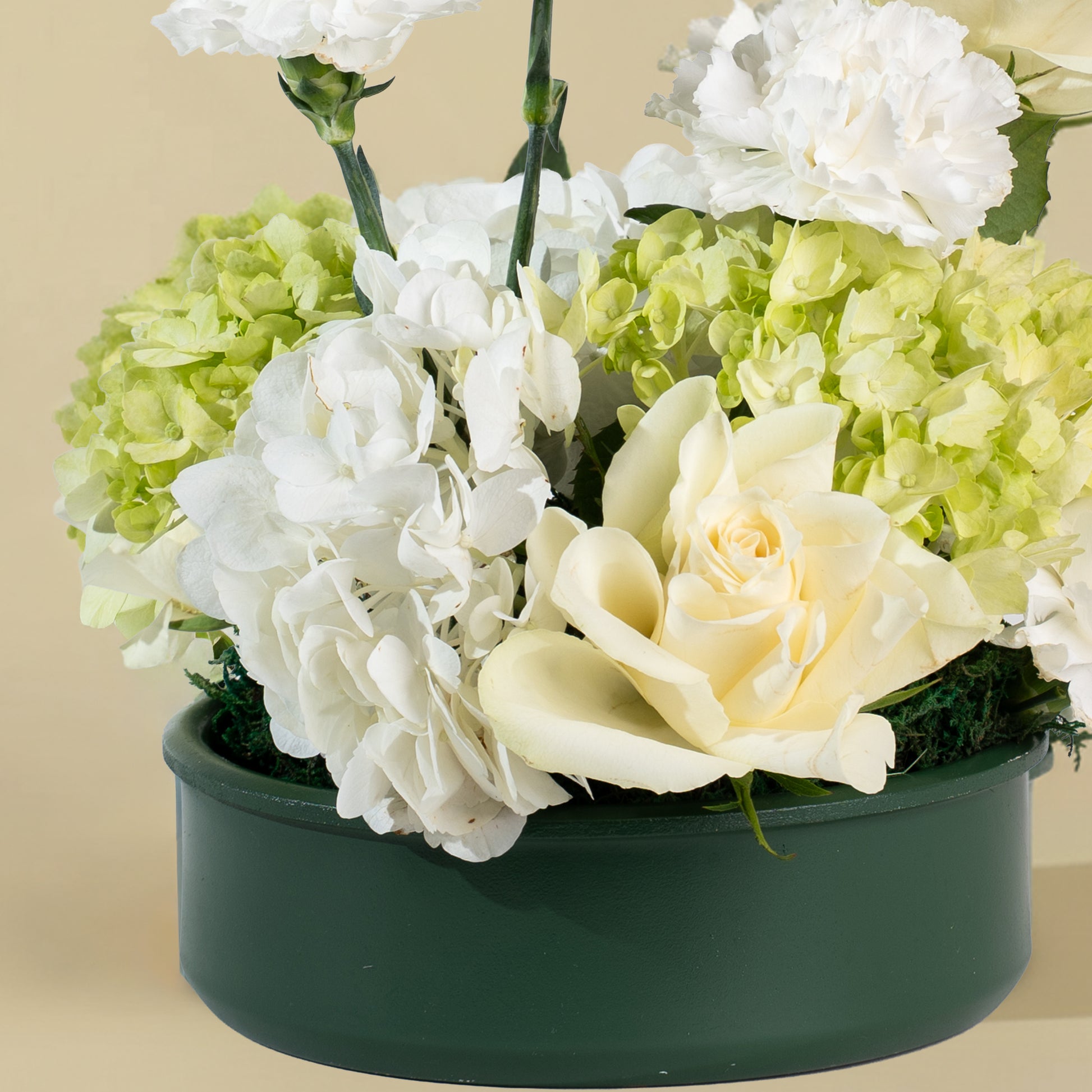 A vision of serenity featuring pristine white roses and fluffy carnations nestled among fresh green hydrangeas. Artfully arranged in a low, dark green ceramic bowl, this centerpiece exudes timeless elegance and pure tranquility."