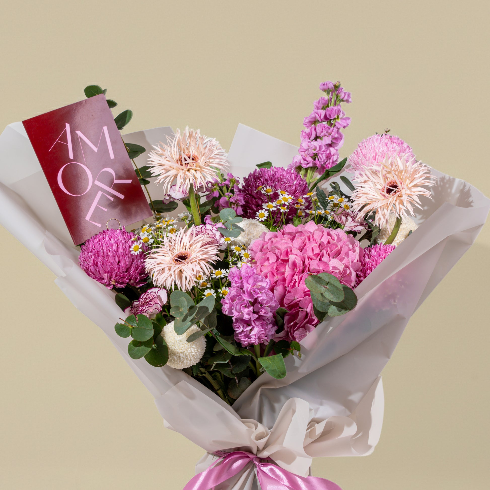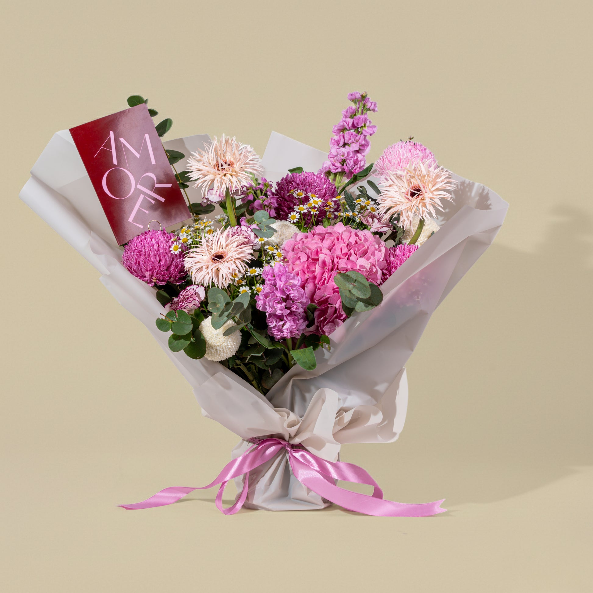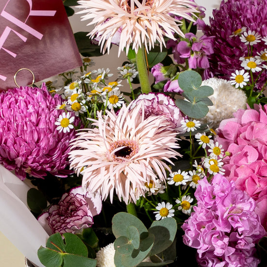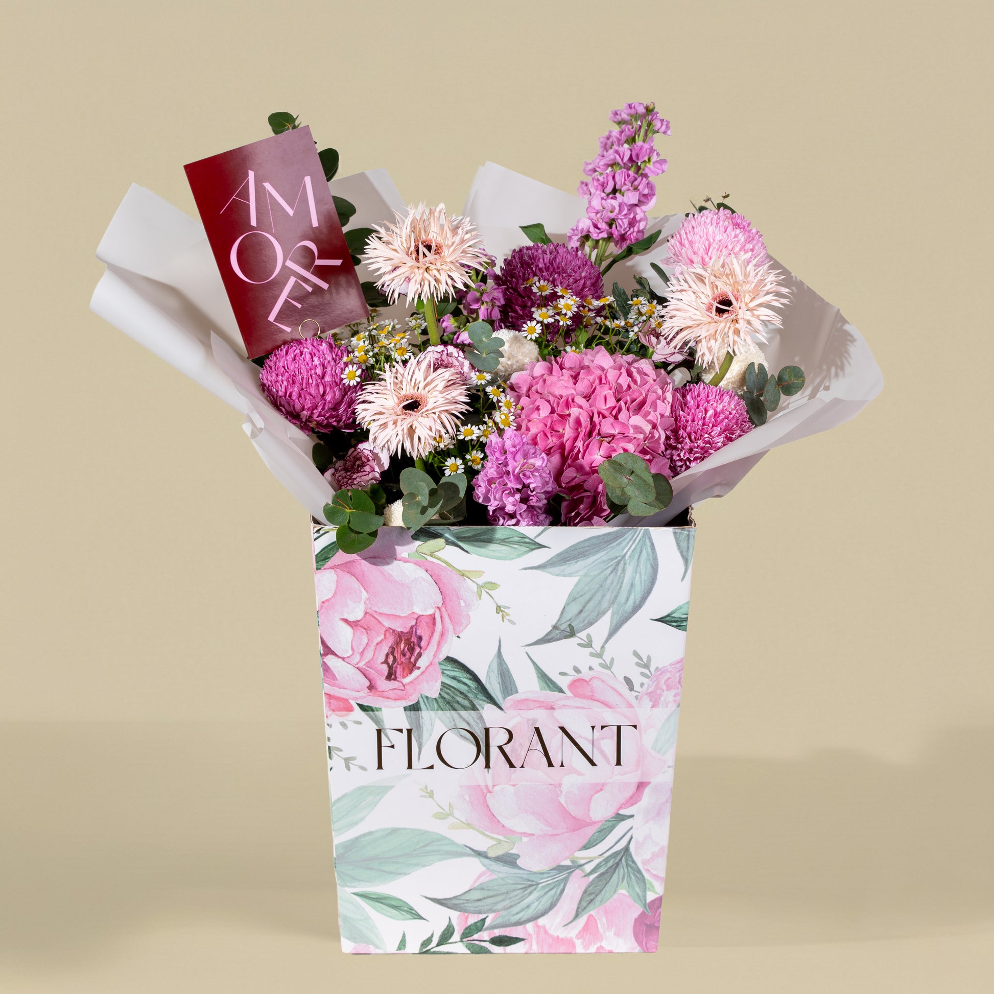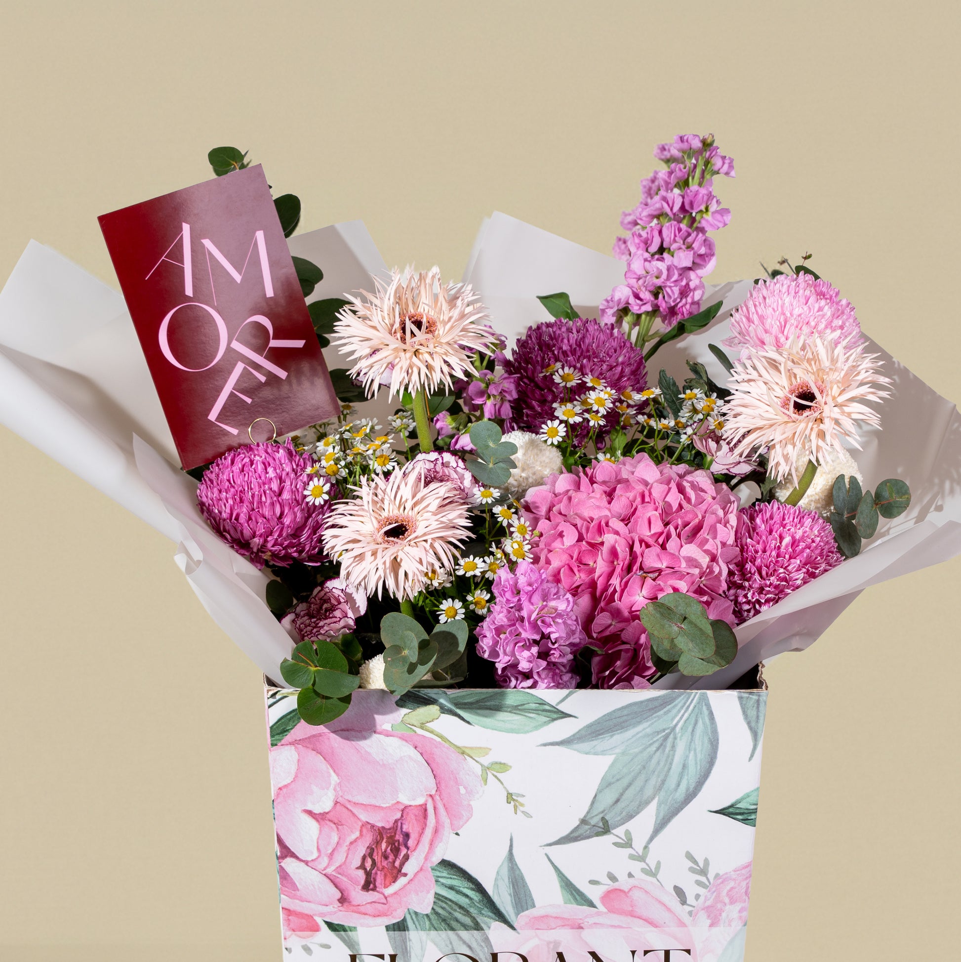 A romantic blend of lush pink Hydrangeas and delicate Gerbera daisies in soft purple tones. Accented with charming chamomile and elegantly presented in our signature "Florant" floral bag, it’s the perfect gift to convey affection and grace.