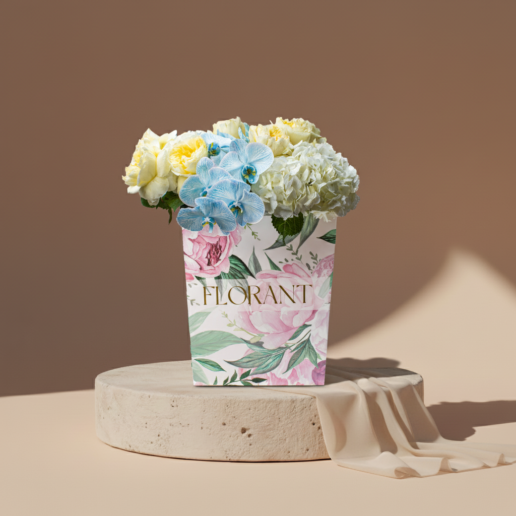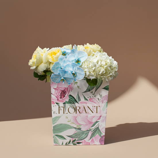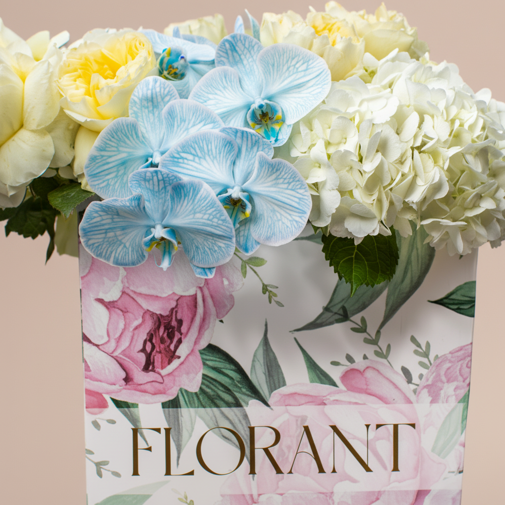 Let tranquility speak for you with this refined arrangement combining creamy white roses and rare blue orchids with soft white hydrangea. Each flower is carefully chosen to tell a story of serenity and distinction. Yellow baby roses add subtle warmth that completes the quiet elegance. This arrangement understands the language of those who appreciate beauty without noise.