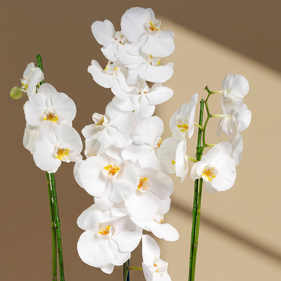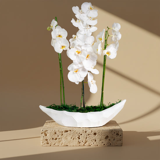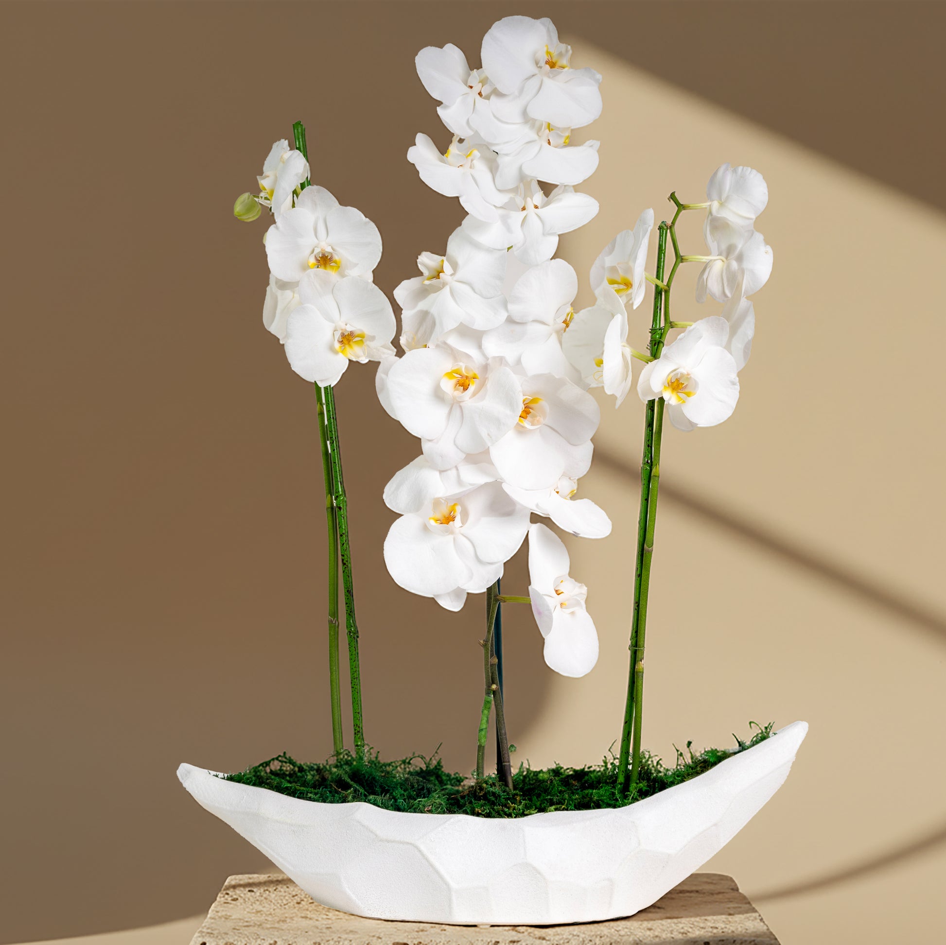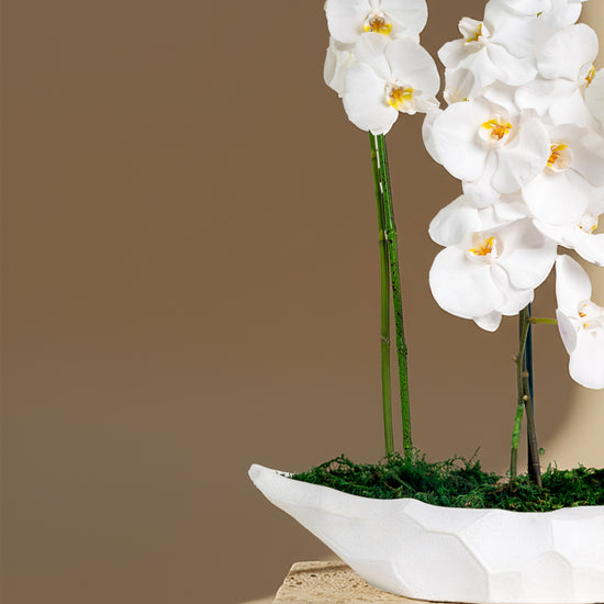 Elegant white orchid stems in a sophisticated ceramic planter. Timeless luxury and pure sophistication .