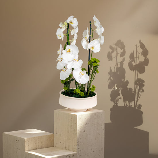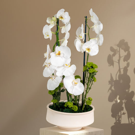 Royal white orchid in modern arrangement - symbol of elegance and luxury. Timeless beauty that lasts long in every detail.