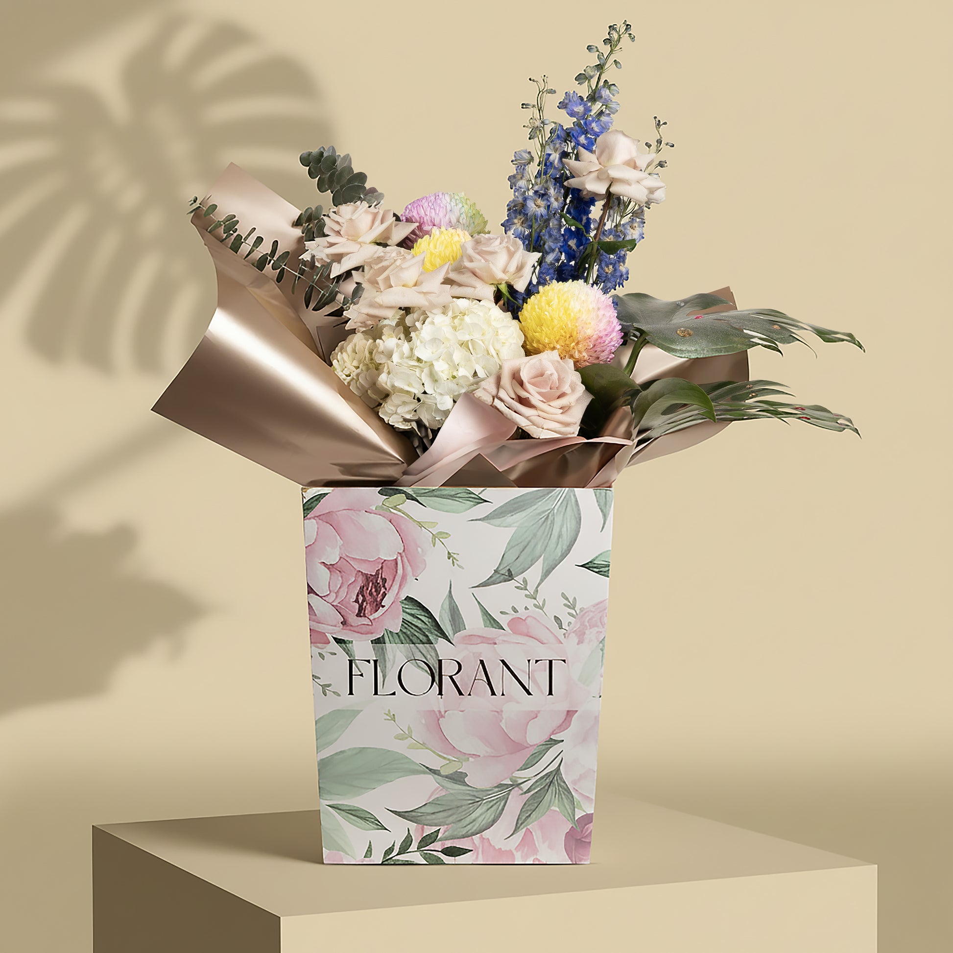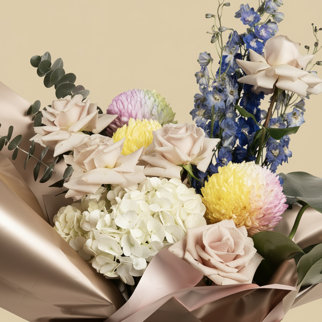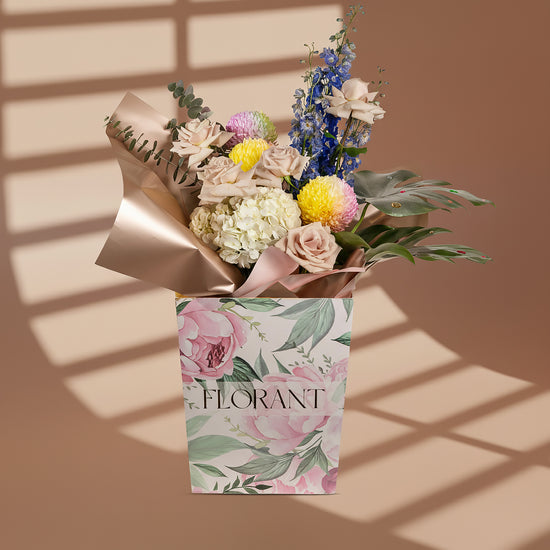 Creamy pink roses paired with blue delphinium and white hydrangea, arranged with gradient disbud chrysanthemums and aromatic eucalyptus. Each flower is carefully selected to complement the others and create an attractive, balanced look.