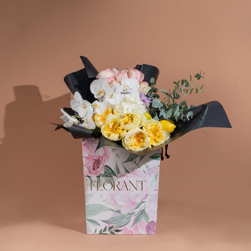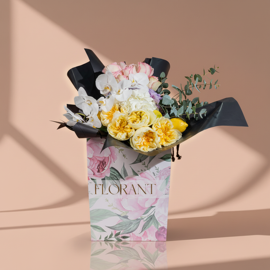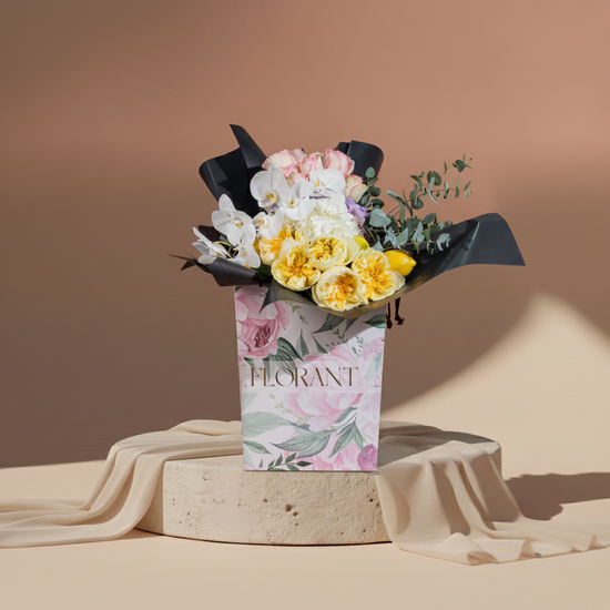 Yellow is optimism's color, white is beginnings' color. Add natural lemon and modern black wrapping, and you get an arrangement saying "start your day with a smile." O'hara roses and orchids unite in celebration of all that's bright and beautiful. For the positive person who spreads beautiful energy wherever they go.
