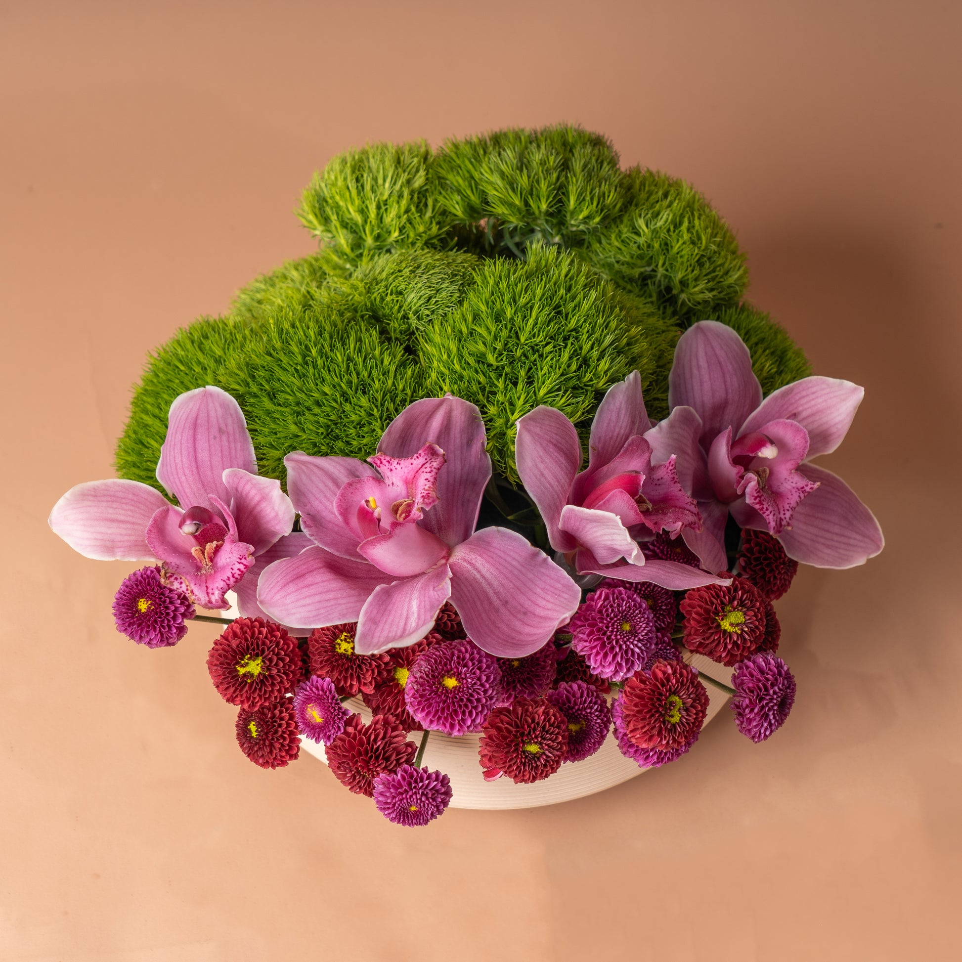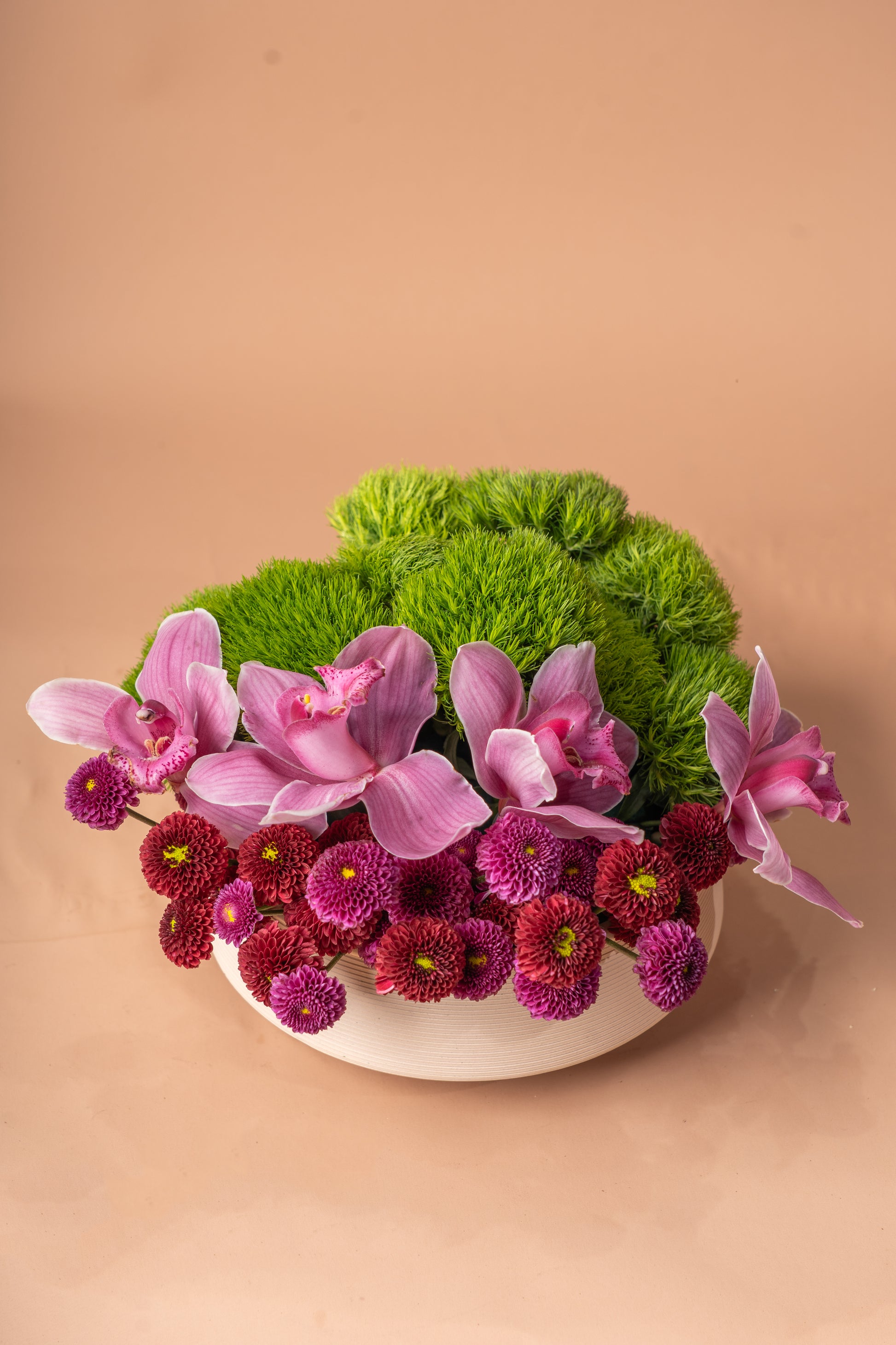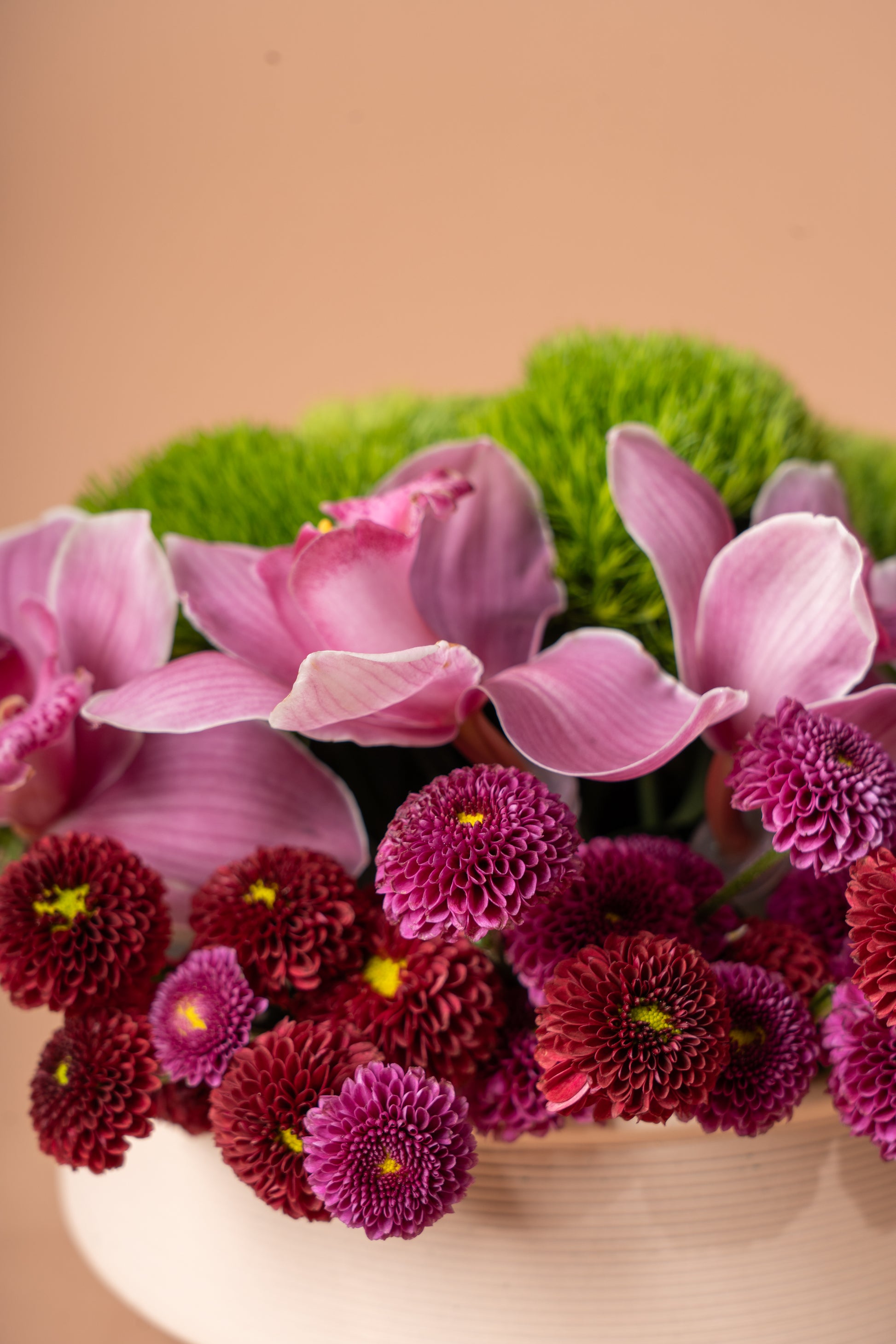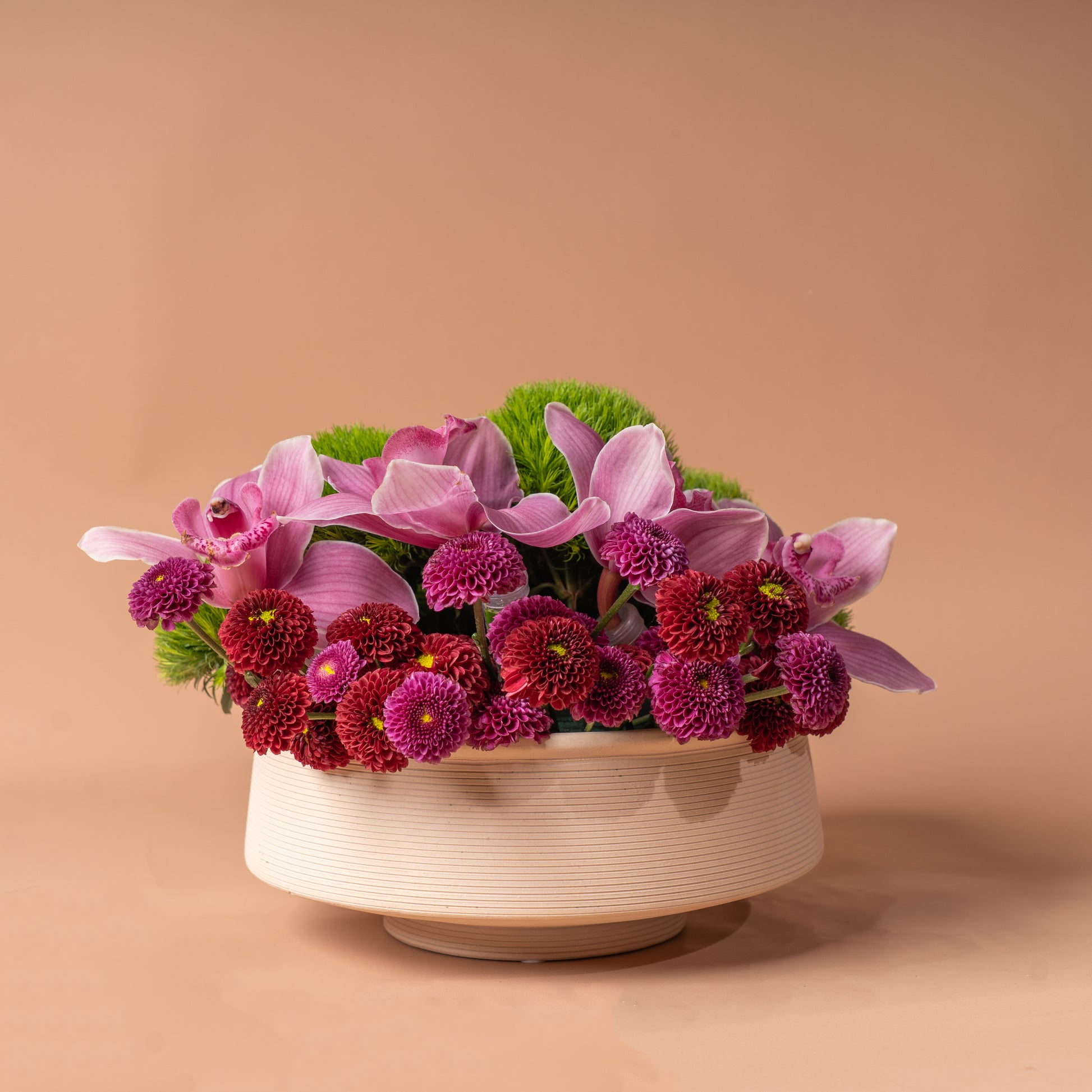 An elegant and vibrant floral arrangement featuring luxurious pink orchids, rich purple and red chrysanthemums, and a refreshing touch of lush greenery. Perfect for expressing love, gratitude, or simply adding a refined touch of beauty to any space.