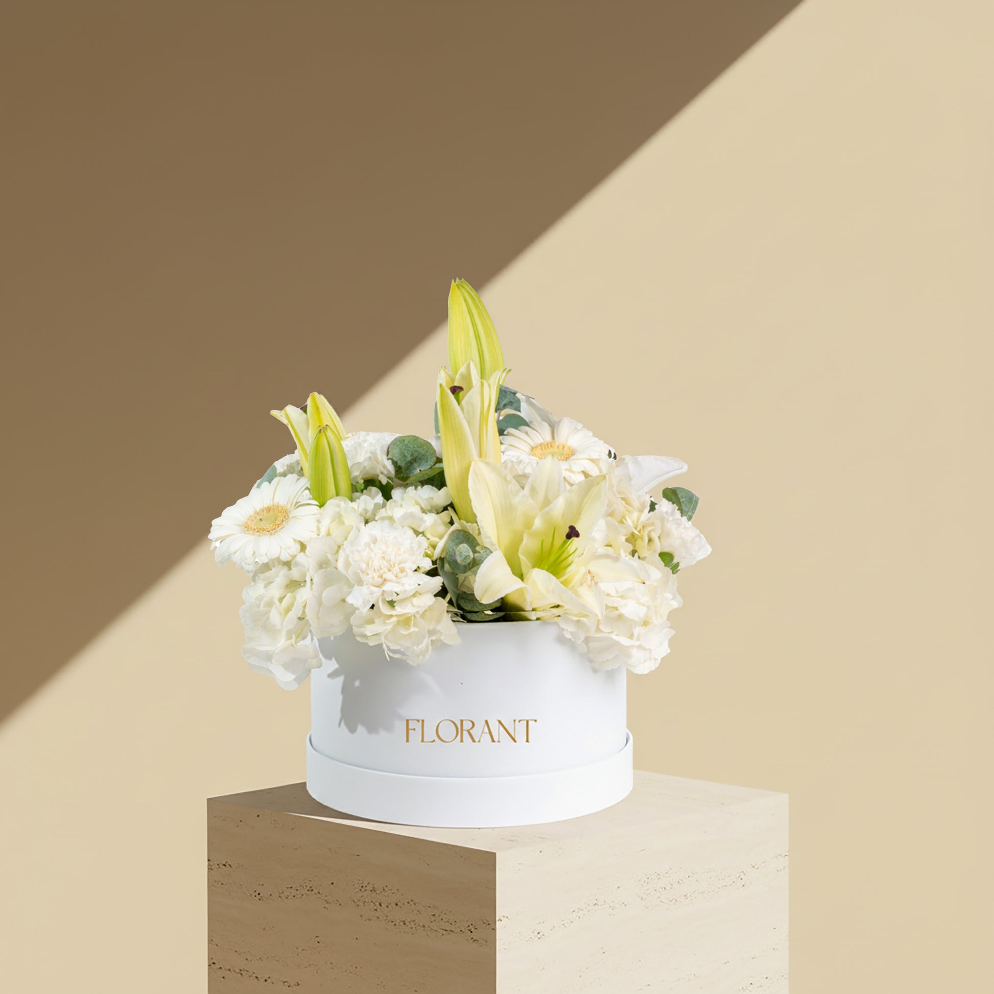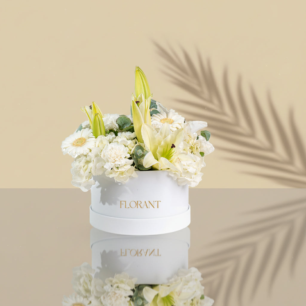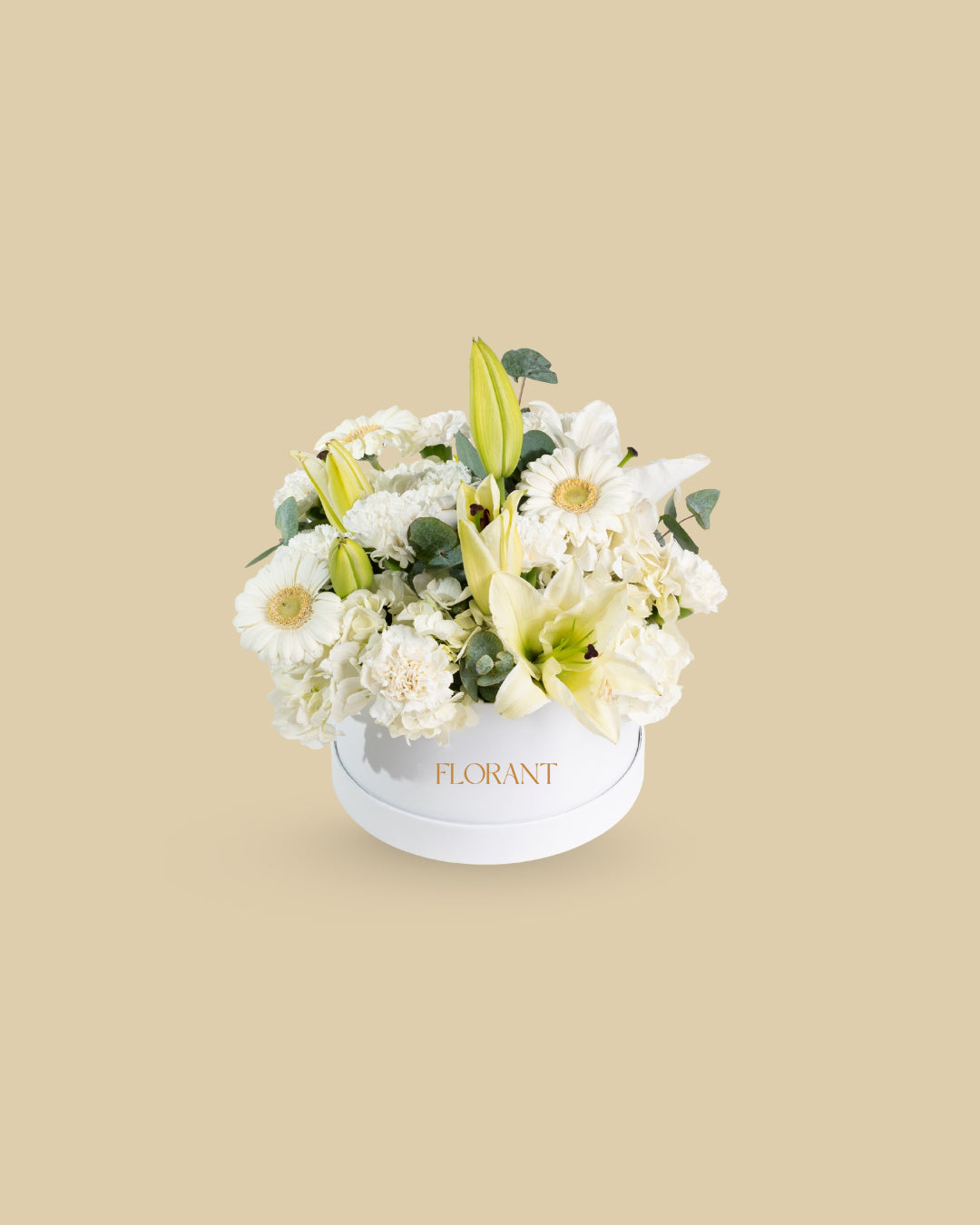 White lilies with white gerberas, white carnations and eucalyptus. A pure all-white arrangement that expresses clarity and peace.