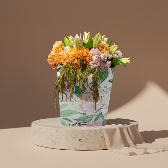 Strength with softness, boldness with tenderness. Orange hydrangea stands confidently beside soft pink lilies, and amaranthus cascades like a golden curtain. Baby and spray roses fill every space with love. This bouquet is for the strong person with a tender heart, the bold one who knows the value of kindness.