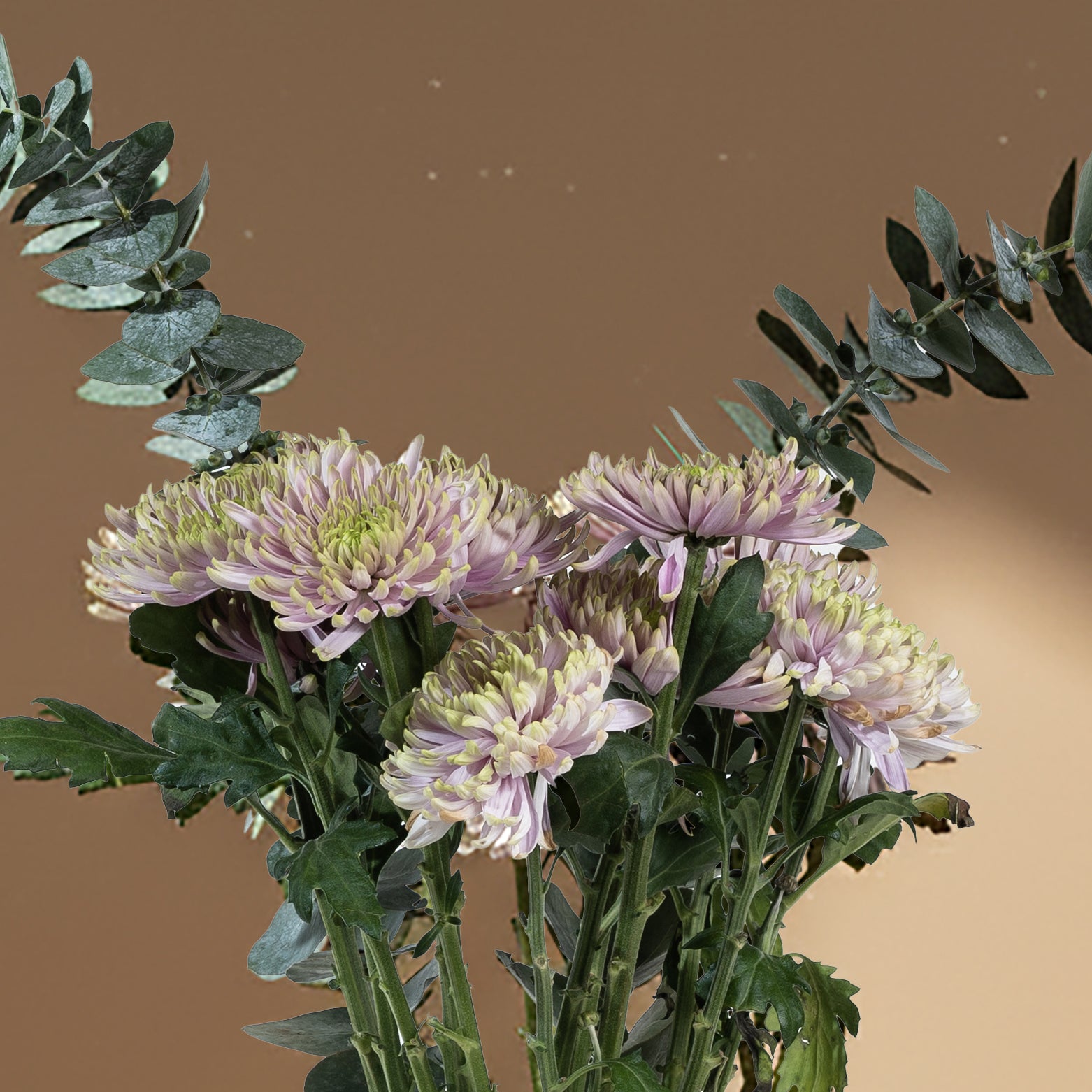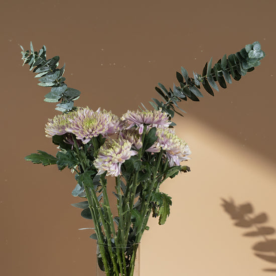 Chrysanthemums in soft purple and pink tones with green eucalyptus branches in an elegant glass vase. A modern arrangement combining delicacy and naturalism to add tranquility and natural beauty to your space.