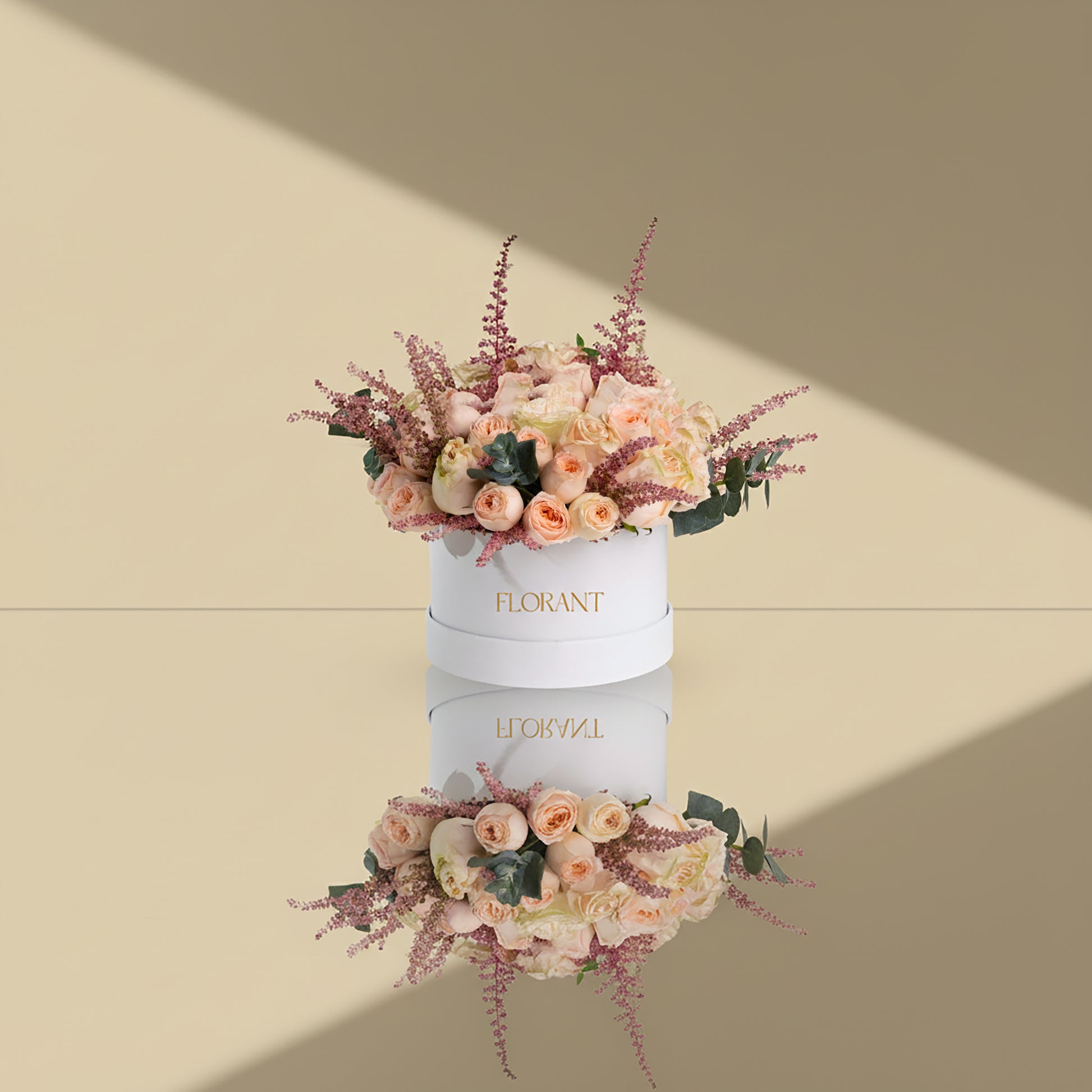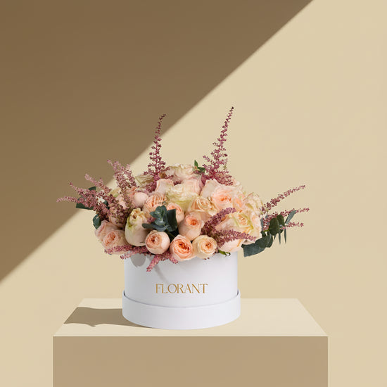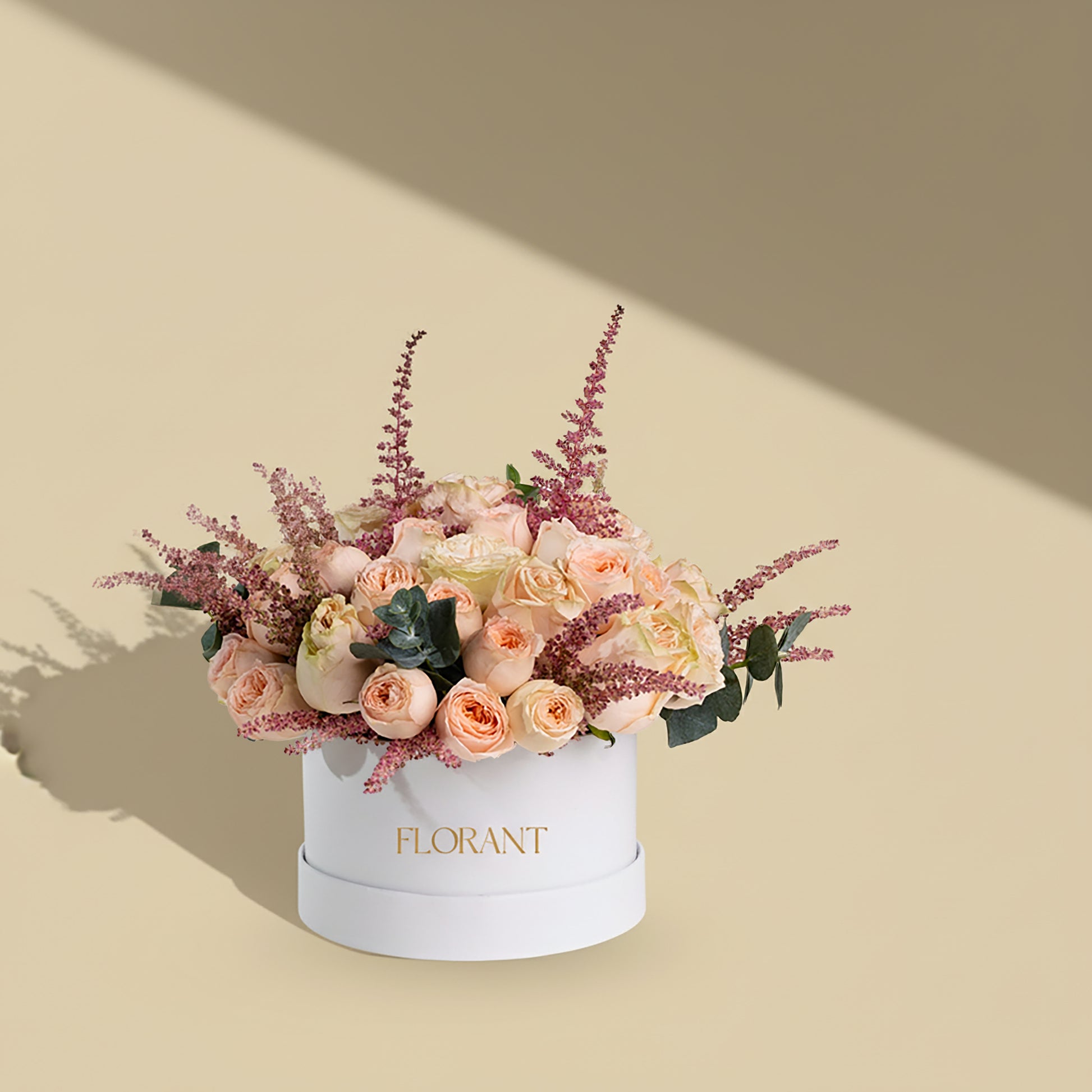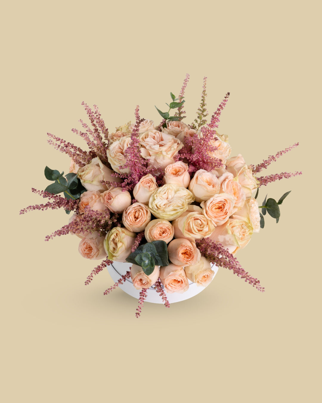 Peach and beige roses with pink astilbe and eucalyptus. A romantic arrangement in calm colors that combines softness with warmth.
